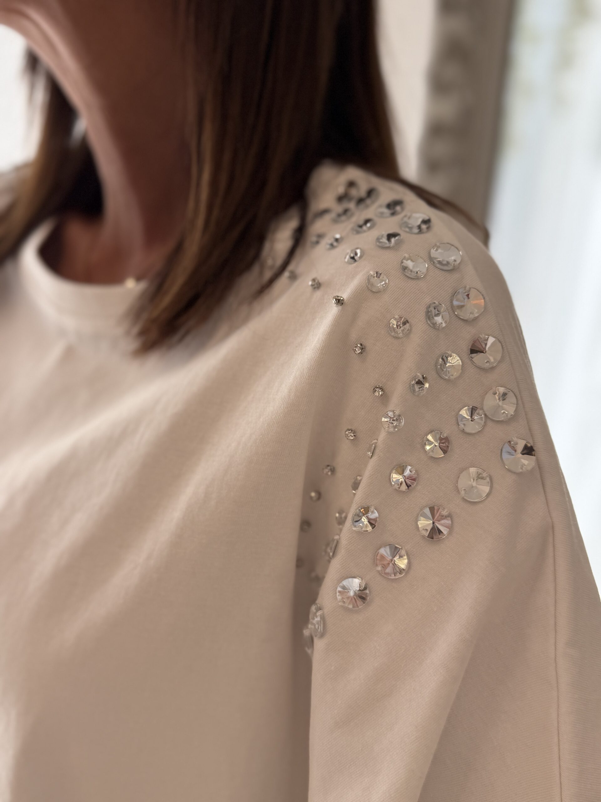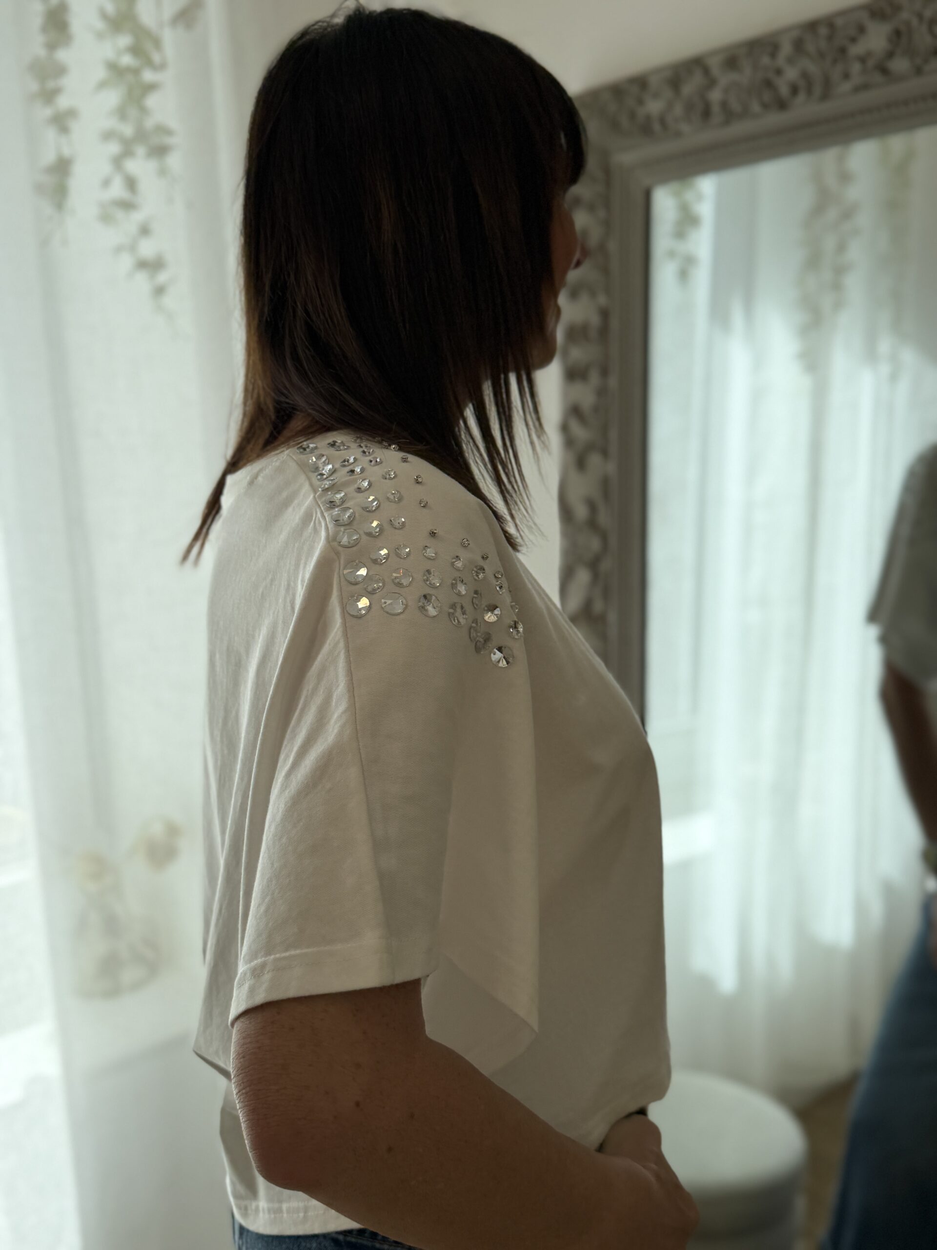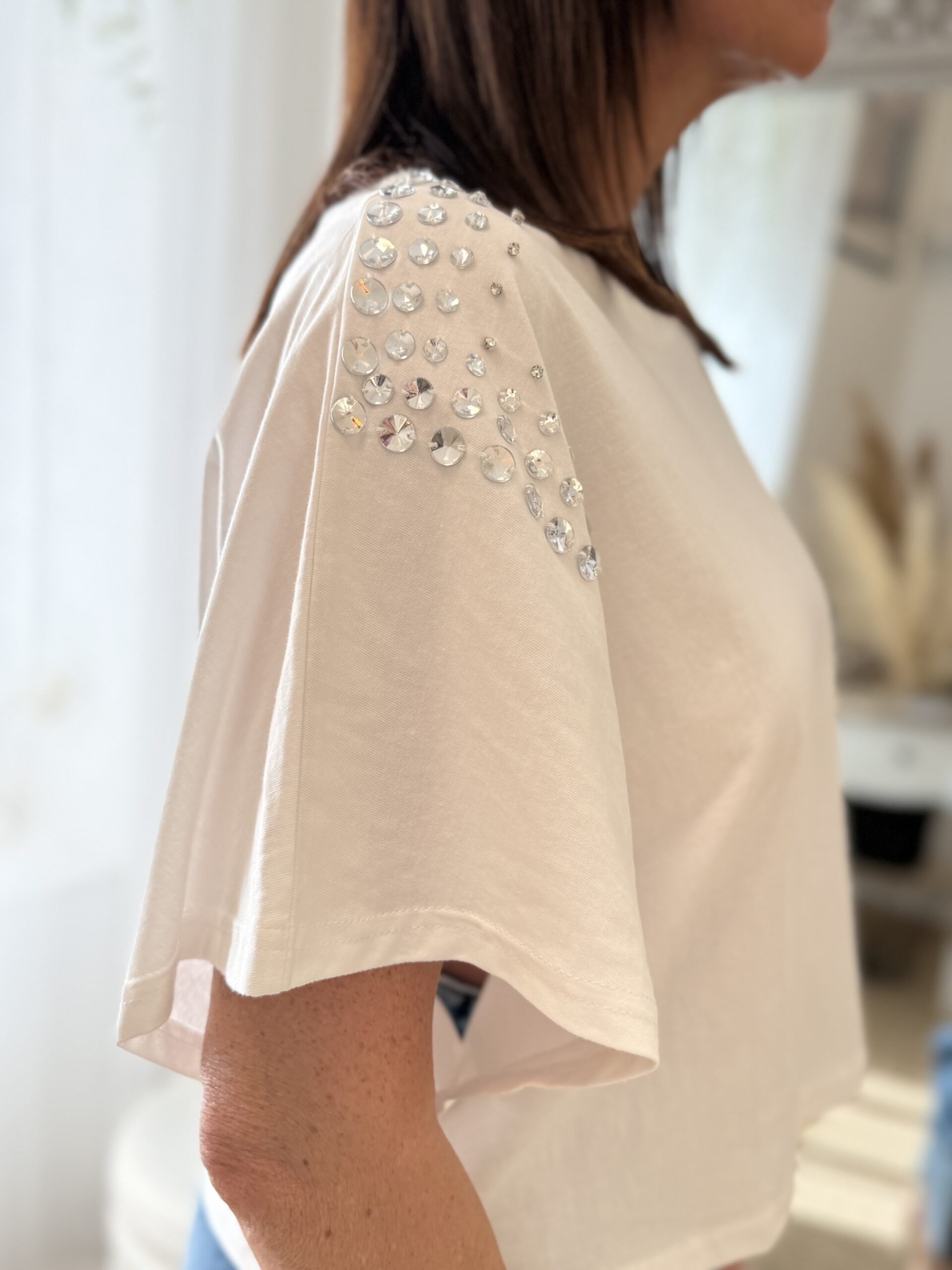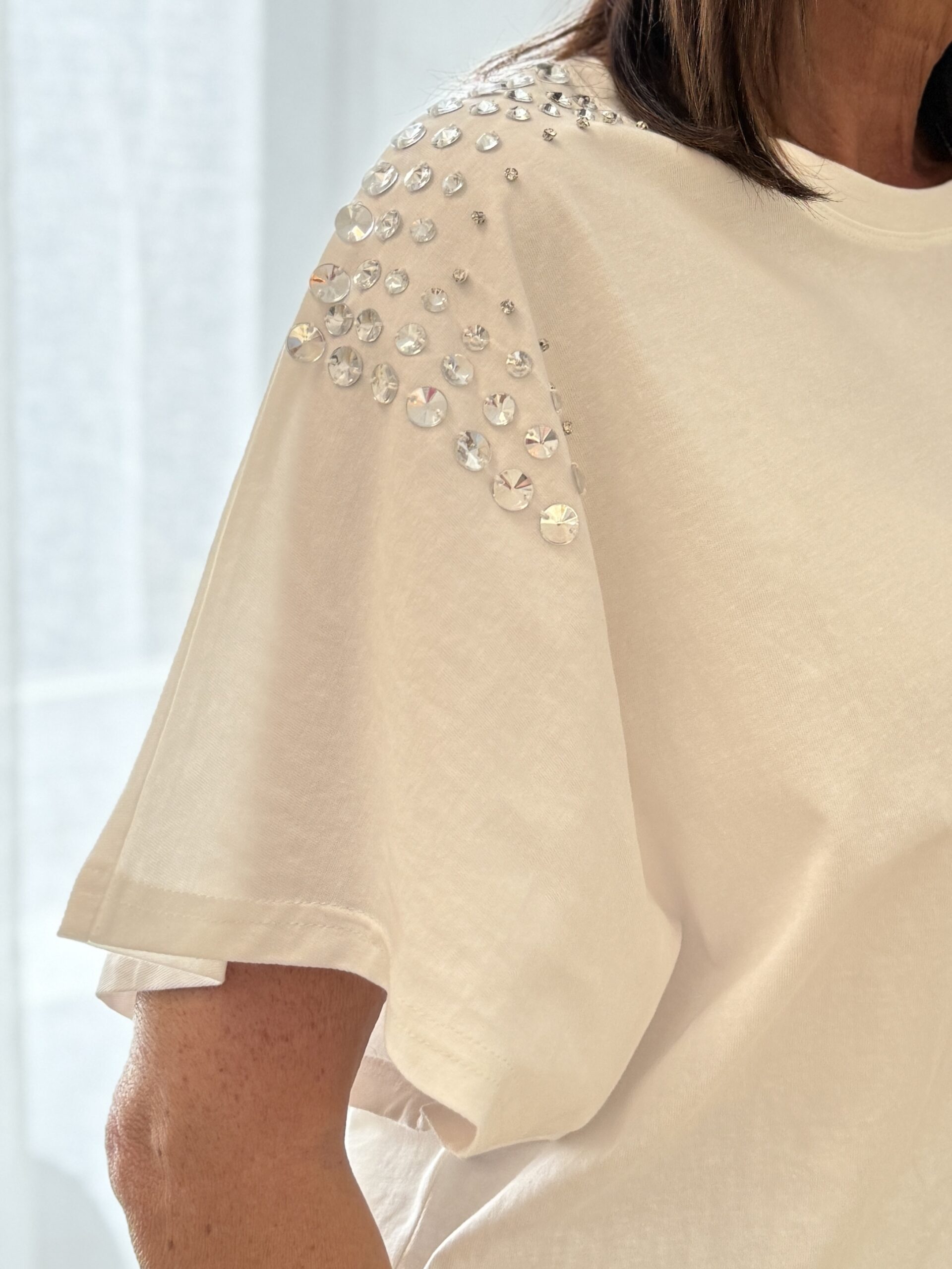 T-shirt blanc revisité avec des strass sur les épaules pour une touche chic et lumineuse.Sa cupe ample et ses manche larges en font une pièce confortable et tendance