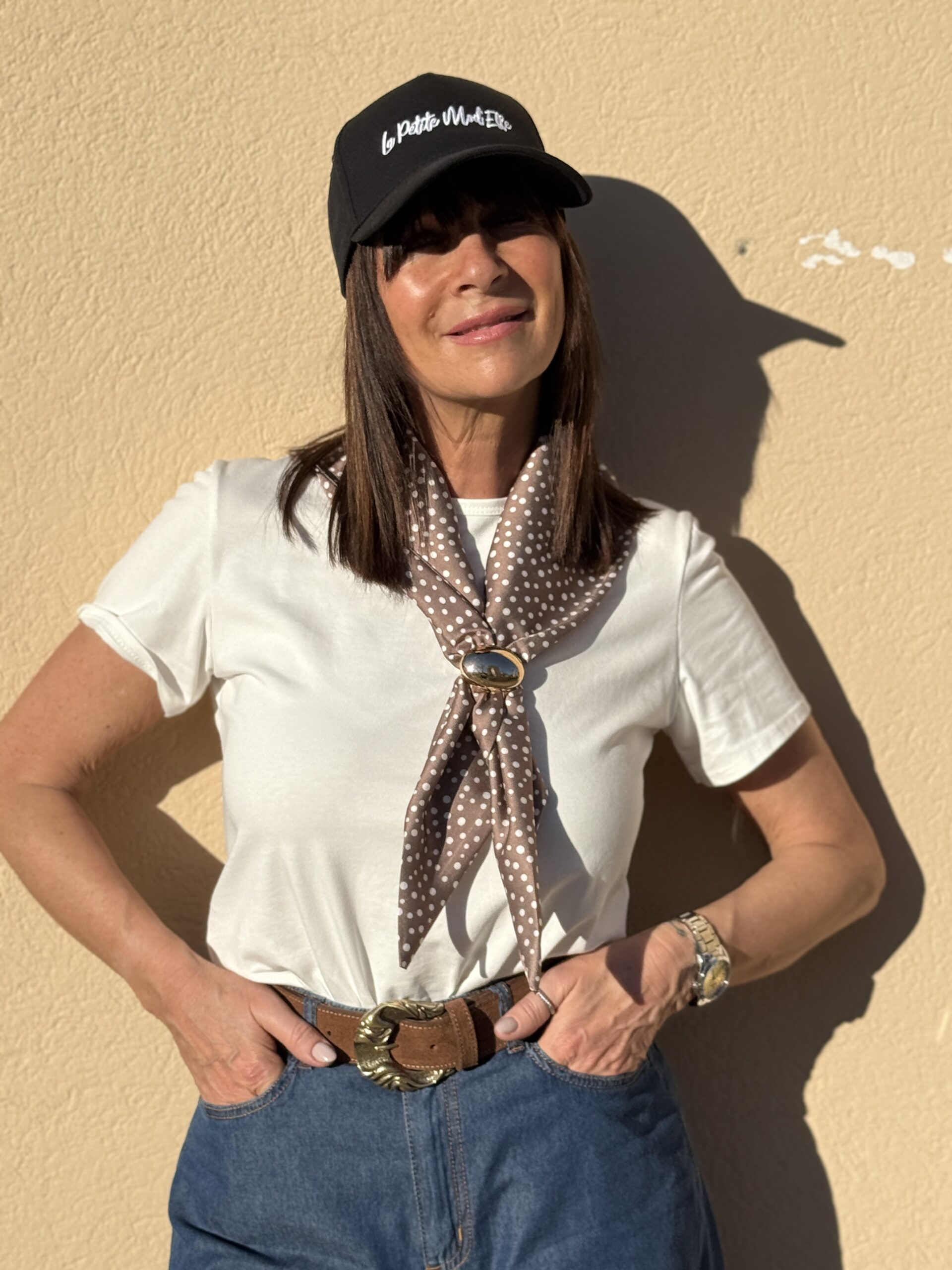 T-shirt blanc revisité avec un détail élégant, un col foulard amovible avec bijou doré contrastant à pois. Une pièce minimaliste et raffinée qui apporte immédiatement du style à une tenue simple. Facile à porter au quotidien, tout en restant originale.