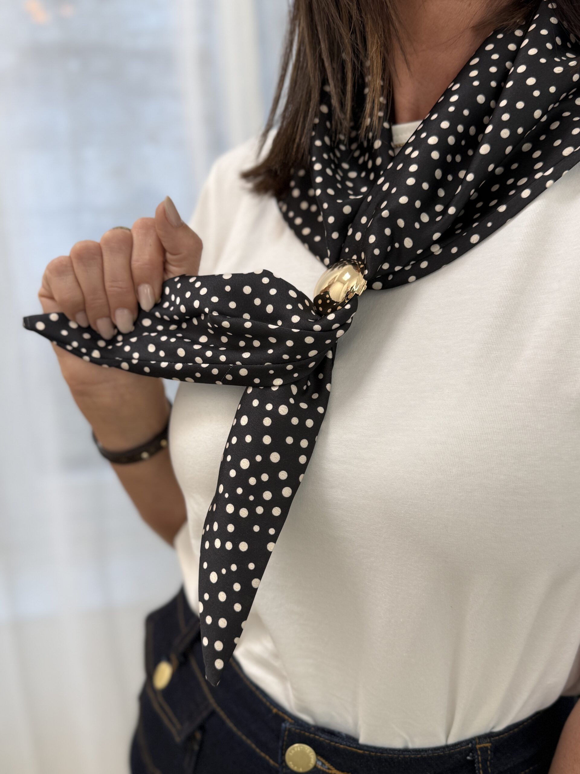 T-shirt blanc revisité avec un détail élégant, un col foulard amovible avec bijou doré contrastant à pois. Une pièce minimaliste et raffinée qui apporte immédiatement du style à une tenue simple. Facile à porter au quotidien, tout en restant originale.
