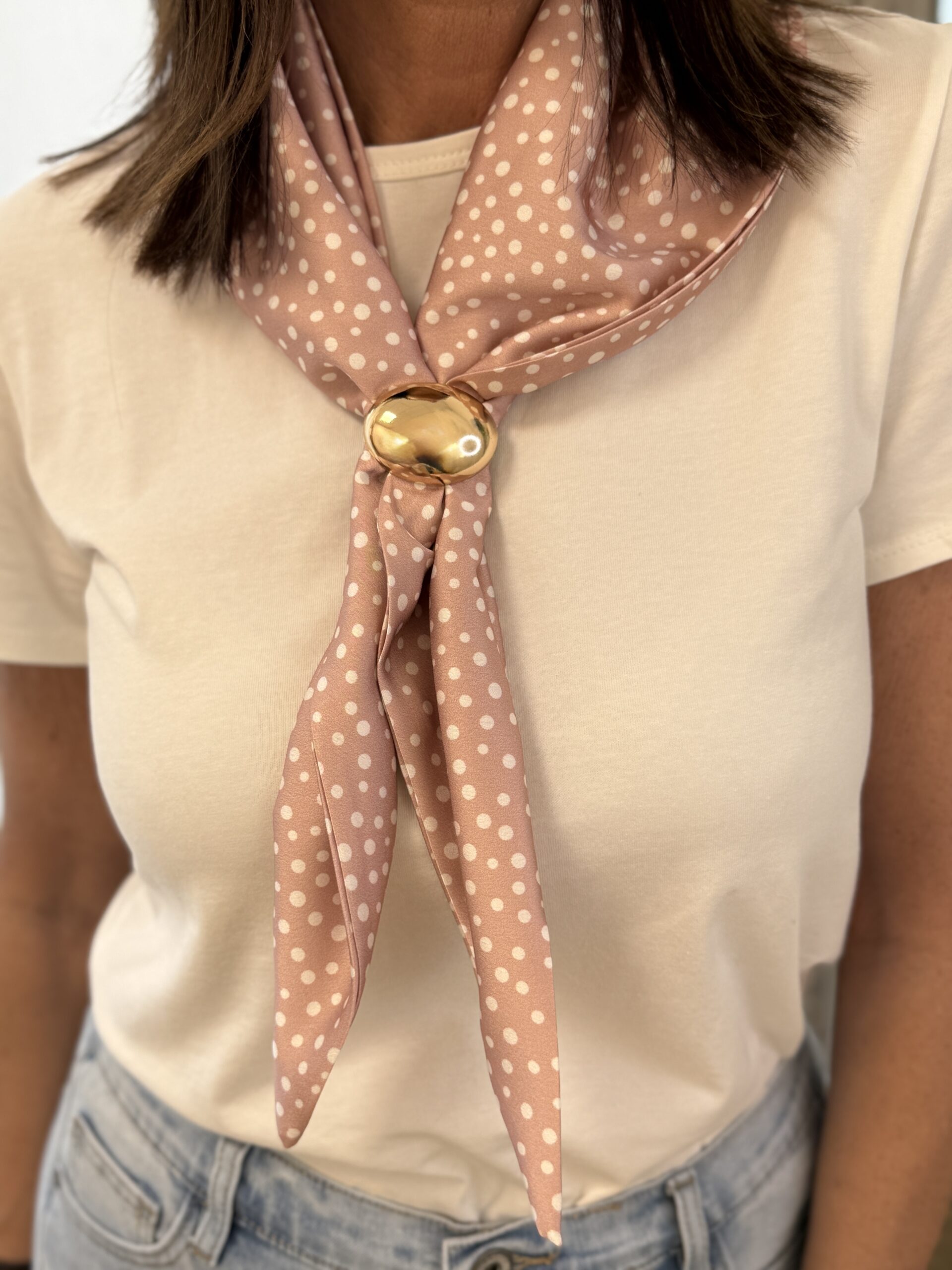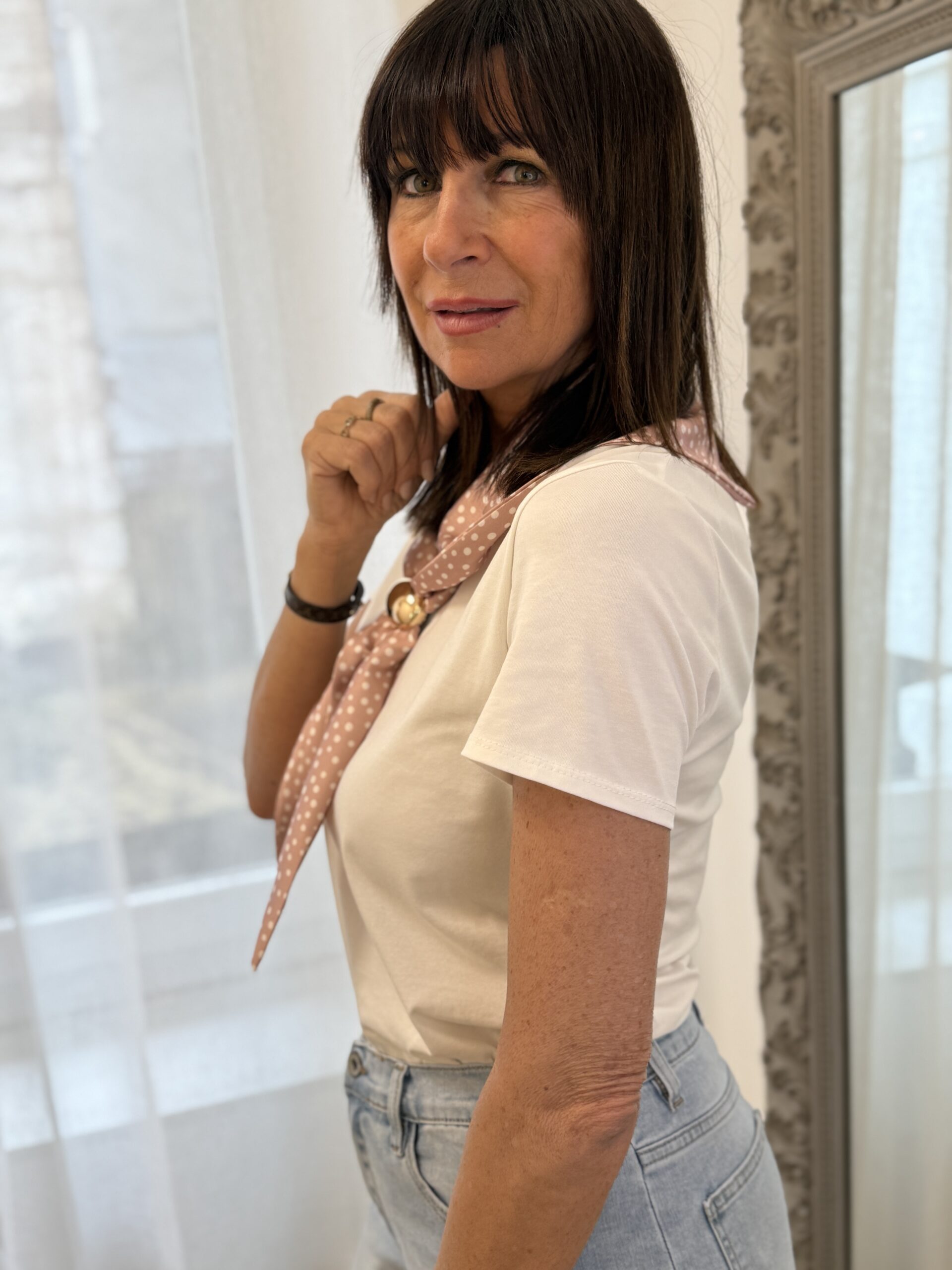T-shirt blanc revisité avec un détail élégant, un col foulard amovible avec bijou doré contrastant à pois. Une pièce minimaliste et raffinée qui apporte immédiatement du style à une tenue simple. Facile à porter au quotidien, tout en restant originale.