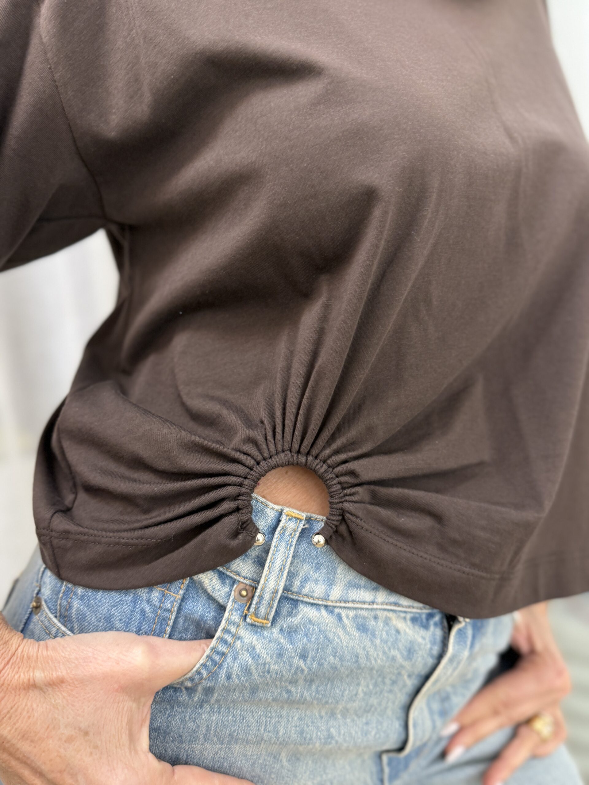 T-shirt choco à la coupe moderne, réhaussé d’un détail anneau sur le côté qui apporte une touche original et féminine.