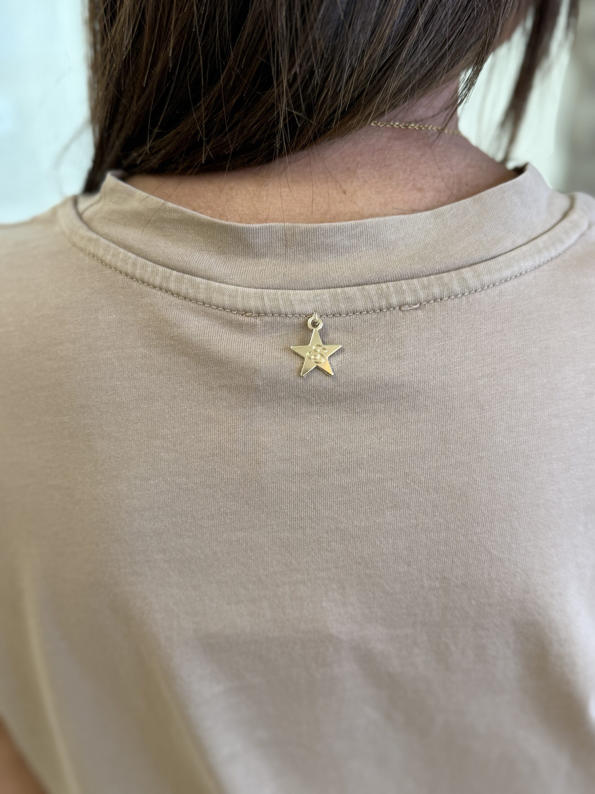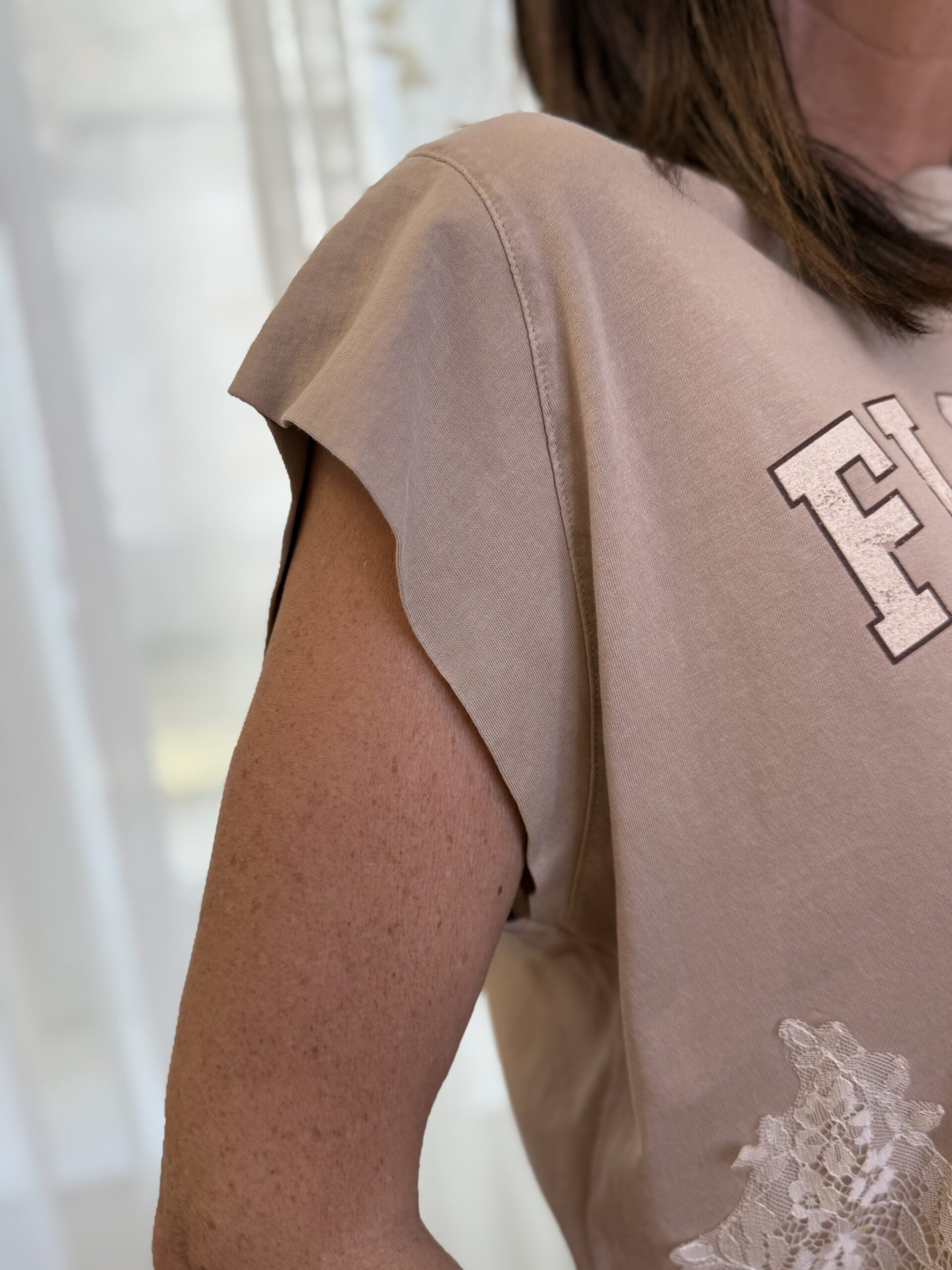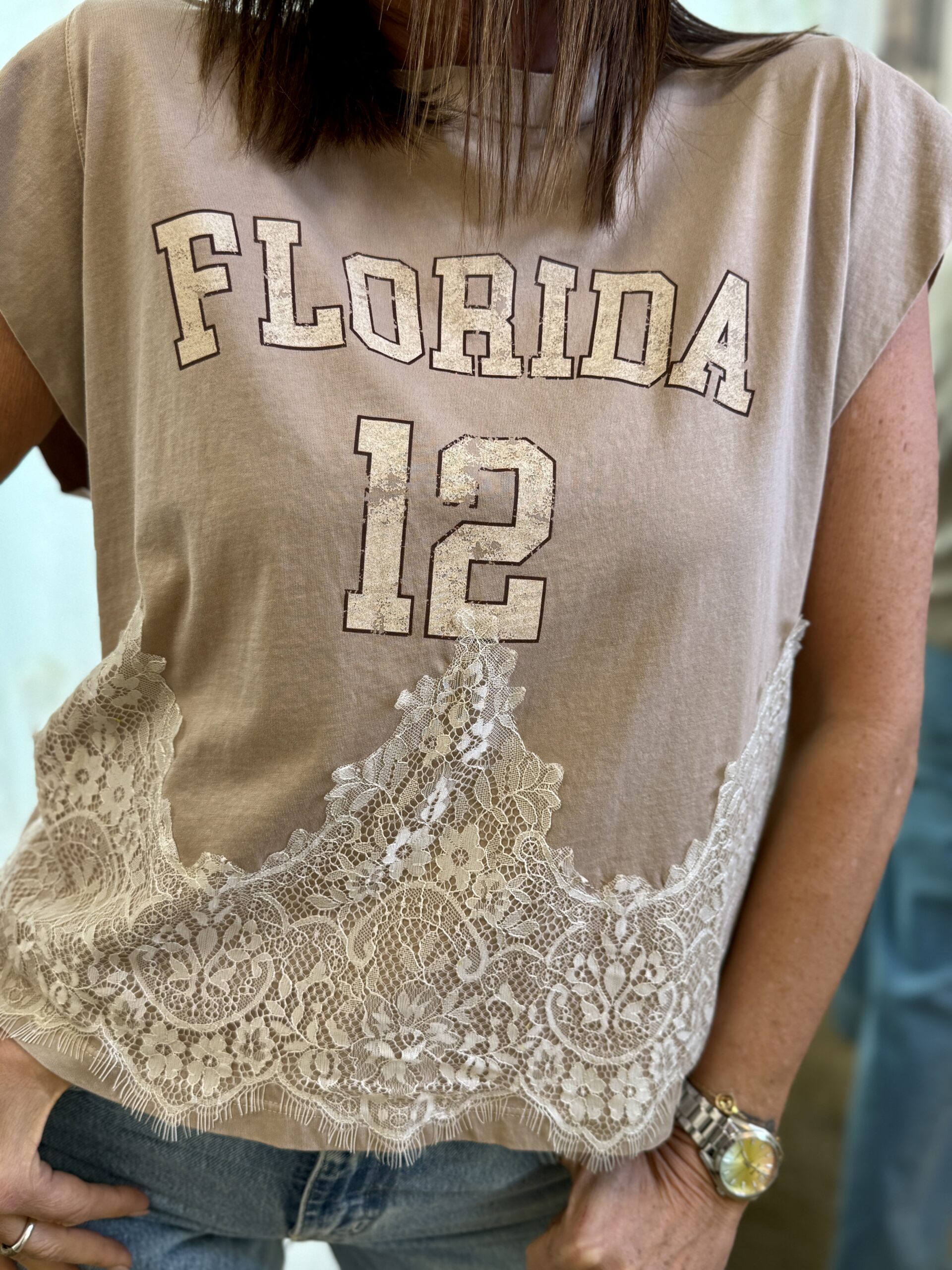 T-shirt beige à manches courtes avec inscription « Florida 12 » sur le devant. Le bas est décoré d’un empiècement en dentelle, qui apporte une touche féminine et original à ce modèle casual.