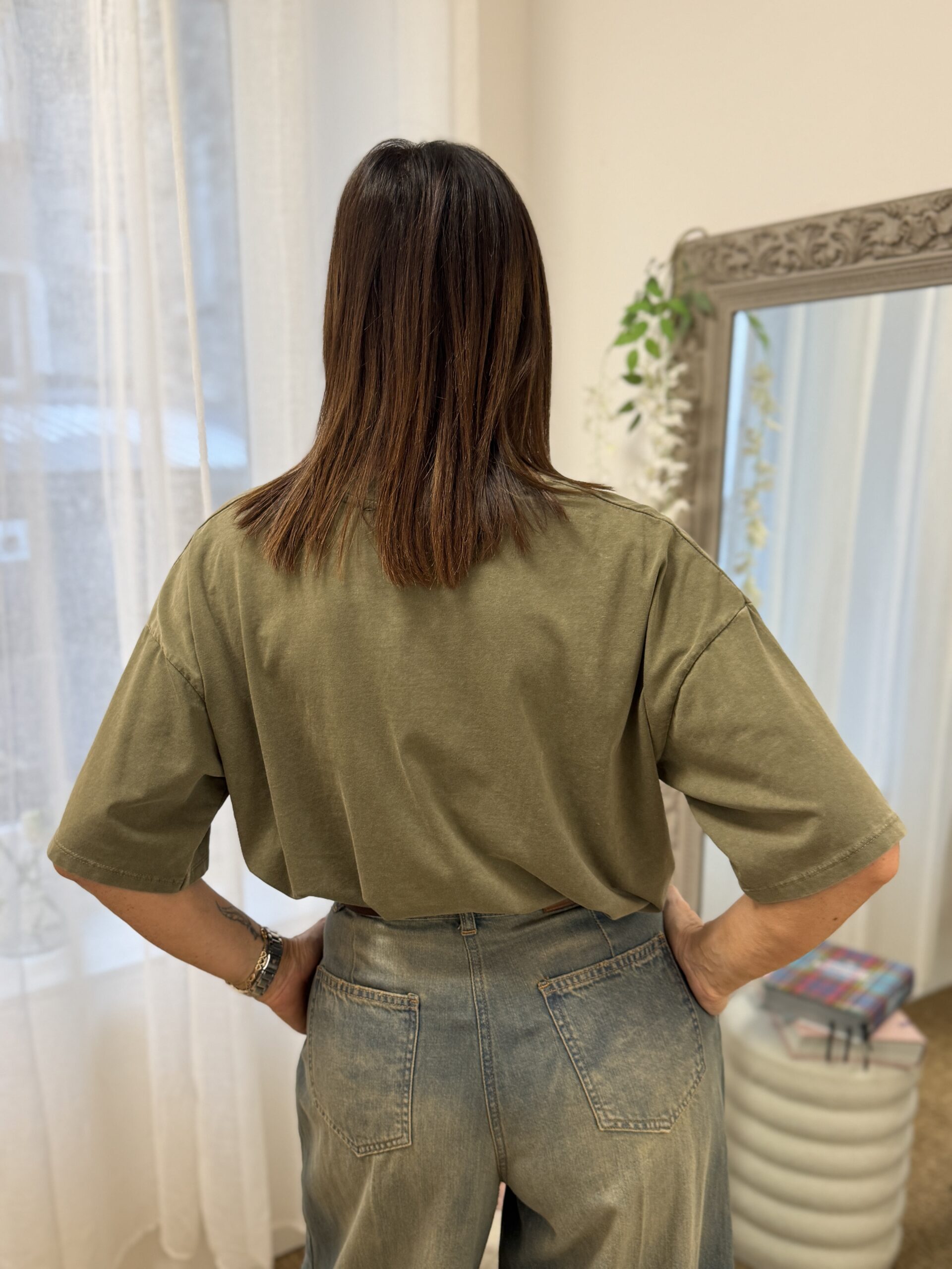 Nathalie mesure 168cm et porte la taille unique (convient du 36 au 40)