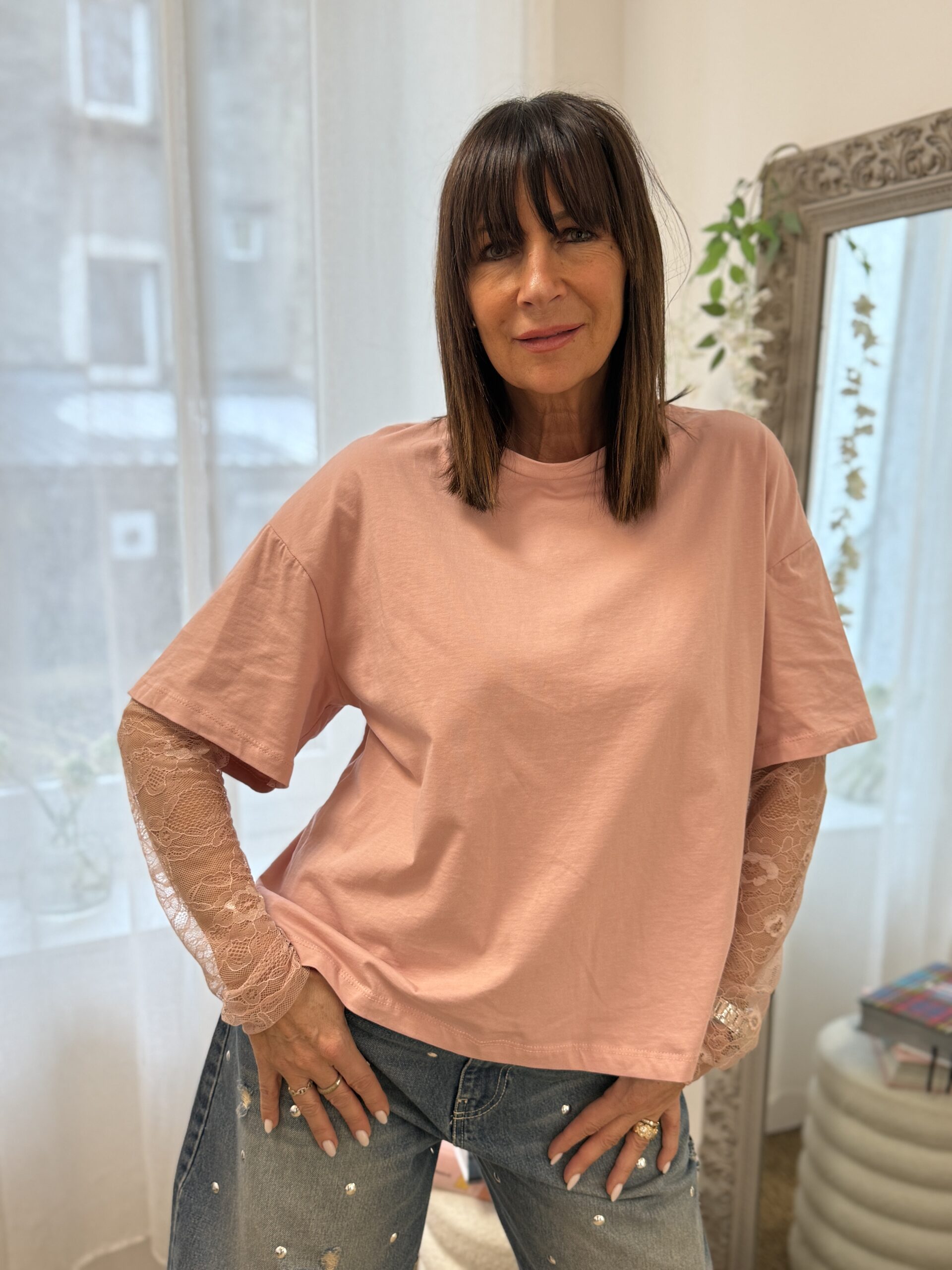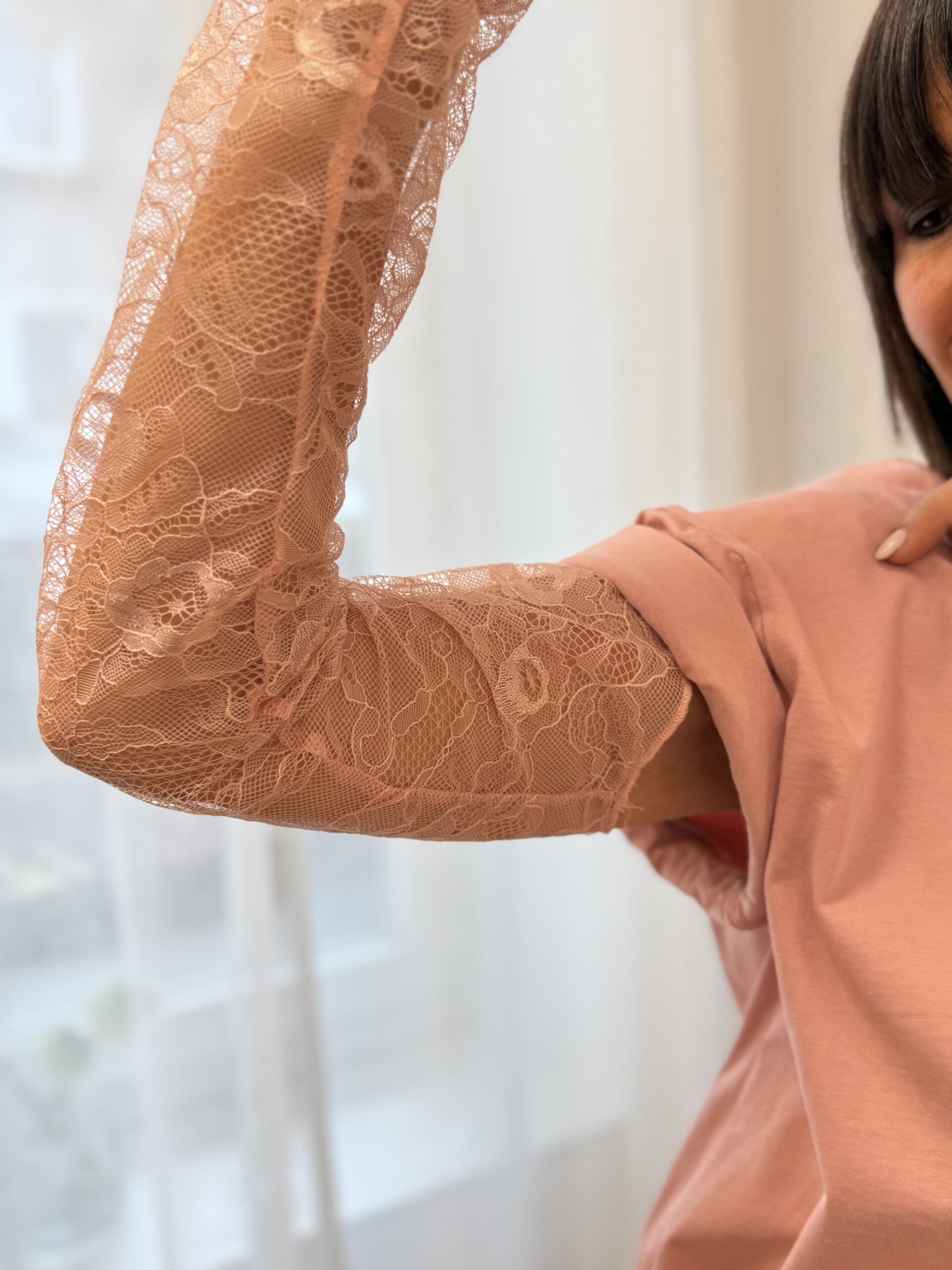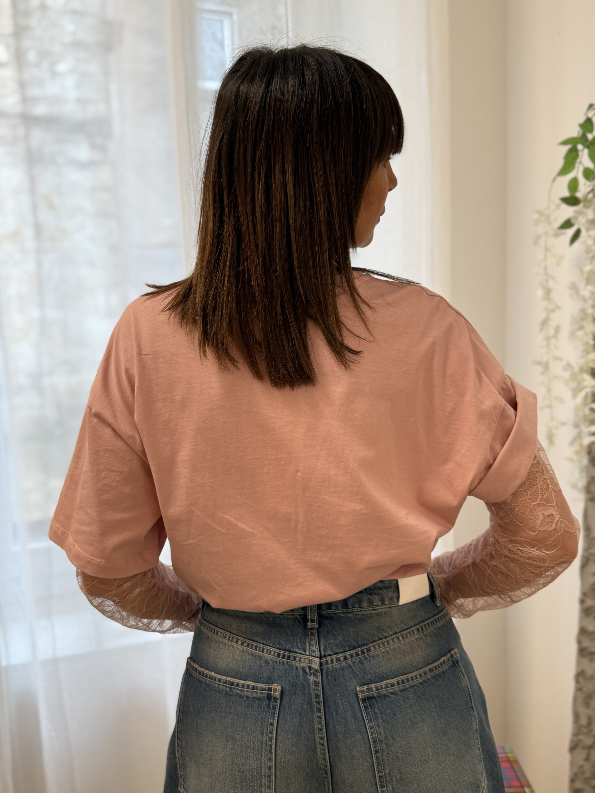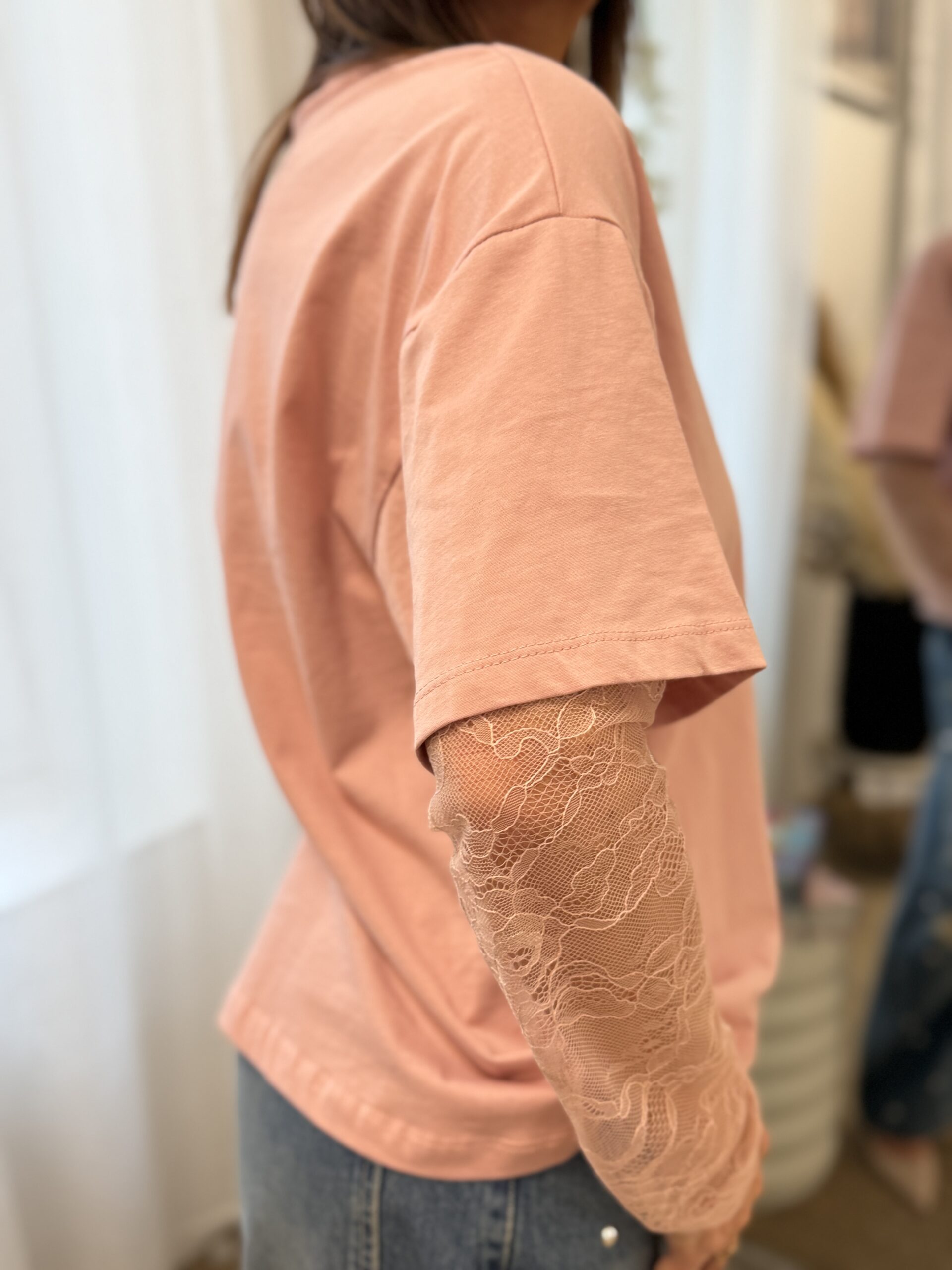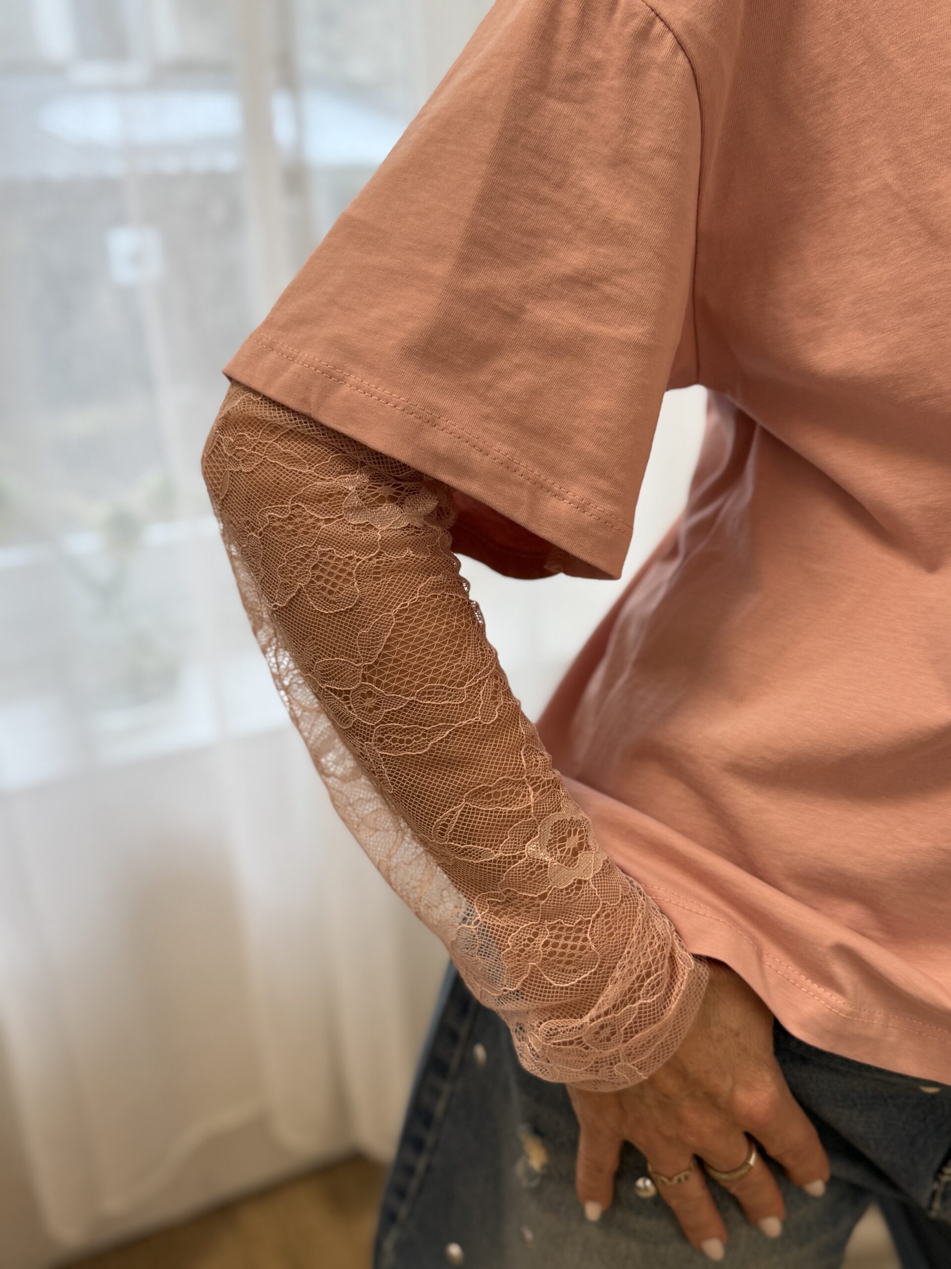 Un basique revisité avec une touche féminine grâce aux manches en dentelle. Parfait pour apporter de la délicatesse à un look chic