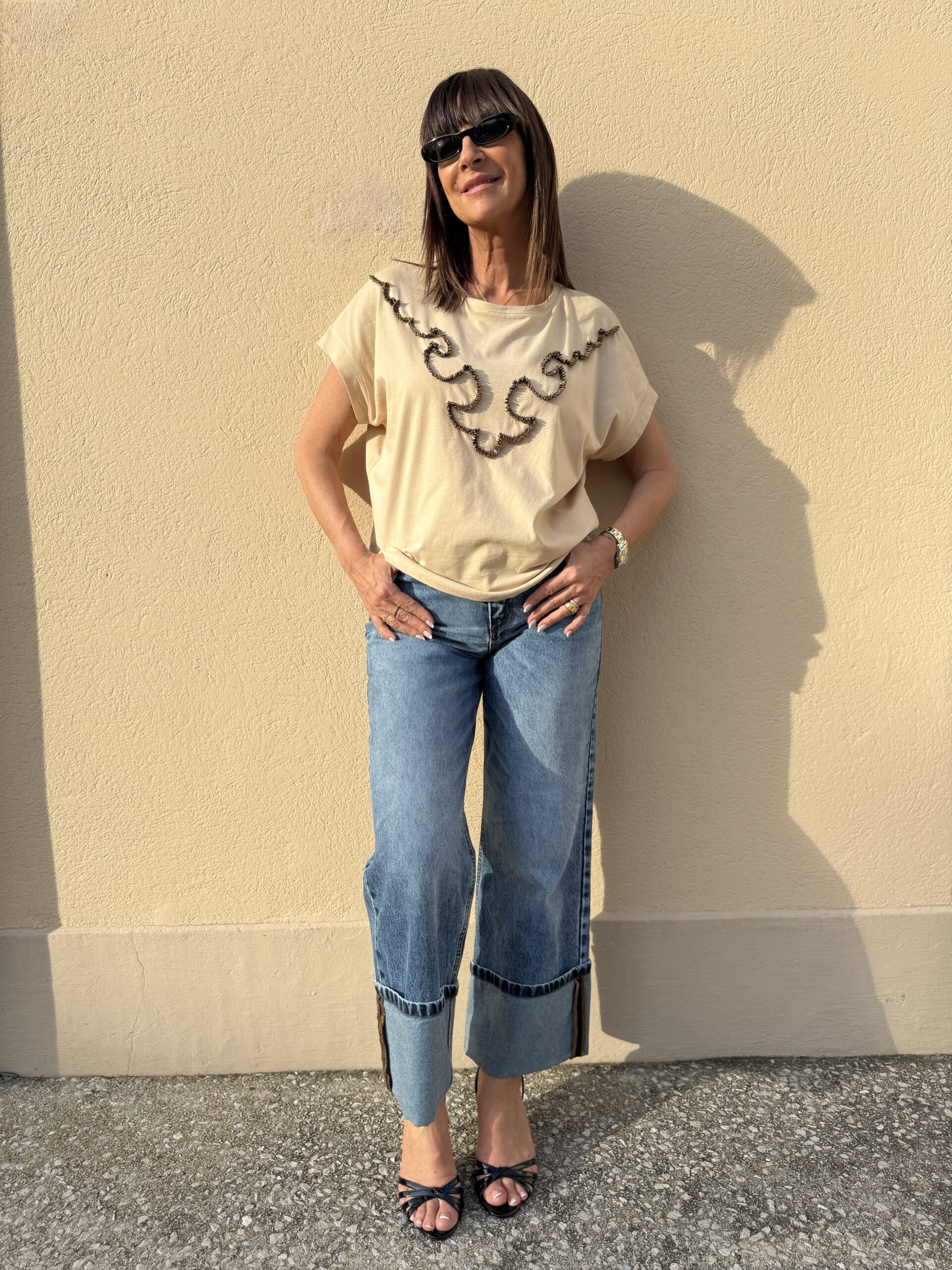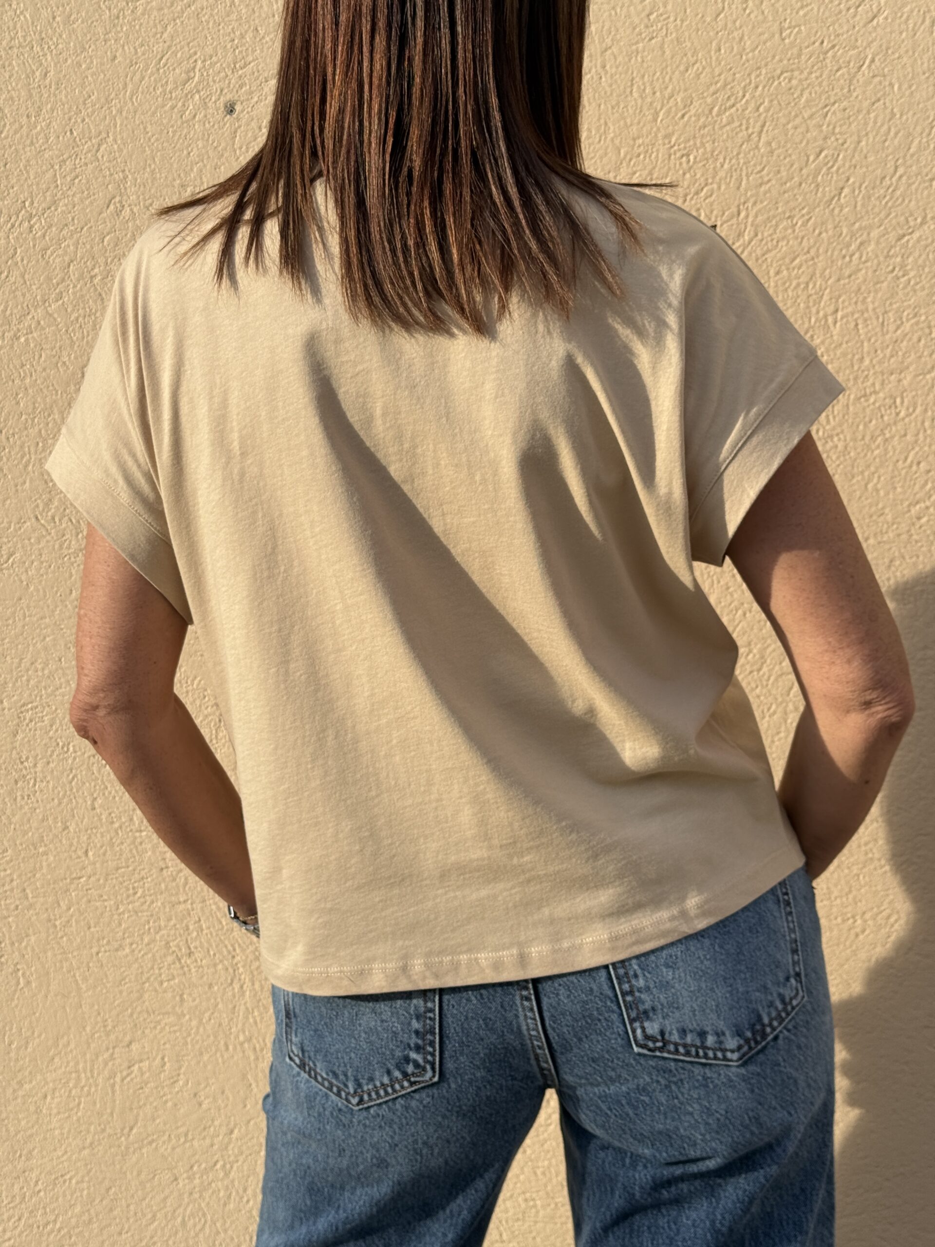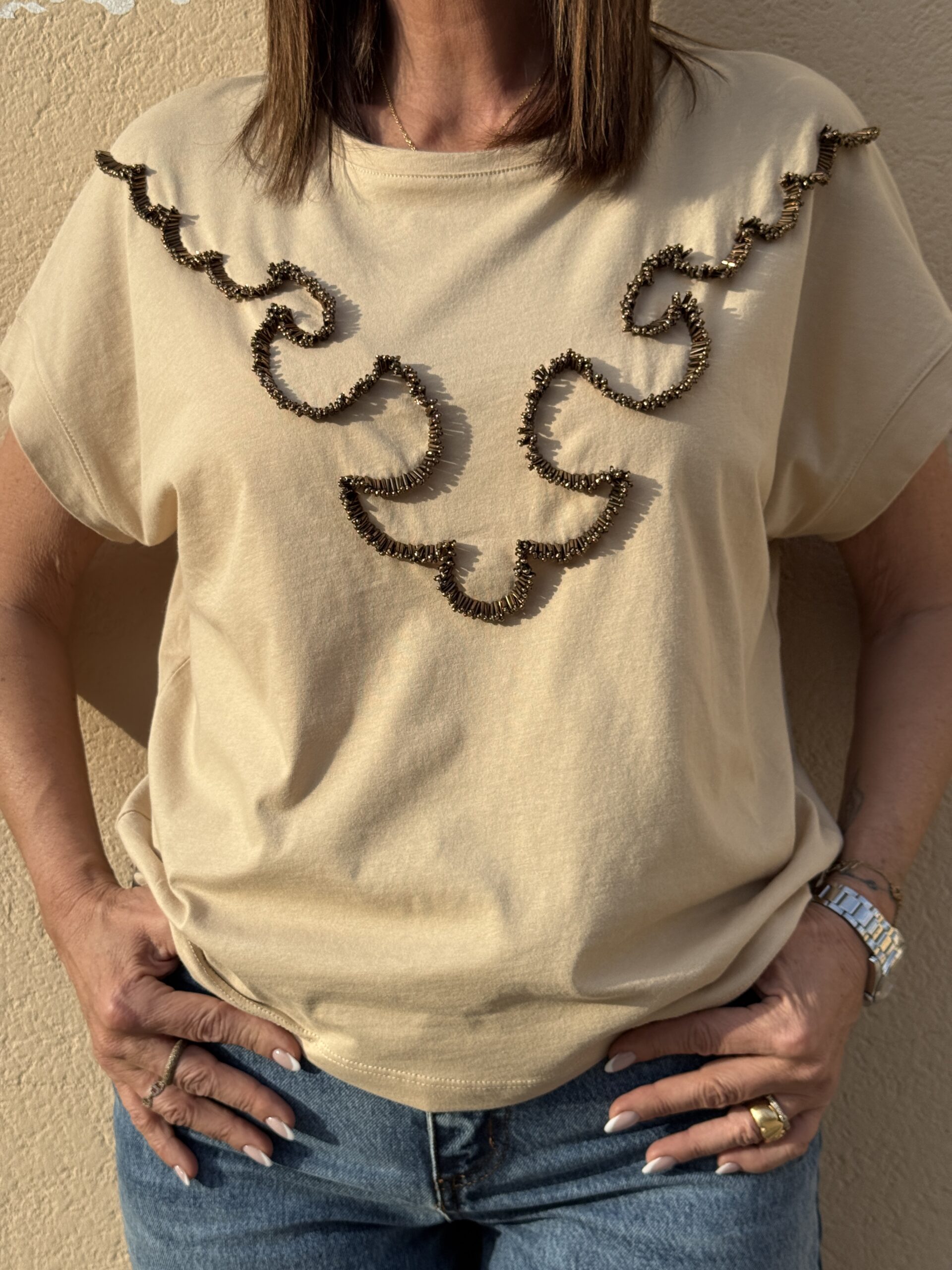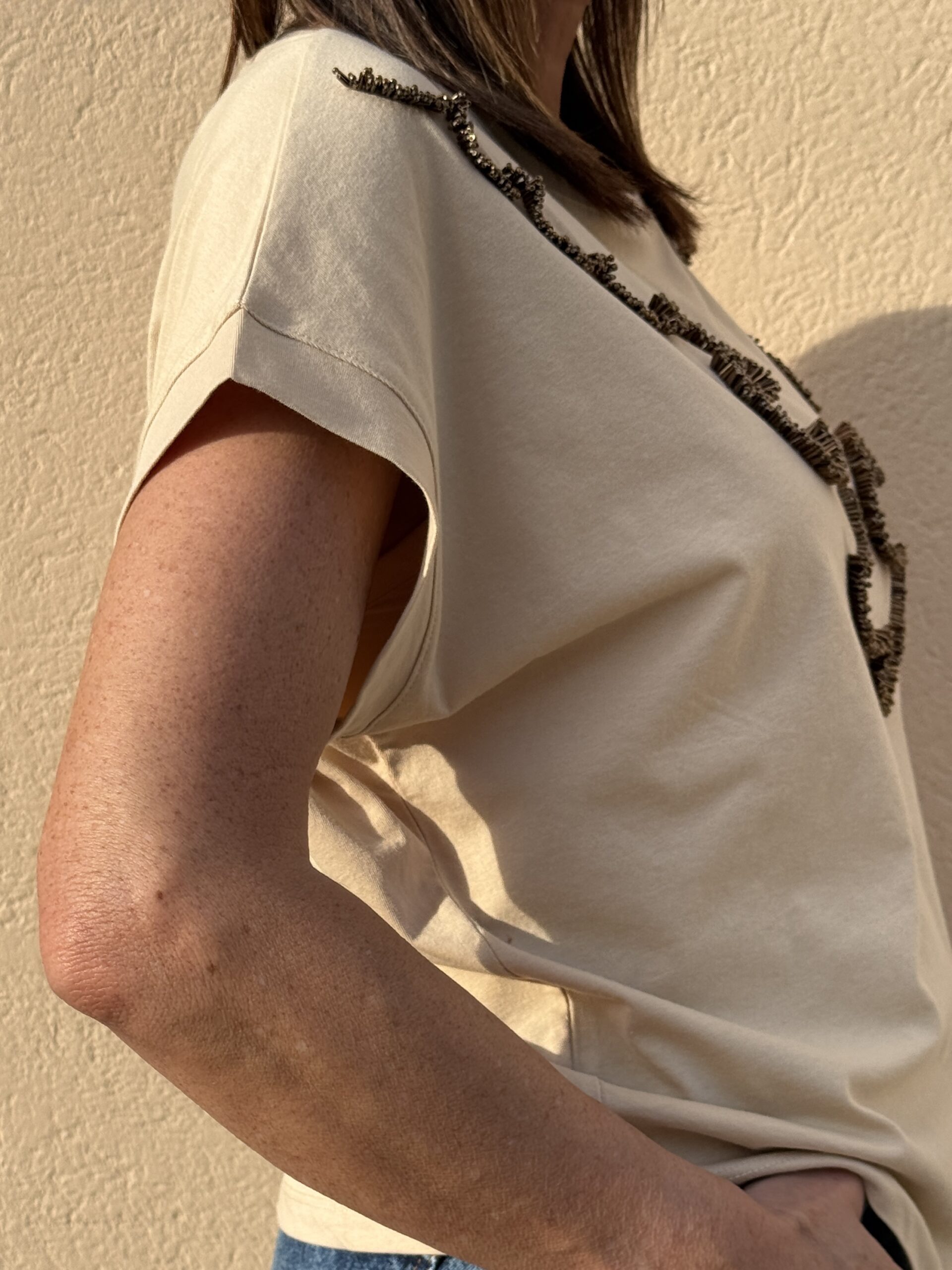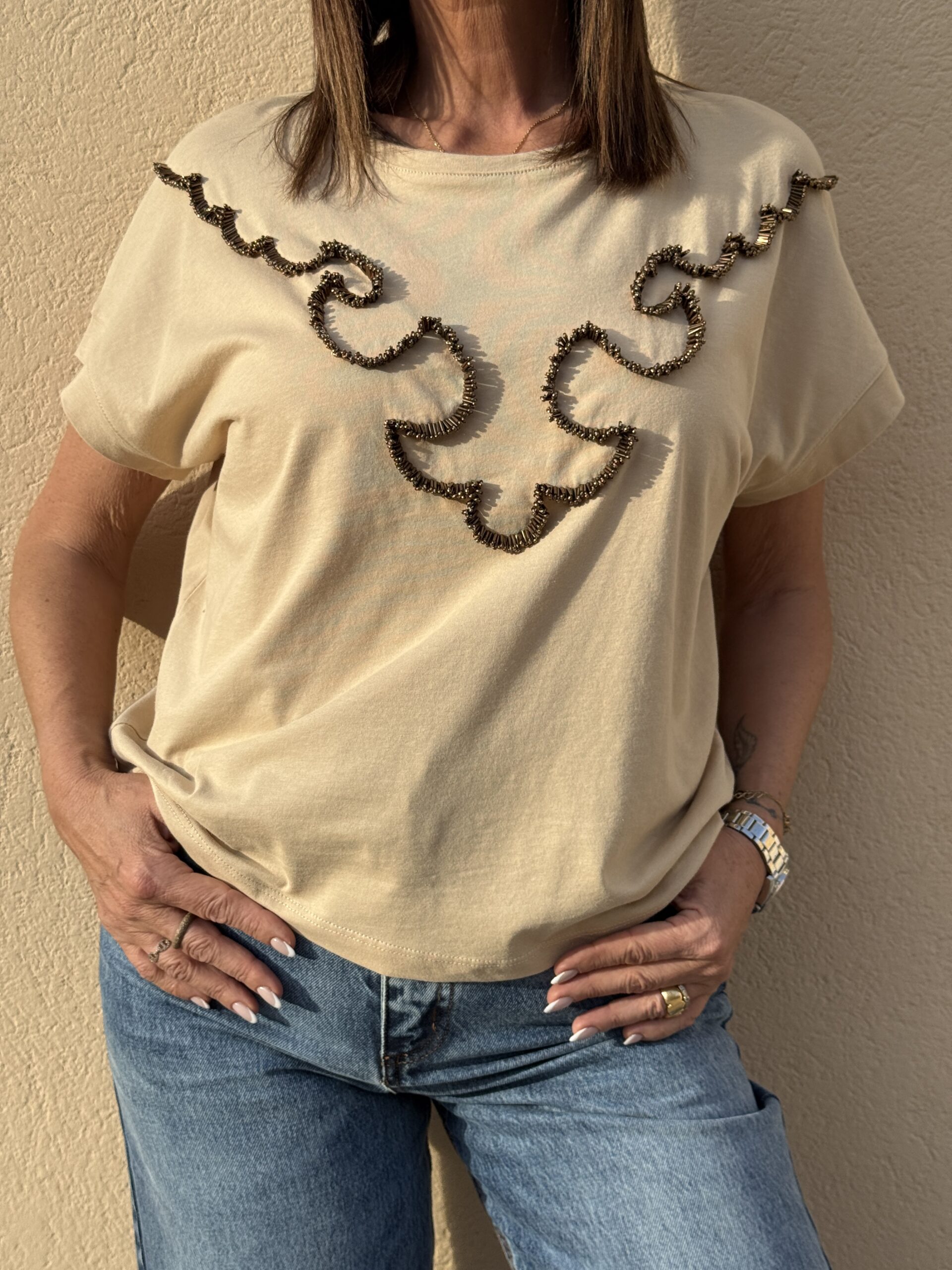 Subtil et élégant, ce t-shirt beige oversize se distingue par son motif brodé en relief aux lignes graphique.