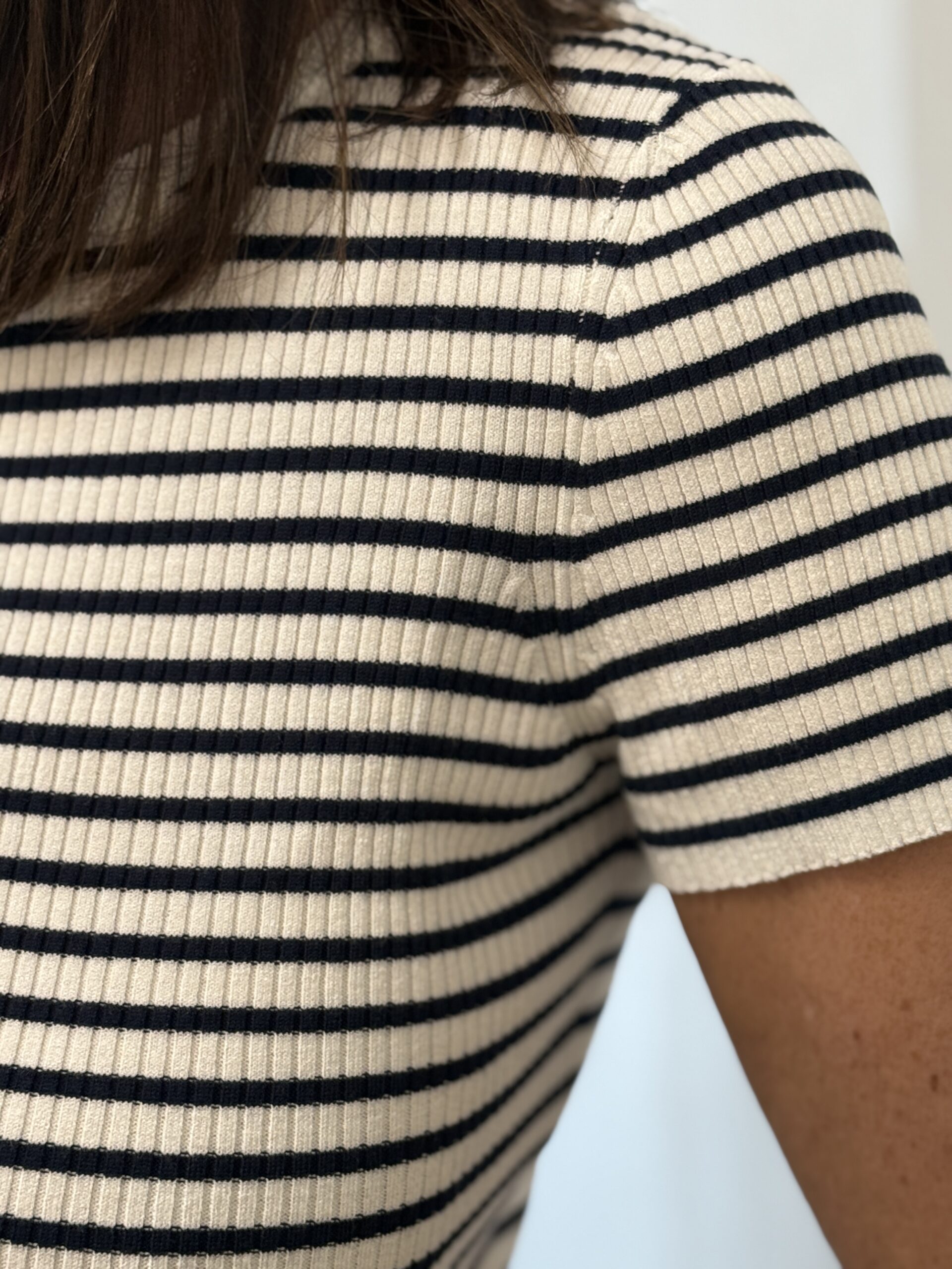 Conseil mode de Nathalie : Sublime avec un pantalon blanc, et une paire de sandales argentés ce T-shirt à rayures sera votre allié de cet été.