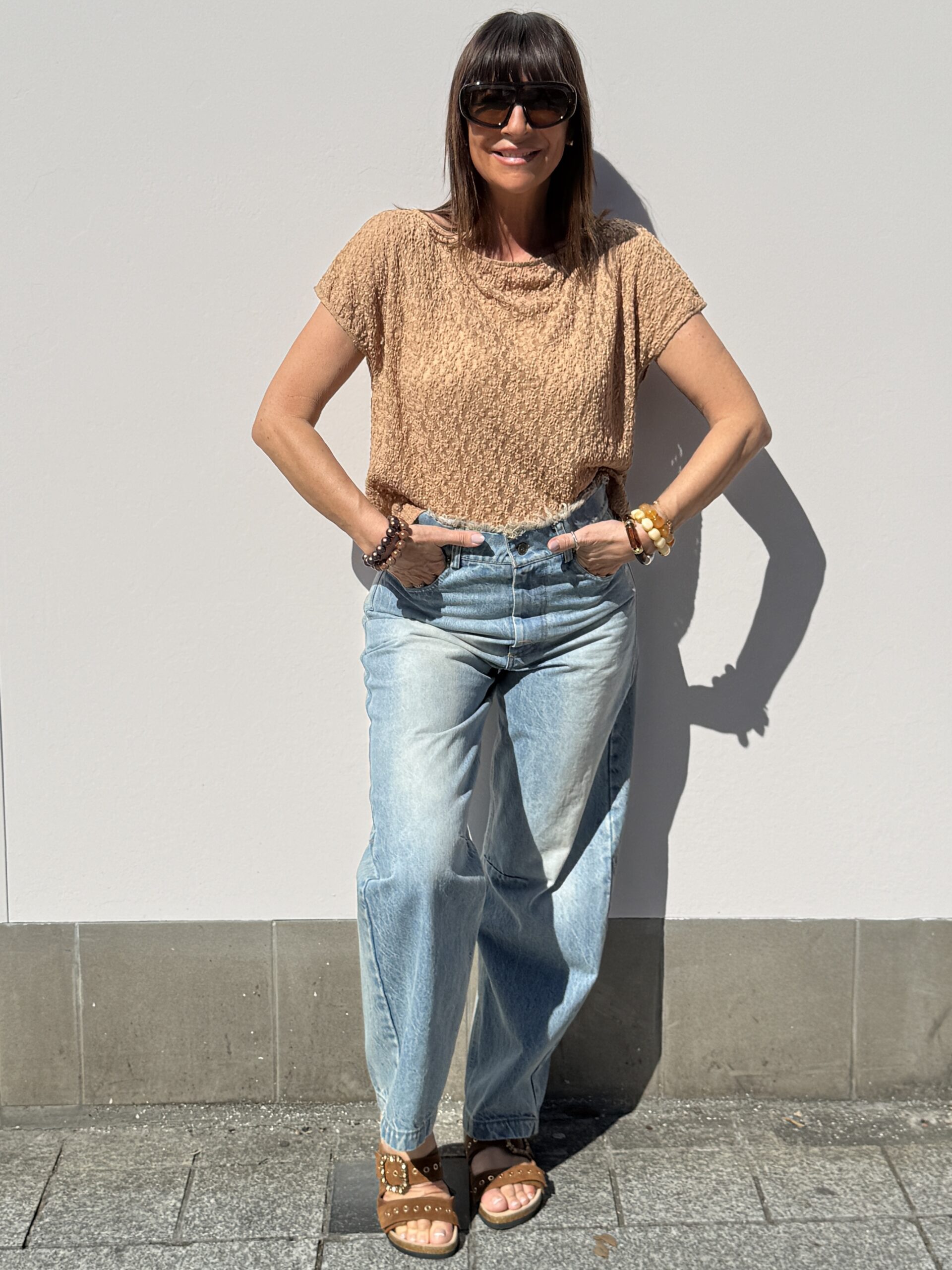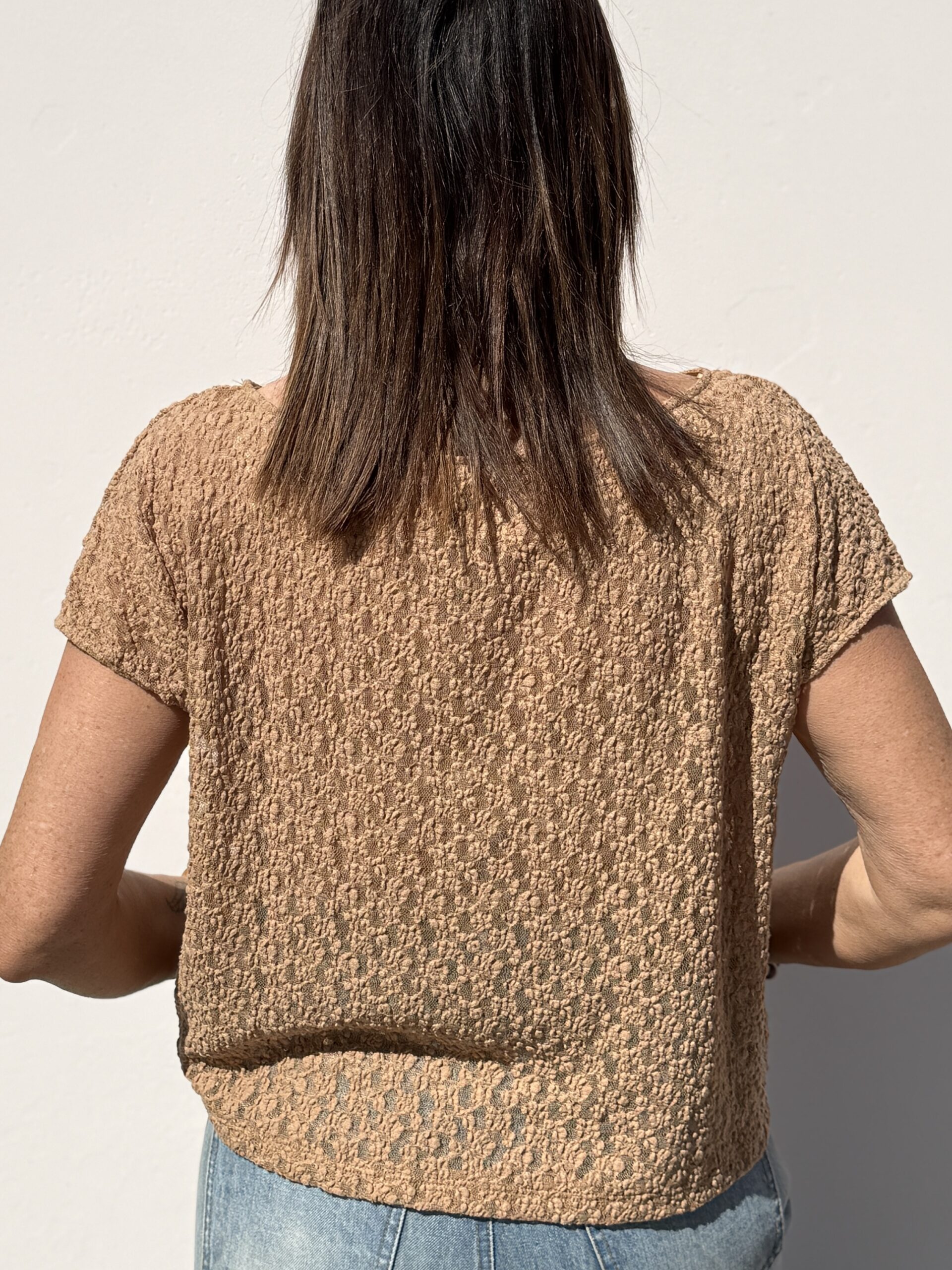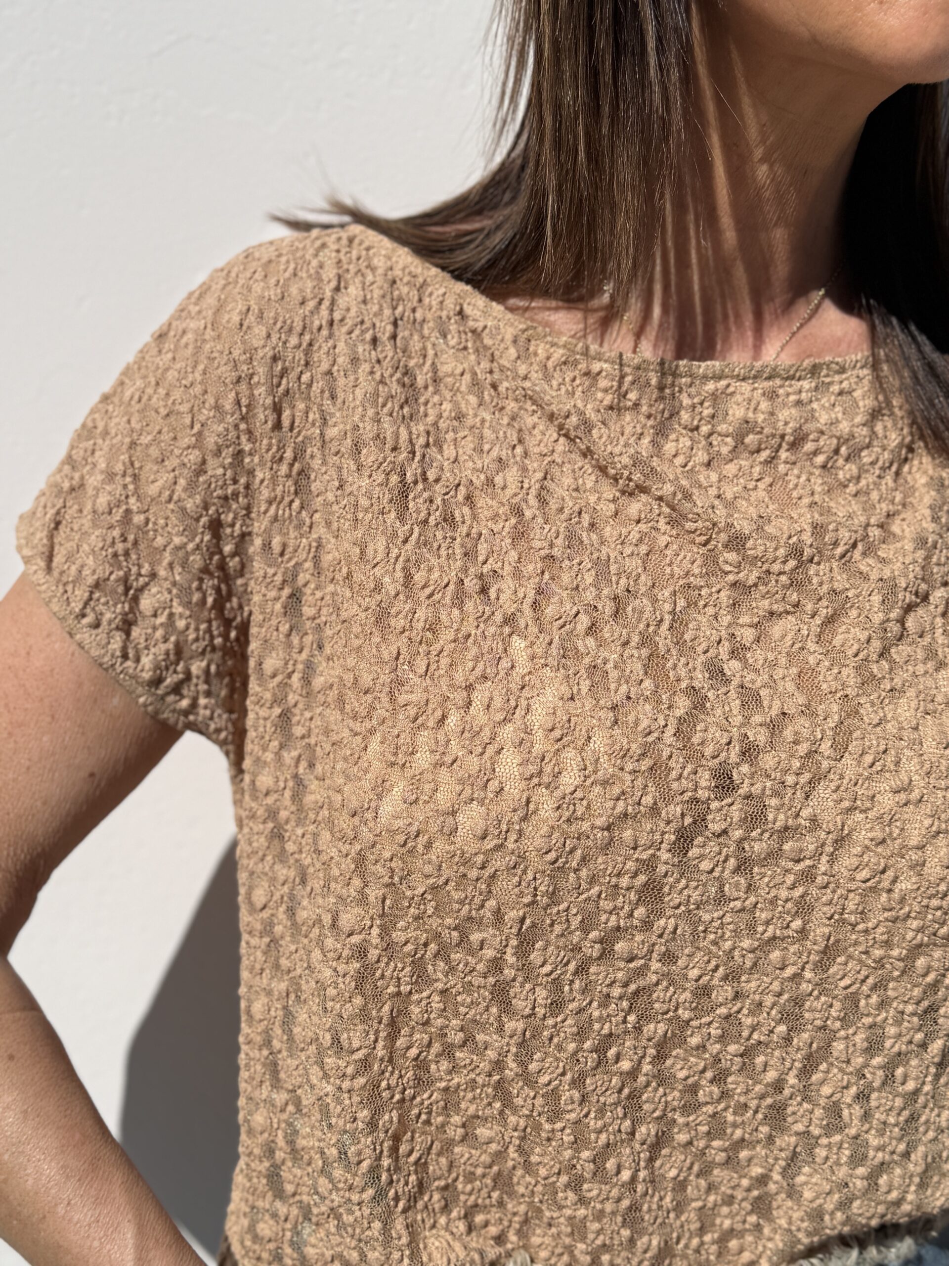Top en dentelle camel au style féminin et raffiné. léger et légèrement transparent, il apporte une touche élégante et tendance à toutes les tenues.
