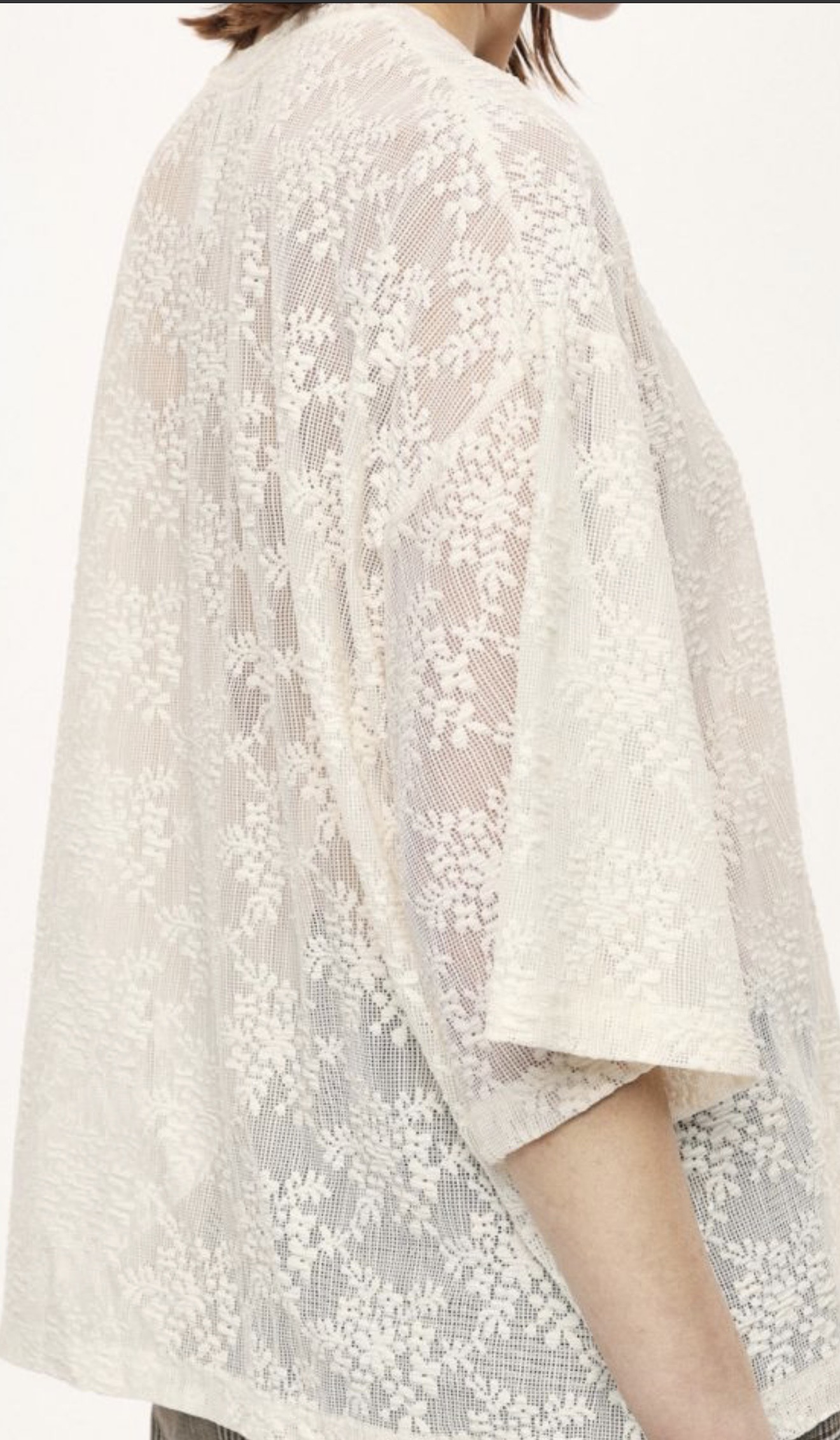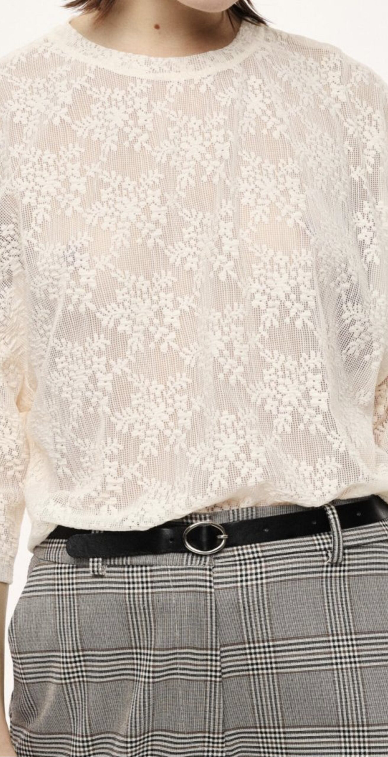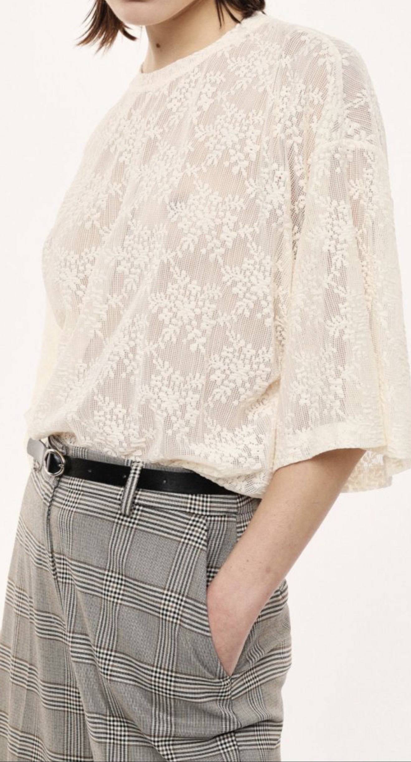 Top élégant en dentelle beige à motifs floral, au style raffiné et contemporain. La matière semi-transparente apporte de la légèreté et une touche féminine. La coupe ample et fluide assure un tombé naturel et confortable