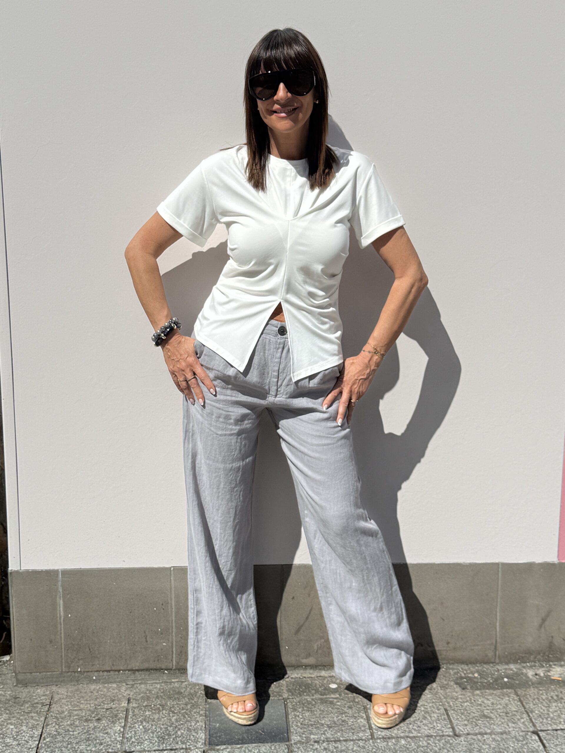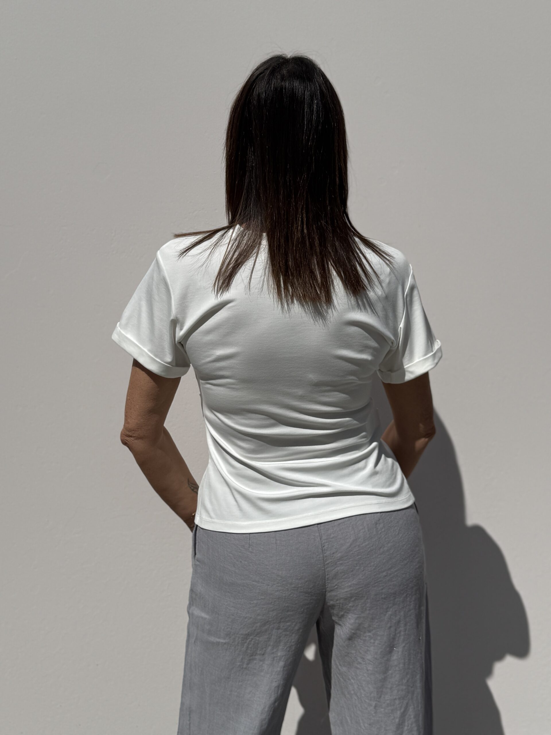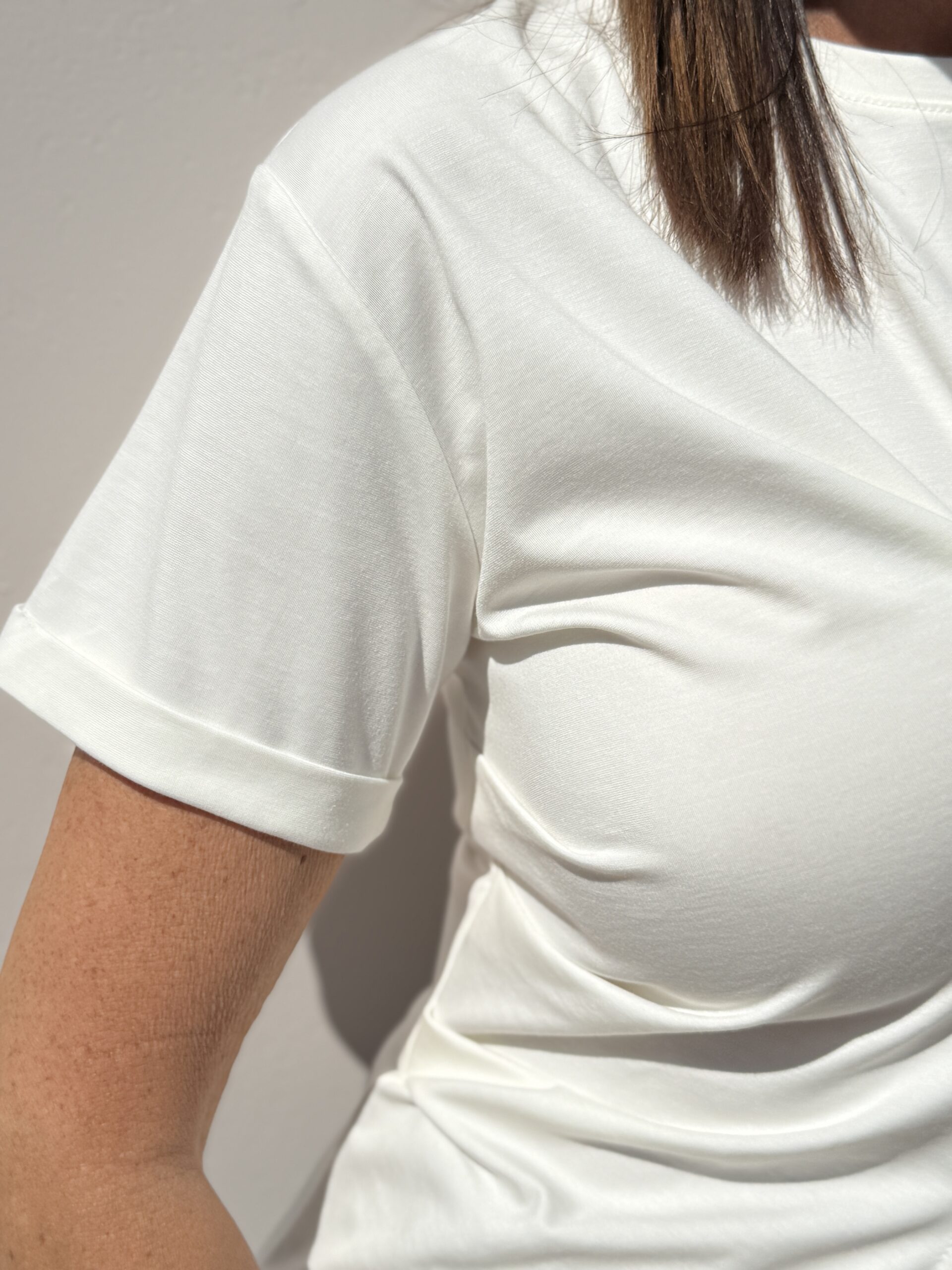 Minimaliste et élégant ce top blanc se distingue par son jeu drapé central qui apporte relief et une touche de sophistiquée.