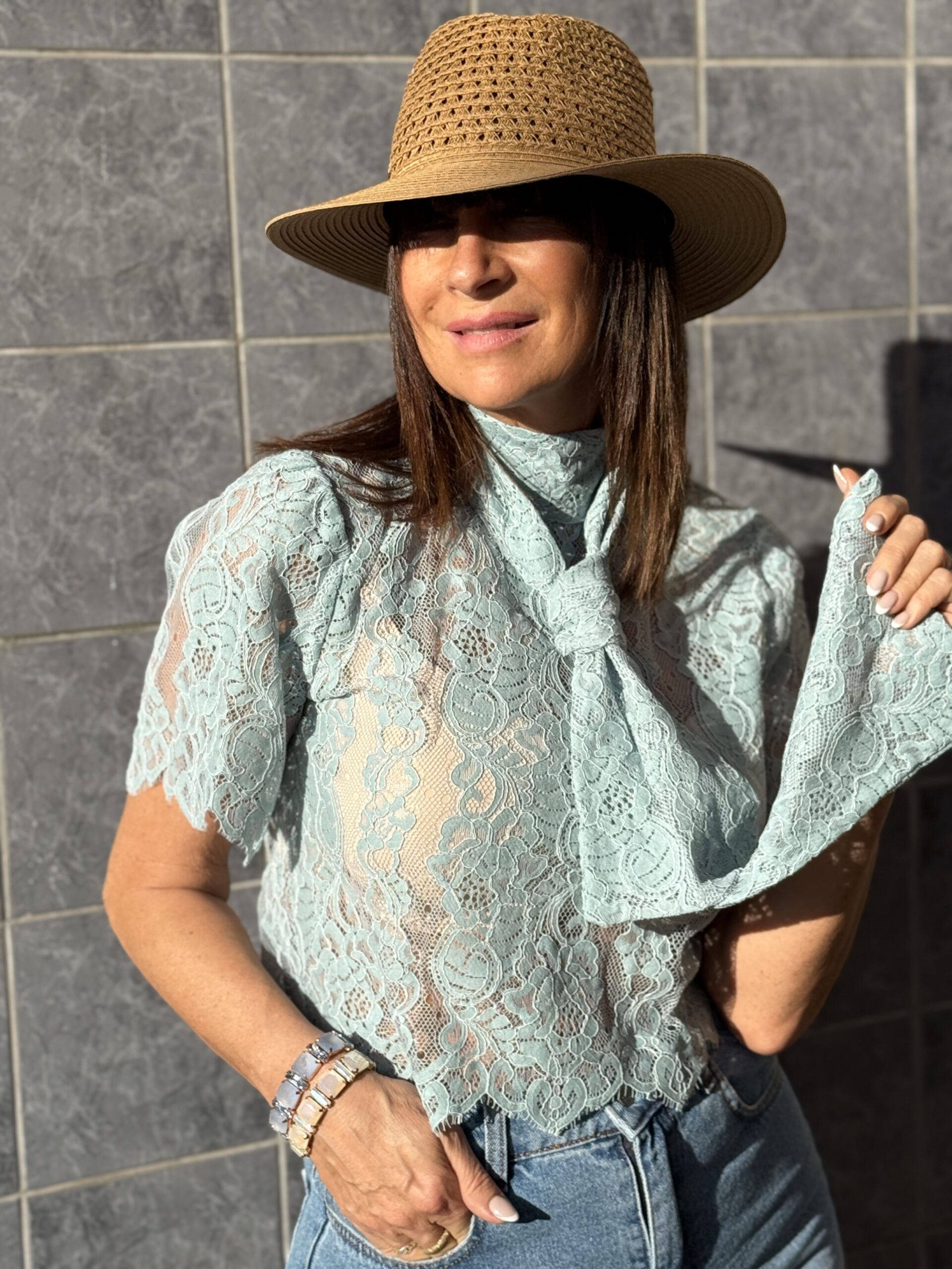 Top romantique et ultra féminine en dentelle délicate, avec un col montant et noeud a nouer pour un effet chic et sophistiqué. Une pièce élégante parfaite pour une tenue habillée ou un look causal chic.