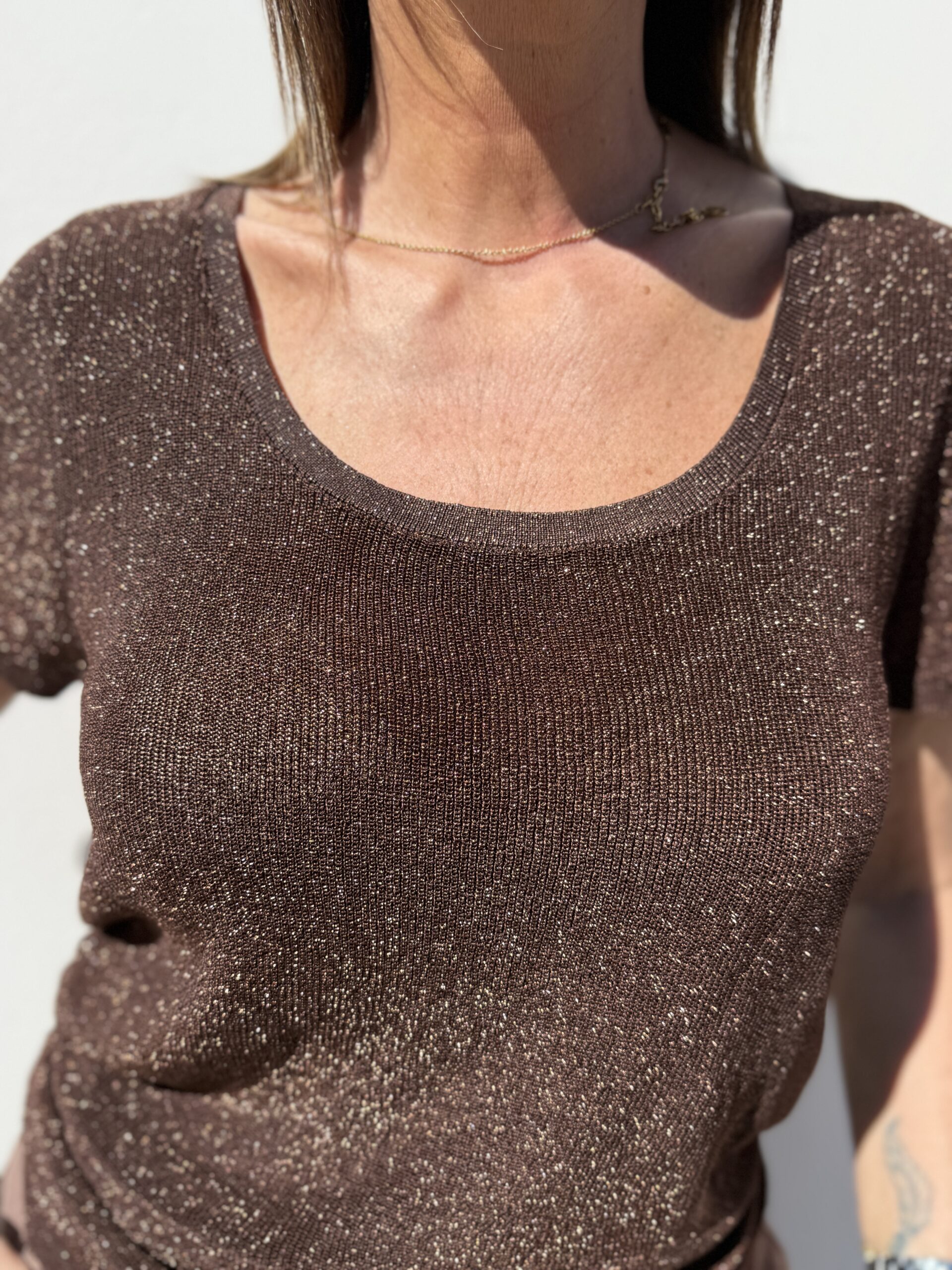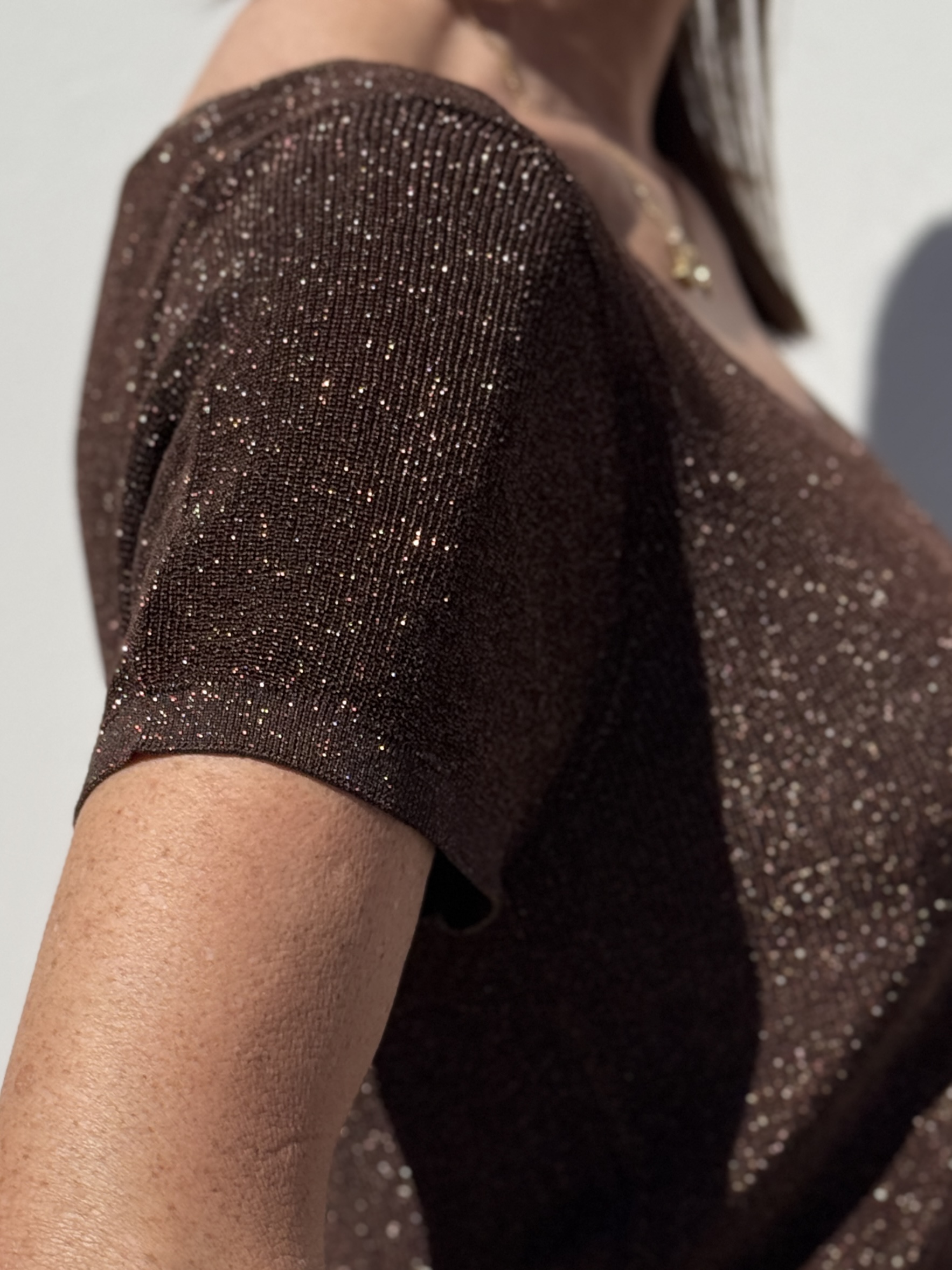 Top en maille fine, légèrement irisée, parfait pour illuminer une tenue du quotidien. Sa coupe simple et féminine en fait un essentiel facile à associer, du lool casual au plus habillé.
