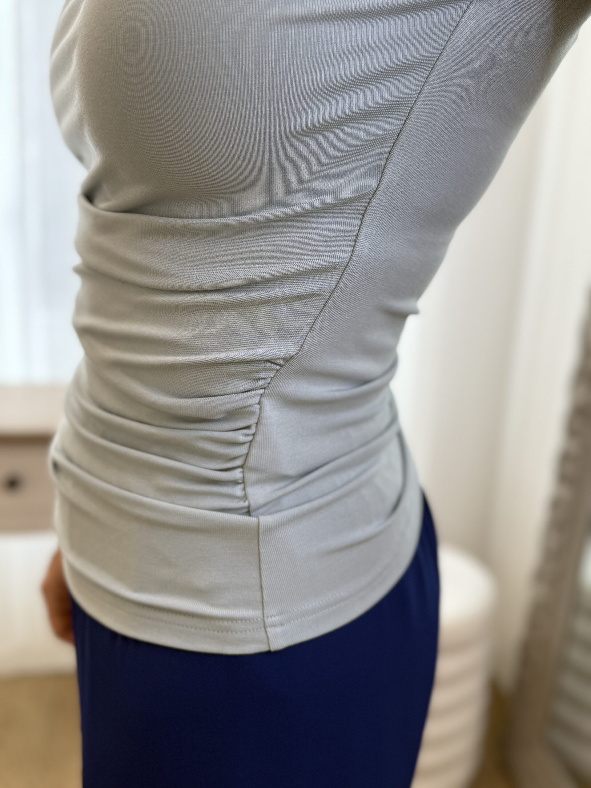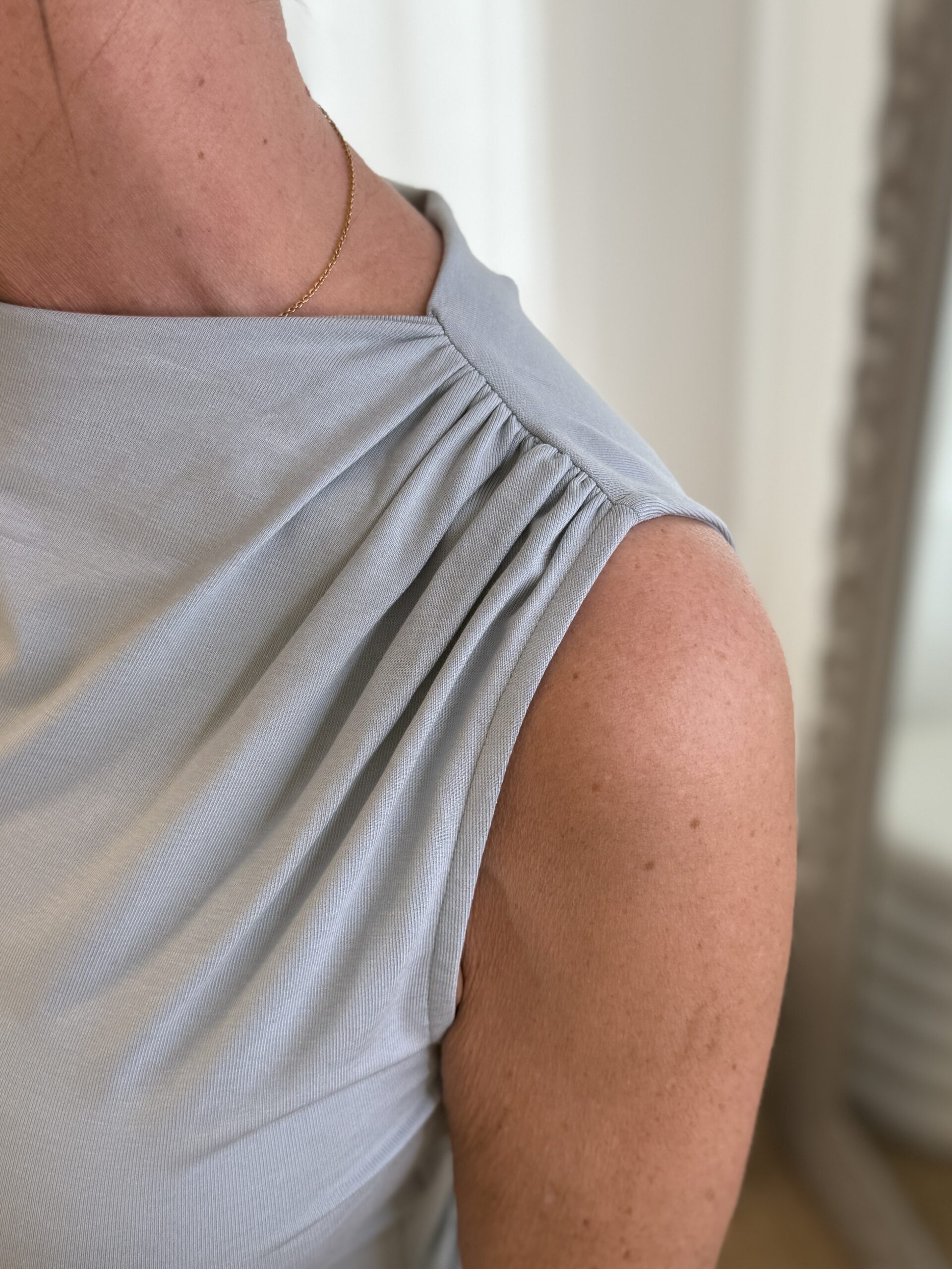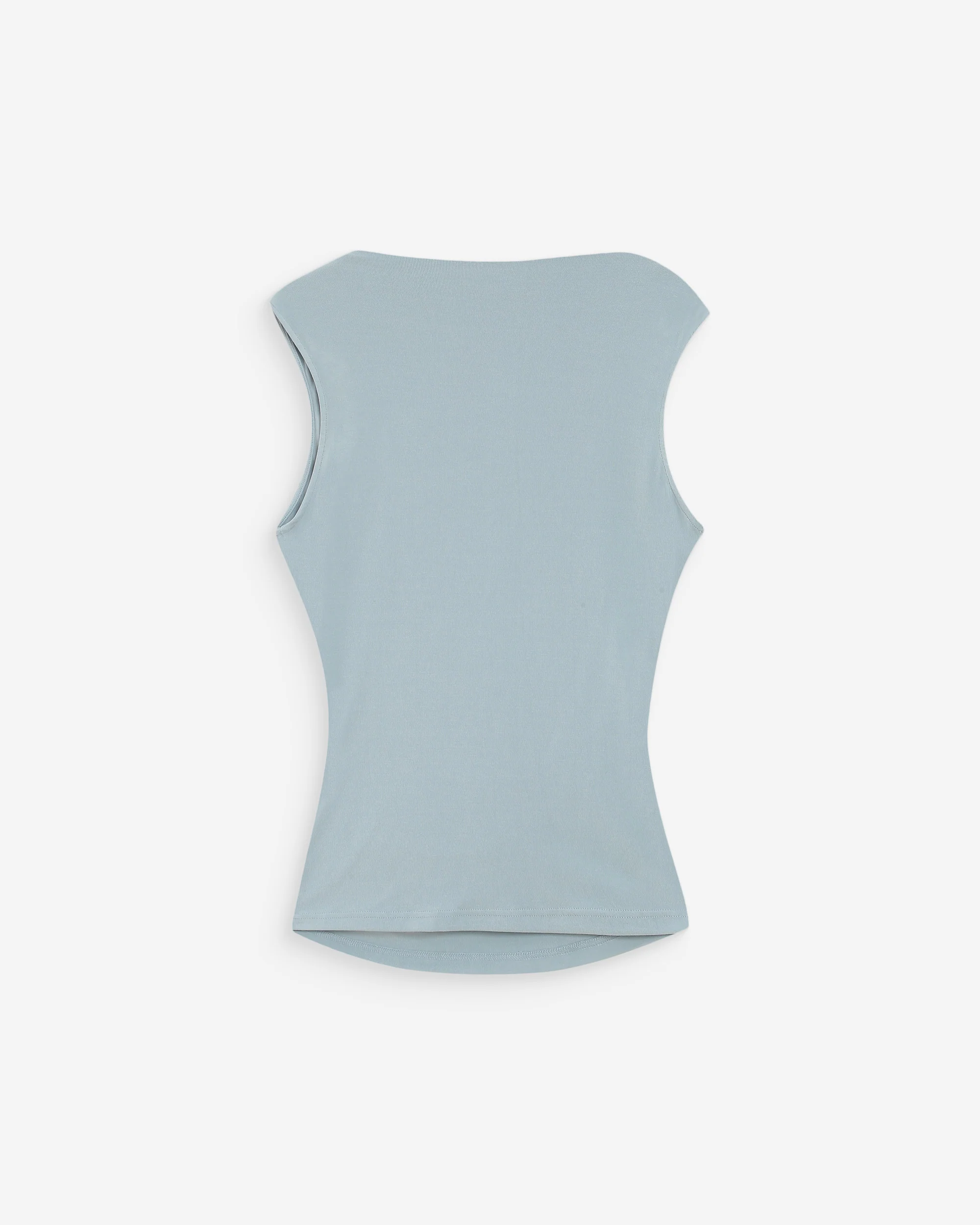 Le top sans manches »Valley » bleu ciel séduit par sa coupe près du corps et son élégant drapé sur le côté, qui sublime la silhouette avec subtilité. Son col montant apporte une touche moderne et sophistiquée, idéale pour un look chic au quotidien comme en soirée.