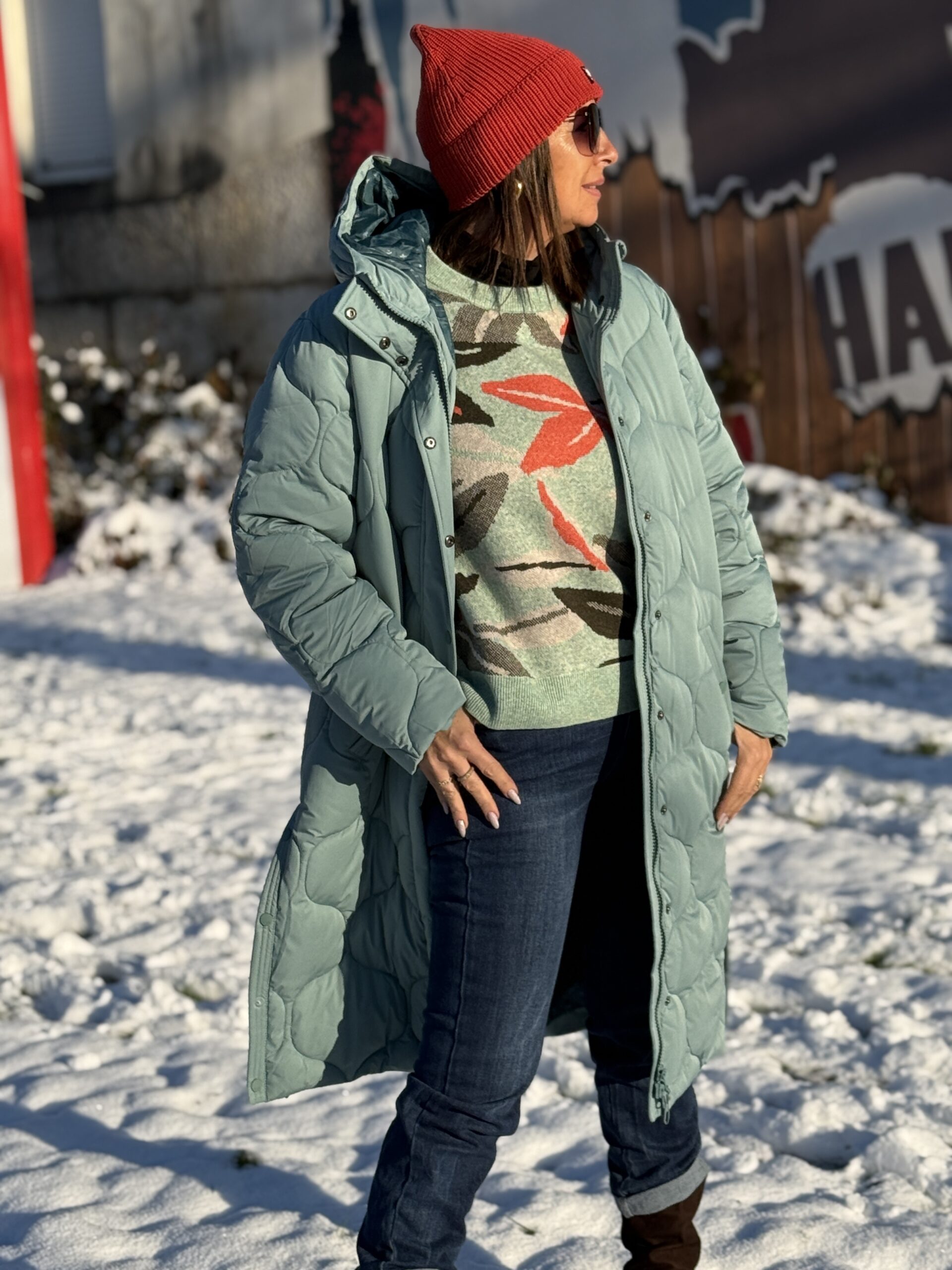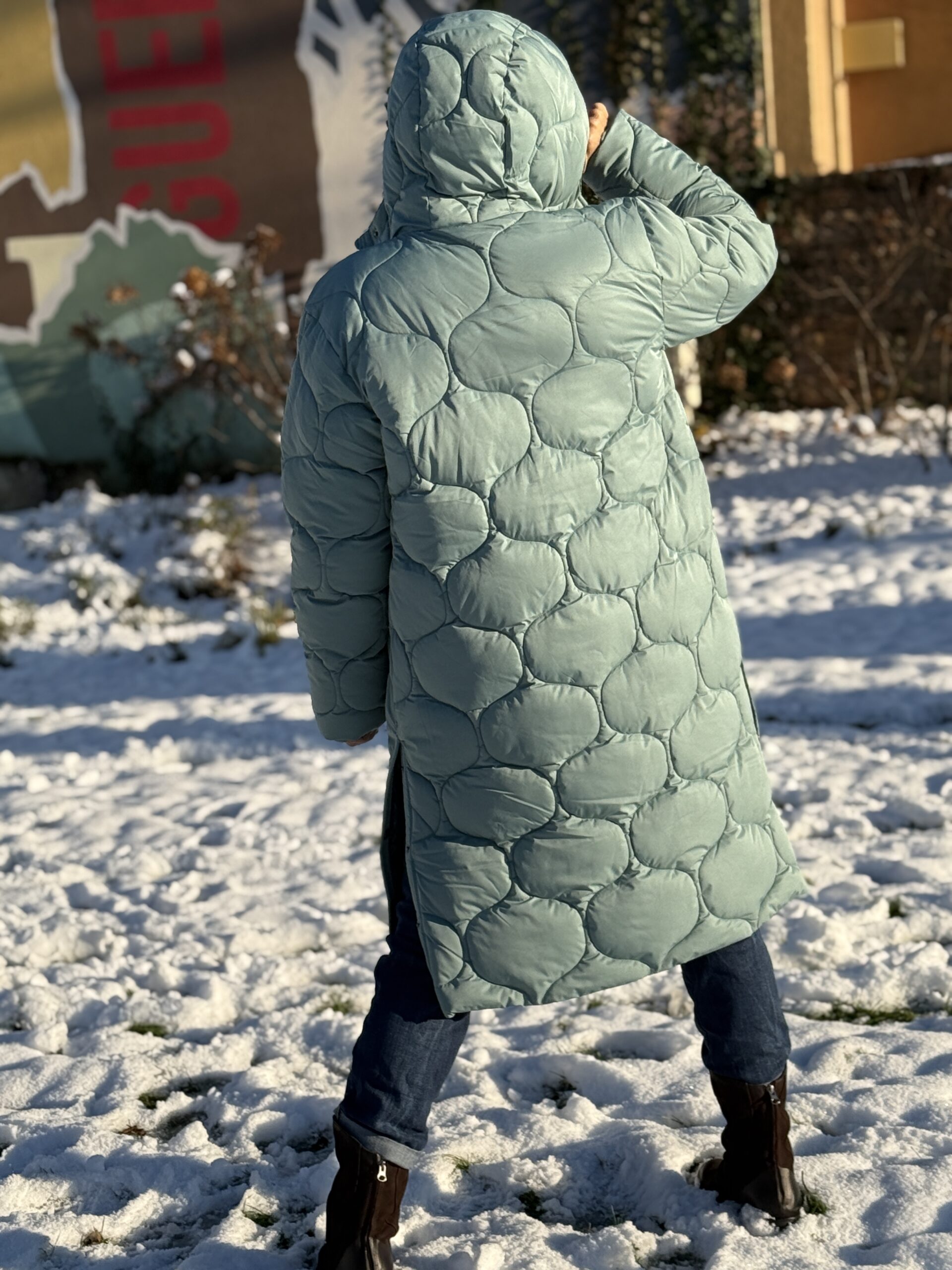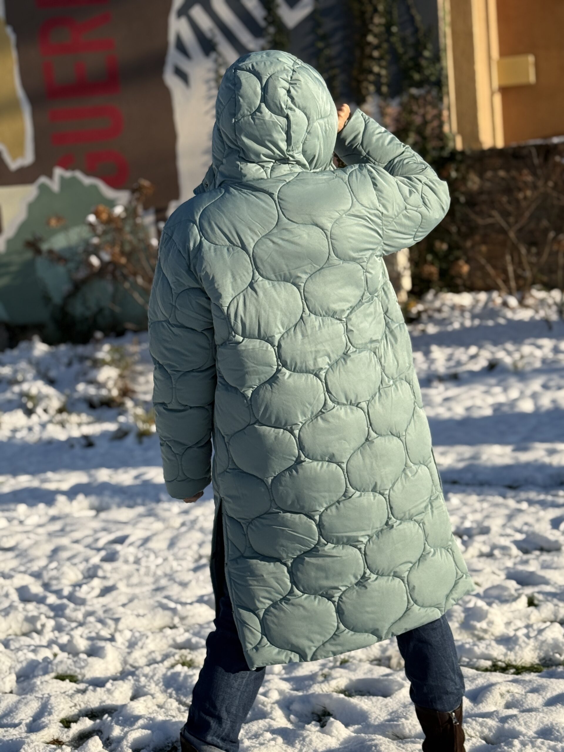 Cette doudoune longue matelassé aqua est LA pièce cocooning parfaite pour l’hiver !