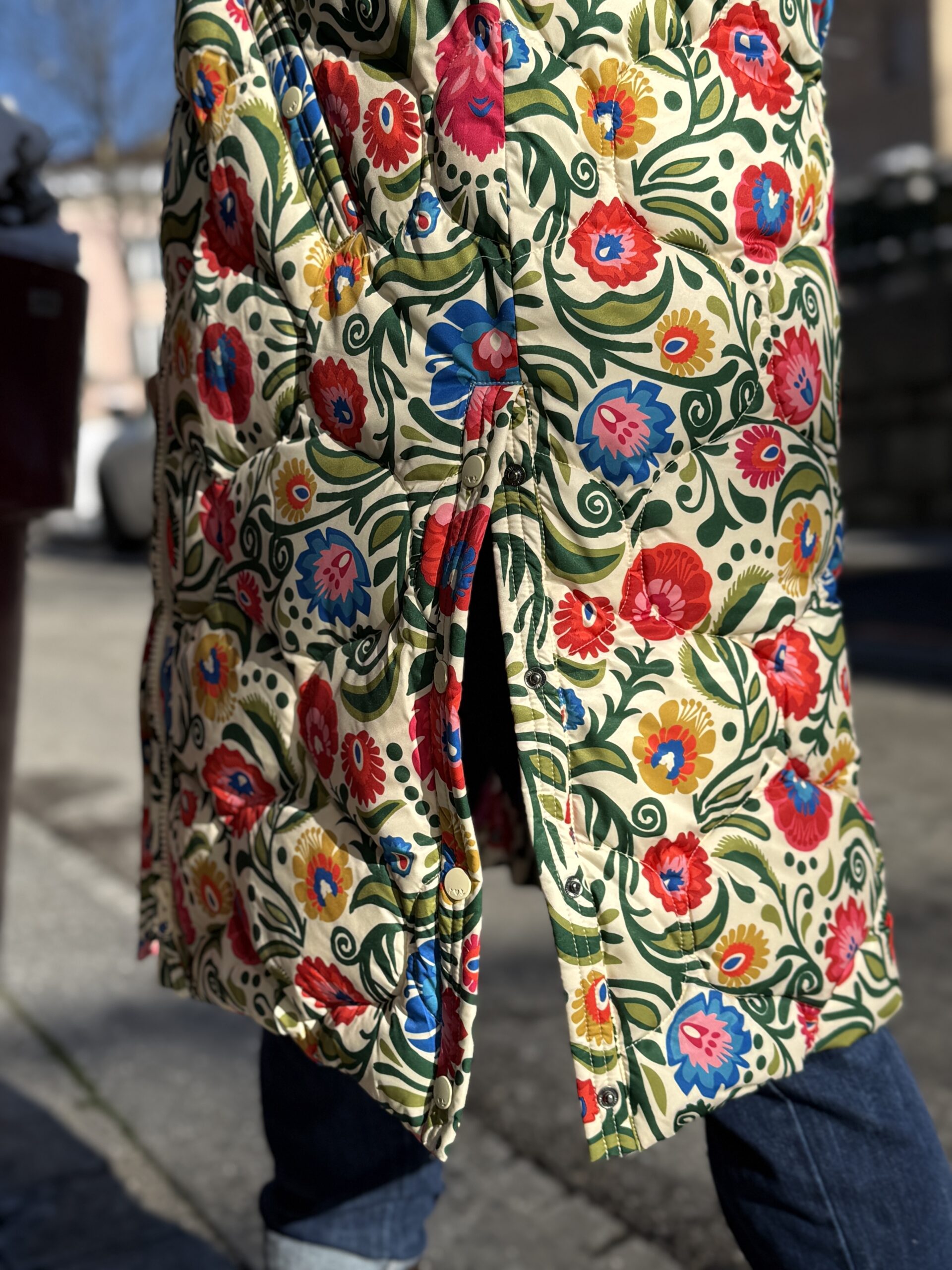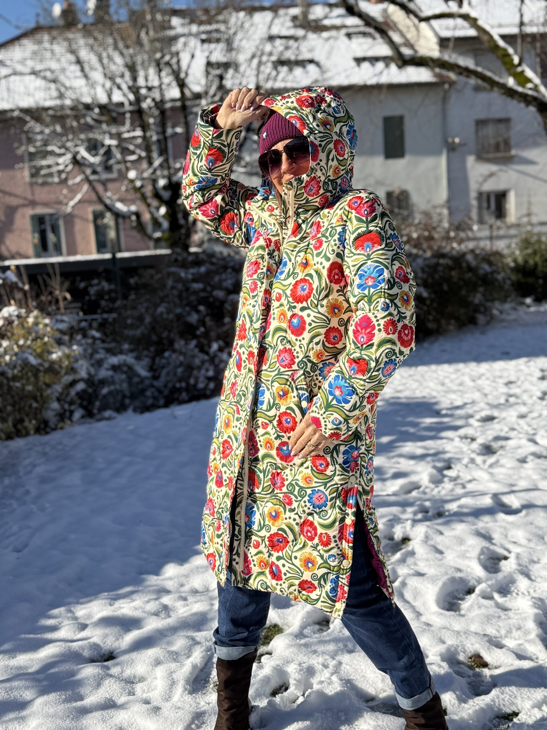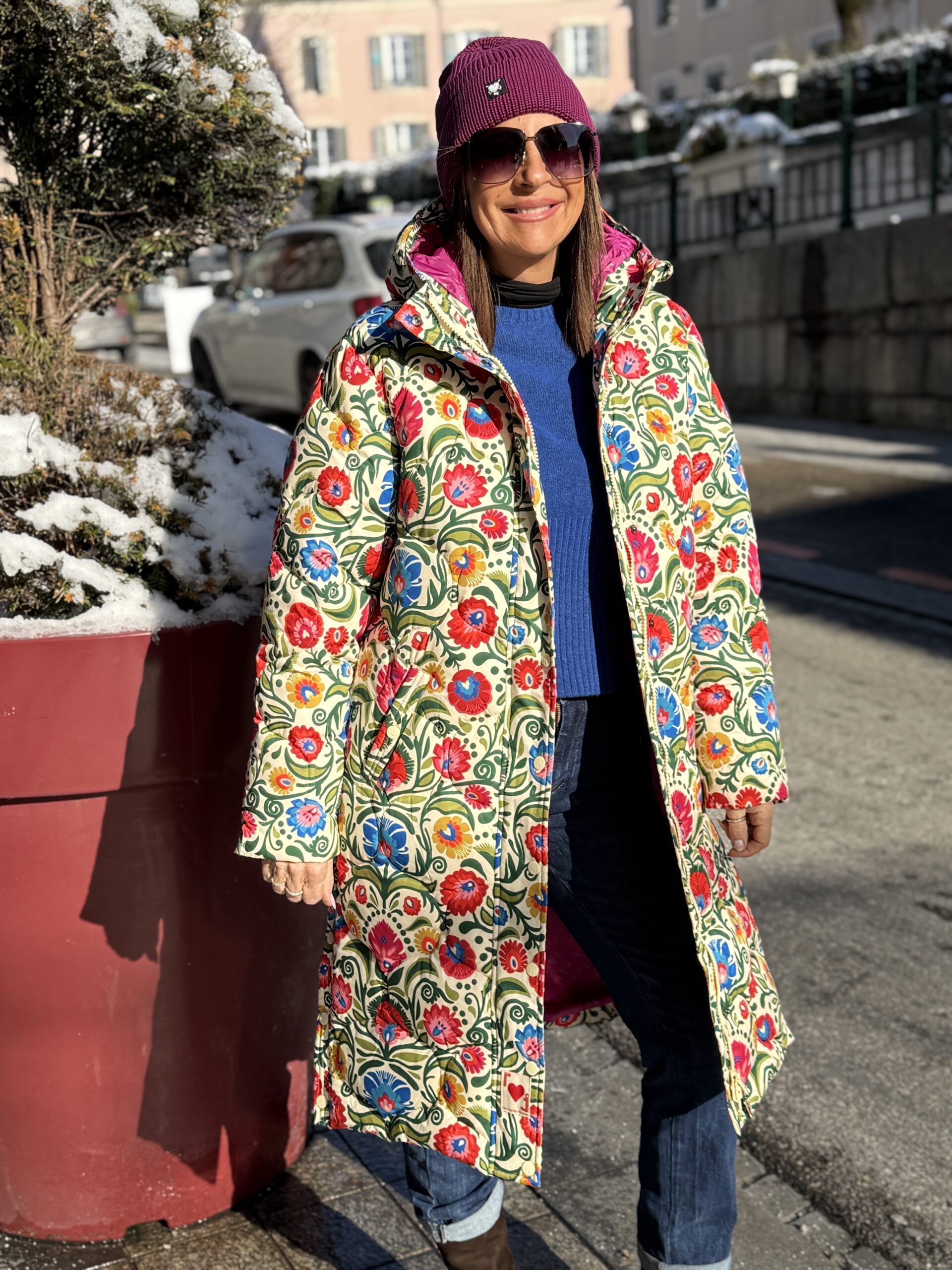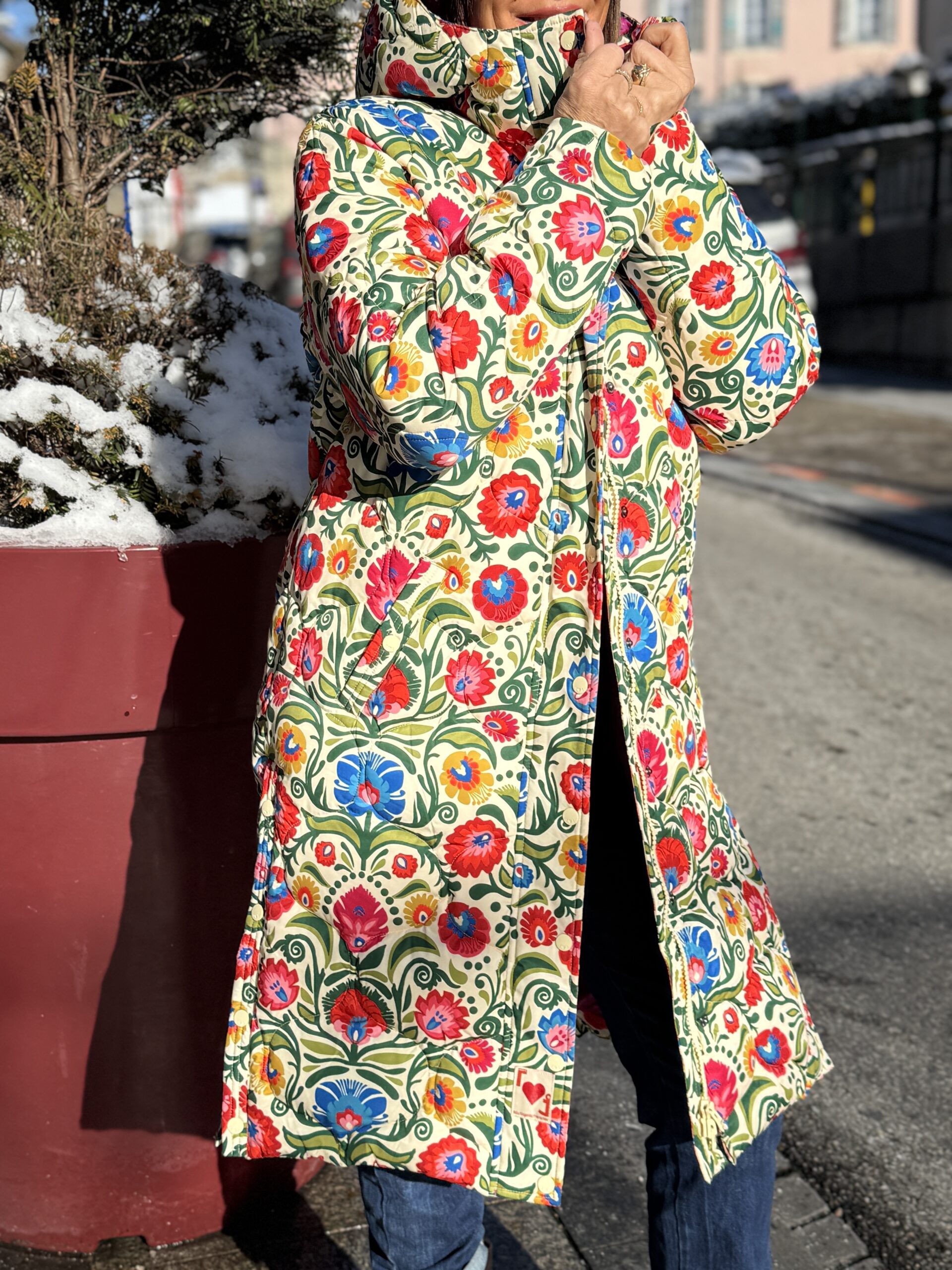 Ose la couleur avec cette doudoune longue à imprimé floral multicolore, véritable rayon de soleil pour l’hiver !