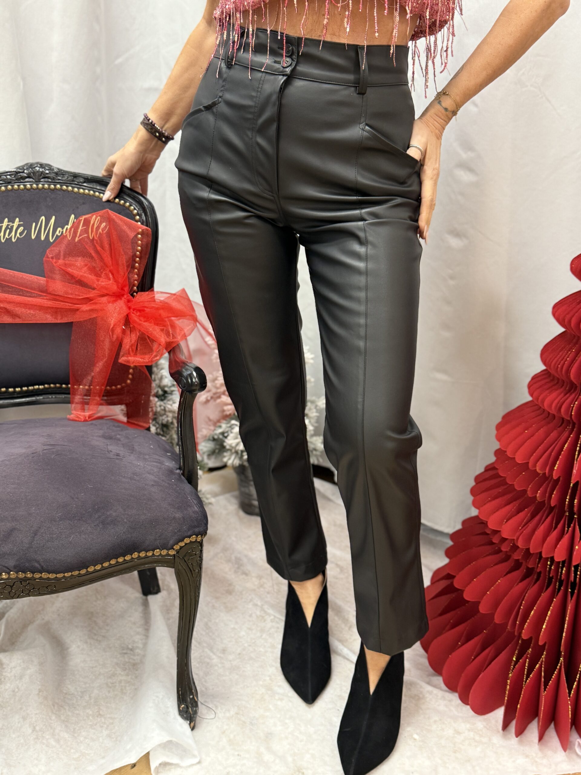 Pantalon en simili cuir noir, lisse et souple, doté d’une coupe droite moderne qui allonge la silhouette.