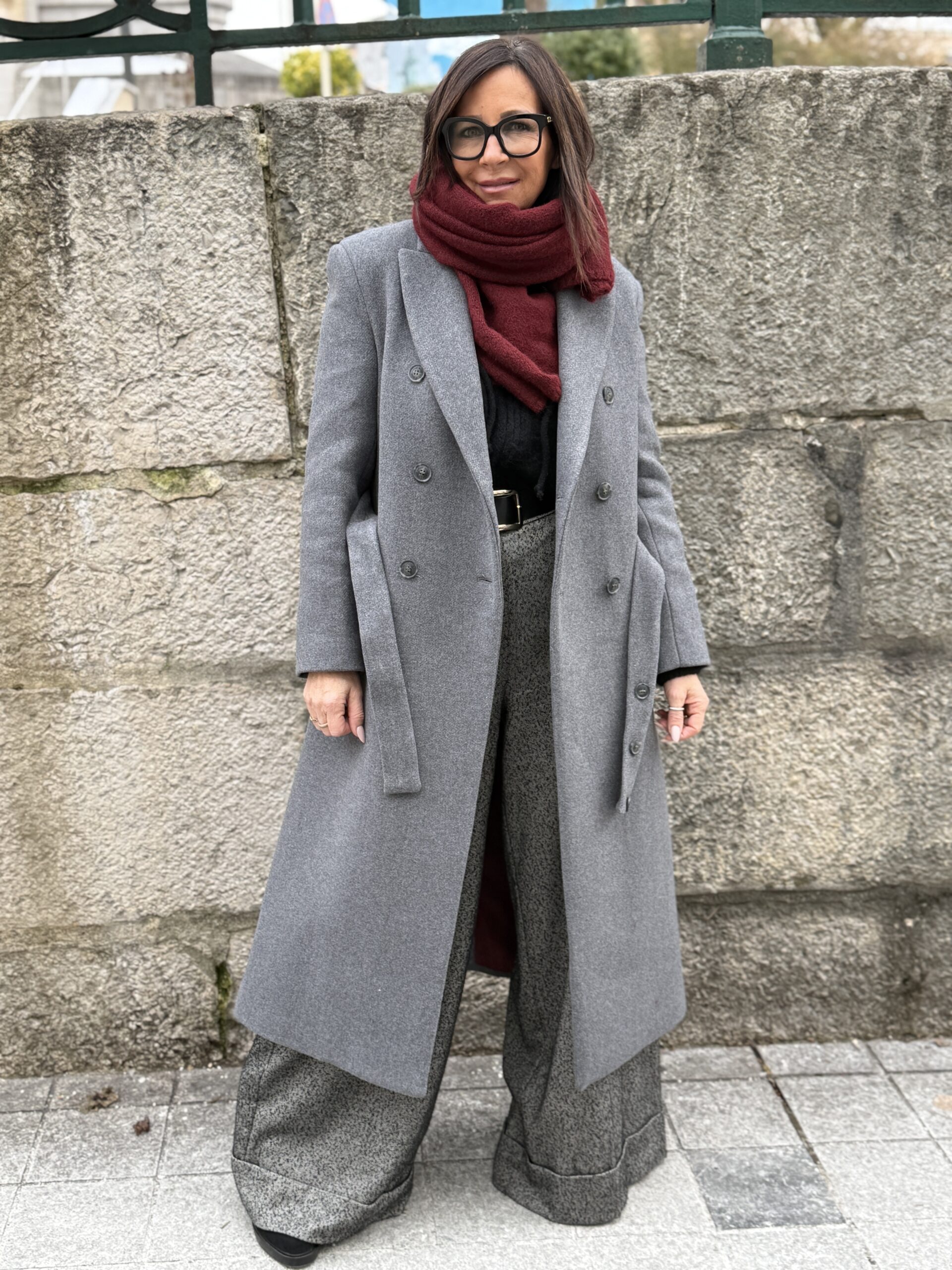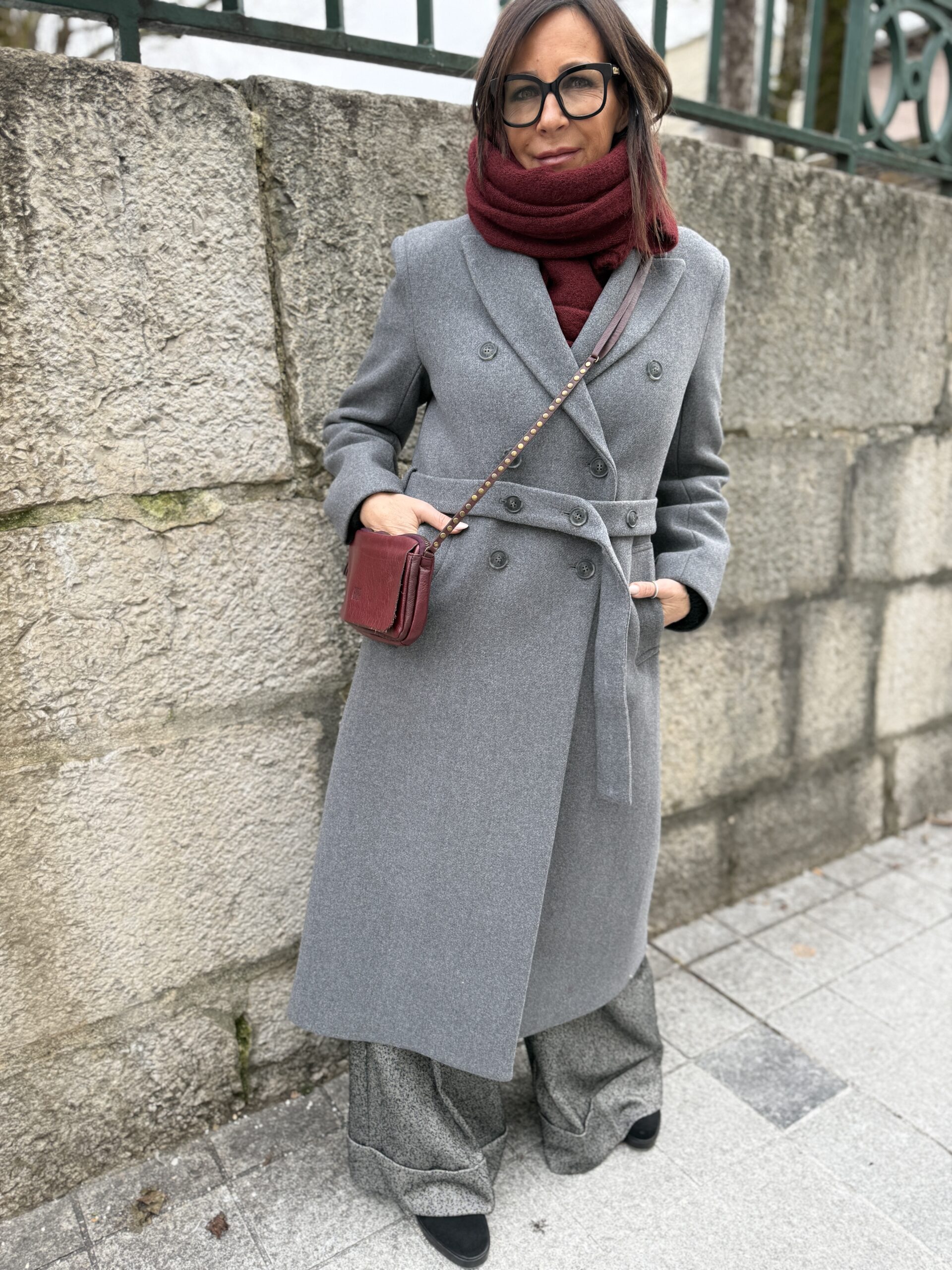 Conseil mode de Nathalie : Portez le avec un pantalon large en laine ou tweed gris clair, pour une continuité élégante.