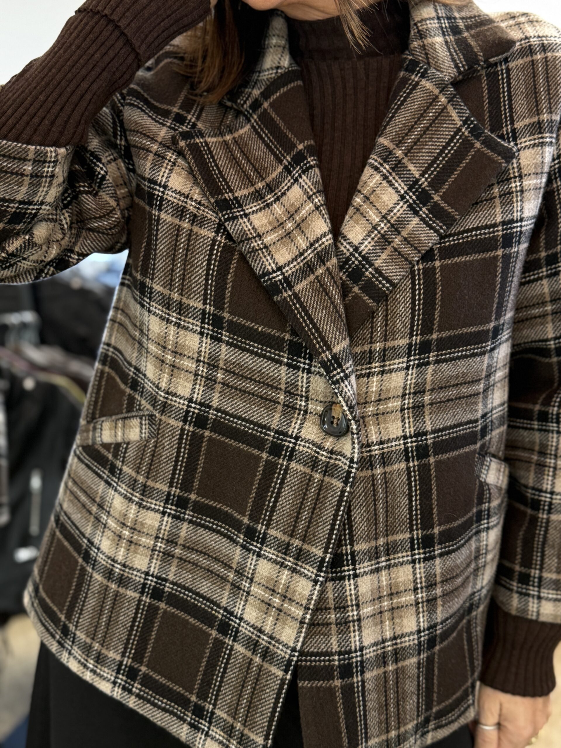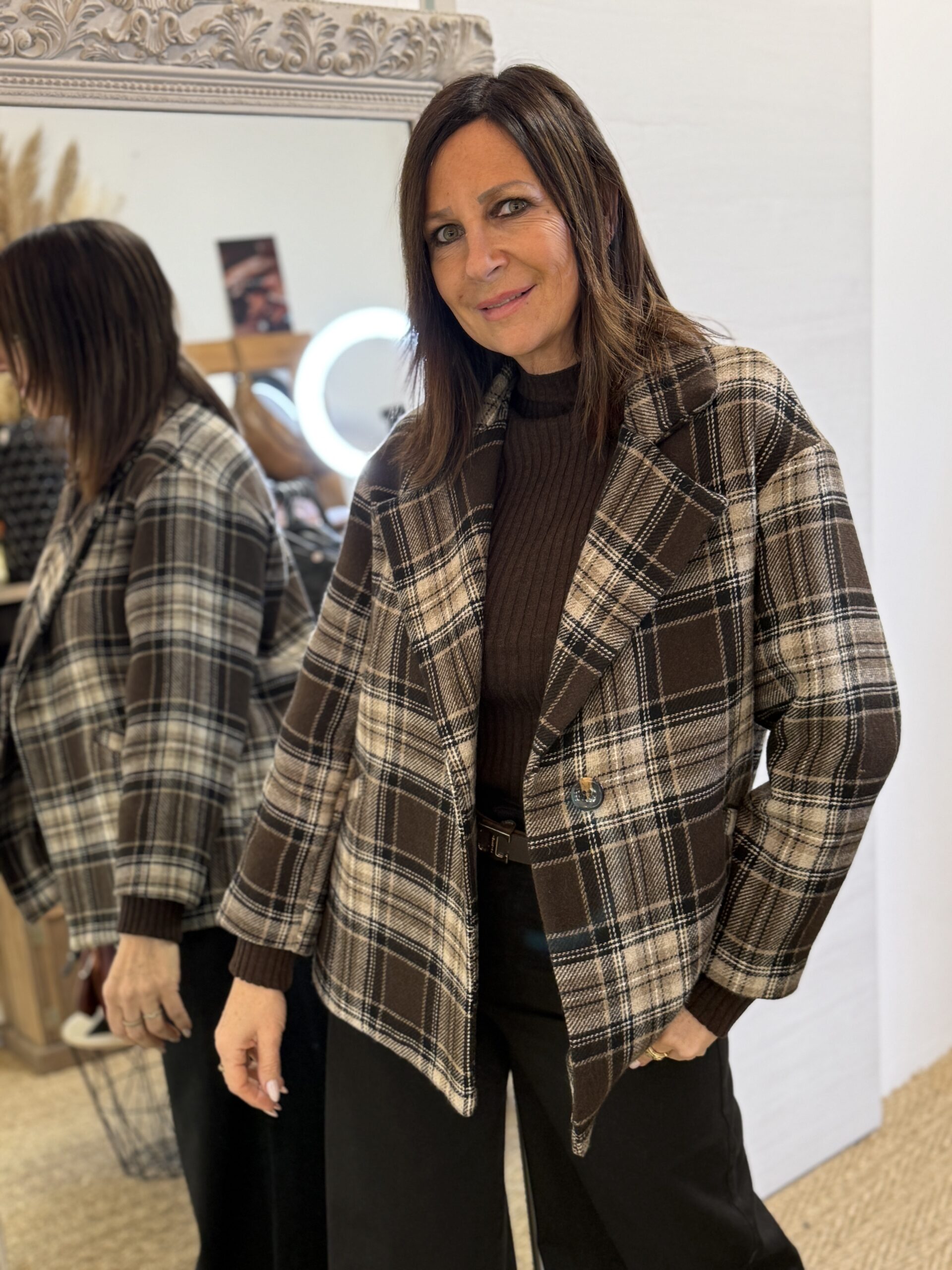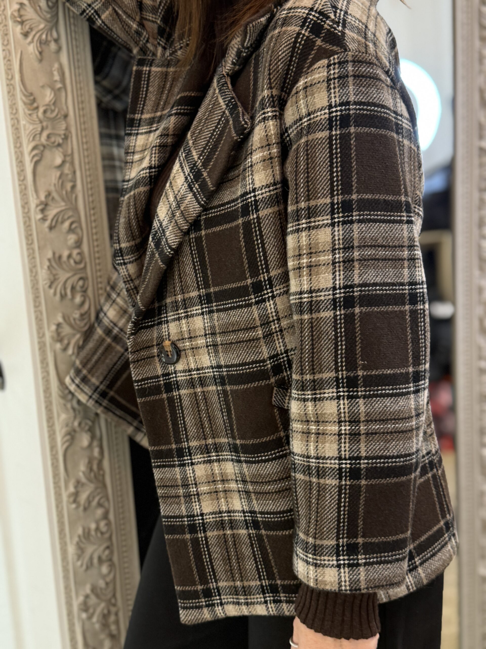 Ce manteau court à carreaux marron apporte une touche chaleureuse et sophistiqué à votre garde-robe!