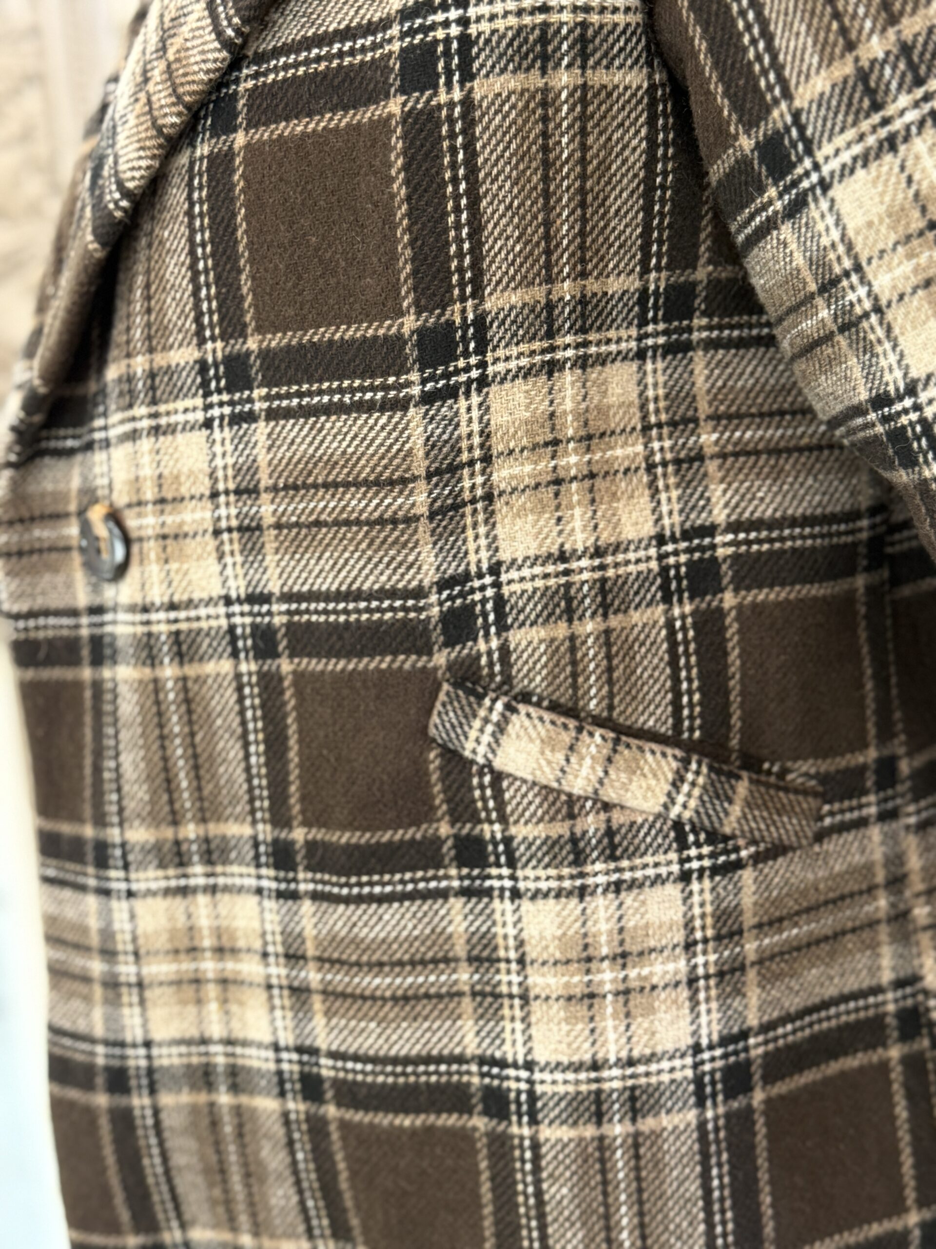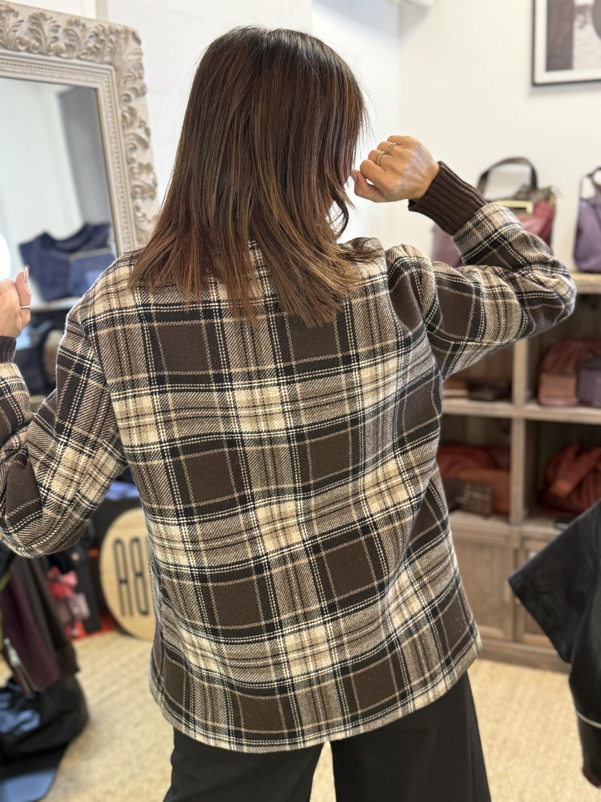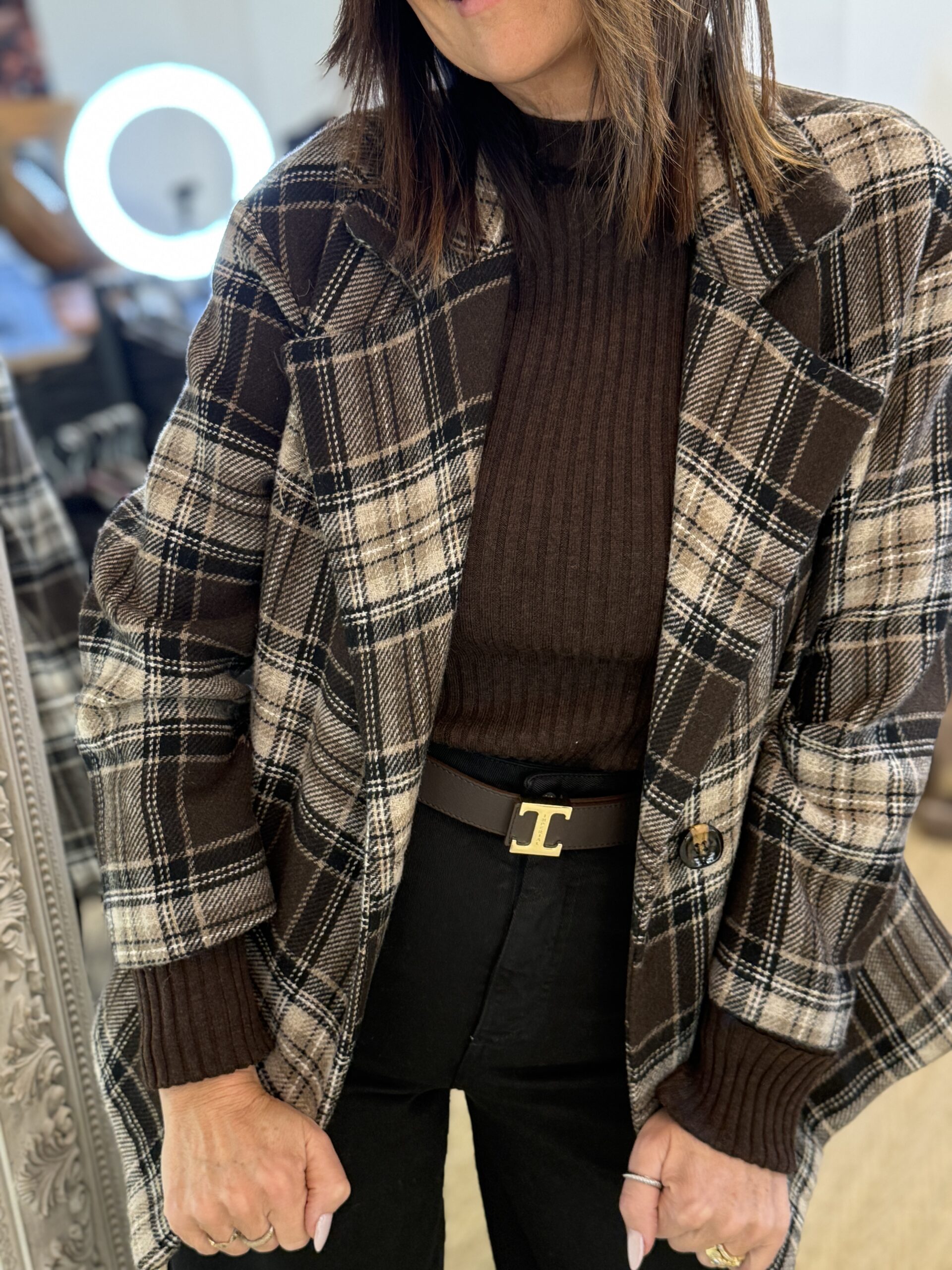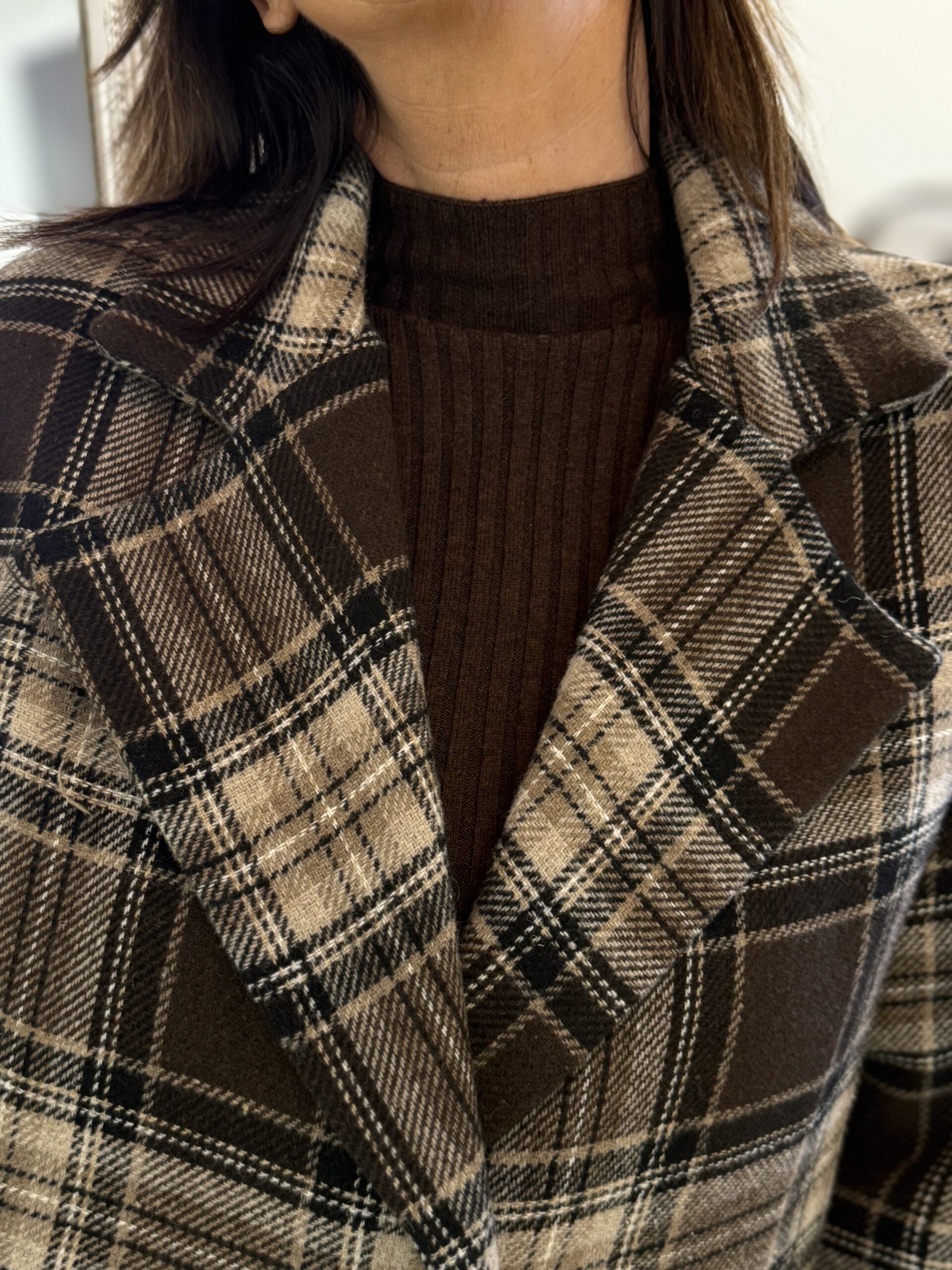 Ce manteau court à carreaux marron apporte une touche chaleureuse et sophistiqué à votre garde-robe!