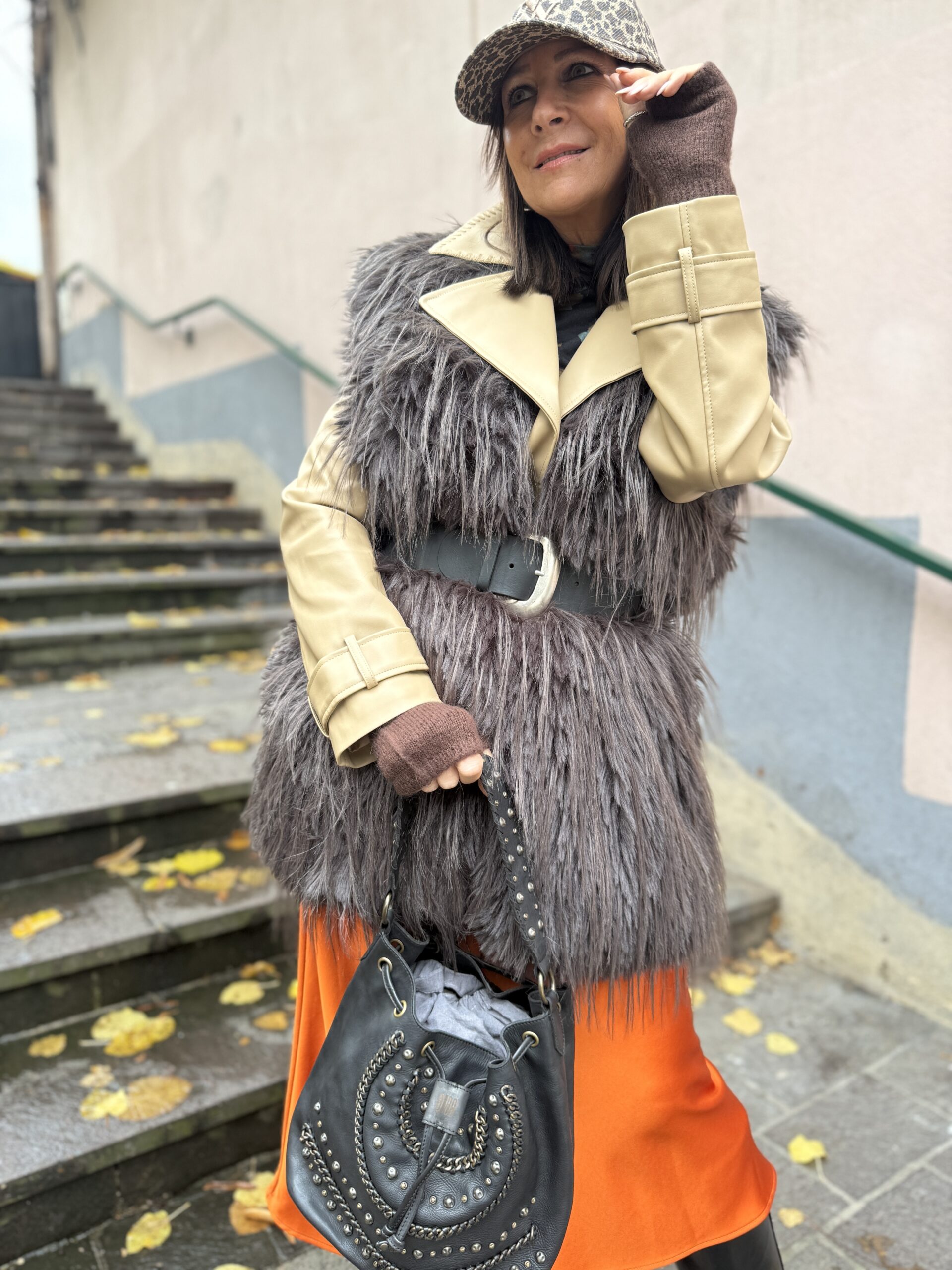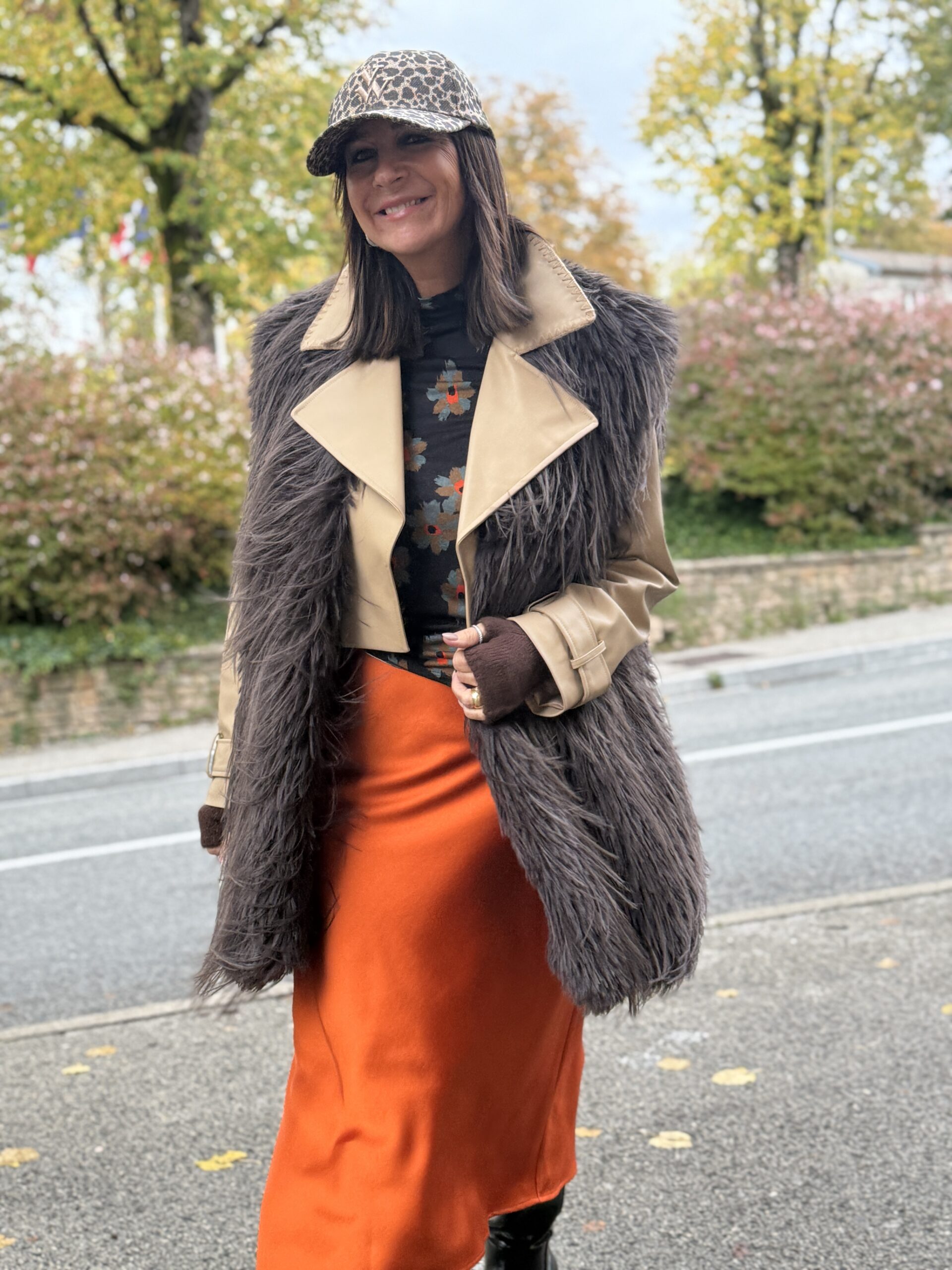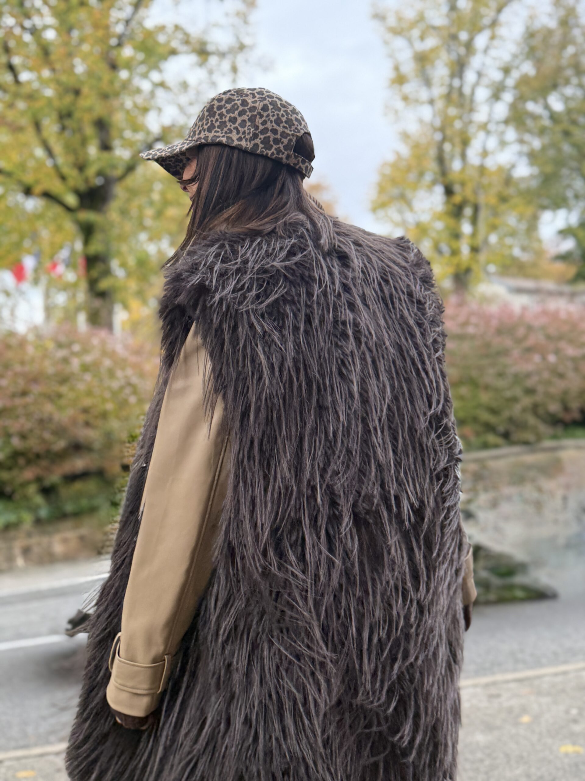 Ce manteau long en fausse fourrure peut se porter aussi bien sur une tenue chic que décontractée.