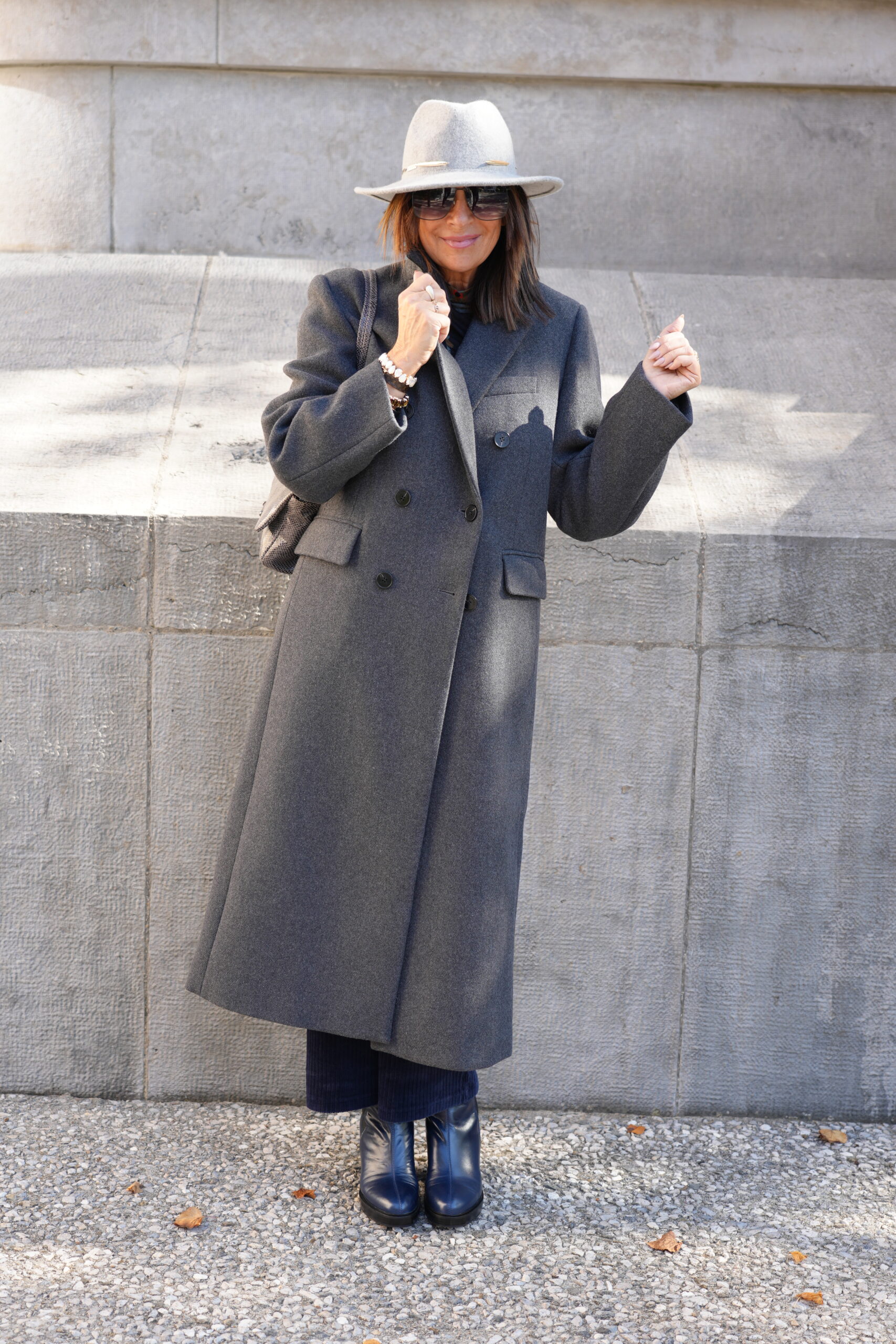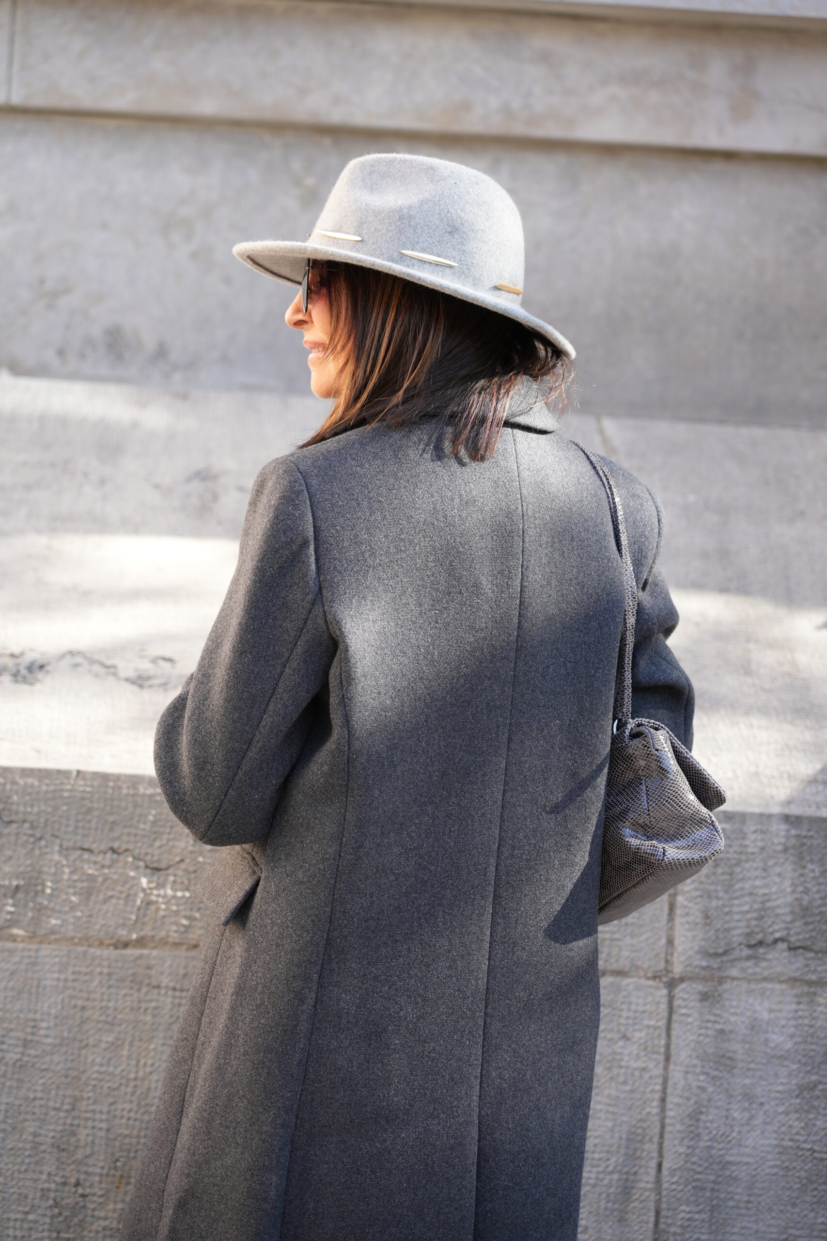 Ce manteau long en laine est la pièce phare de la saison. Avec sa courte oversize structurée et sa teinte grise anthracite il incarne le chic minimaliste à la française.