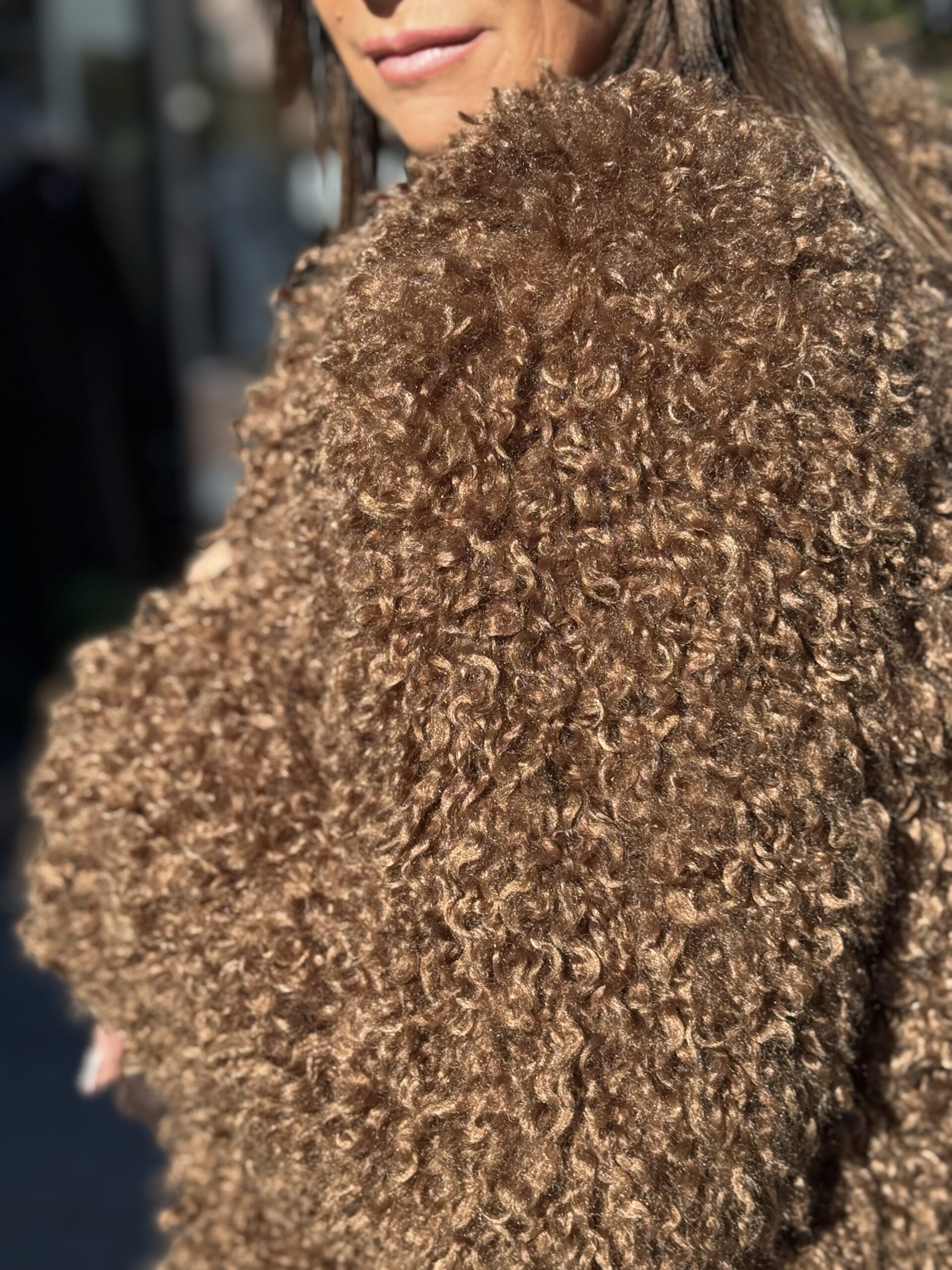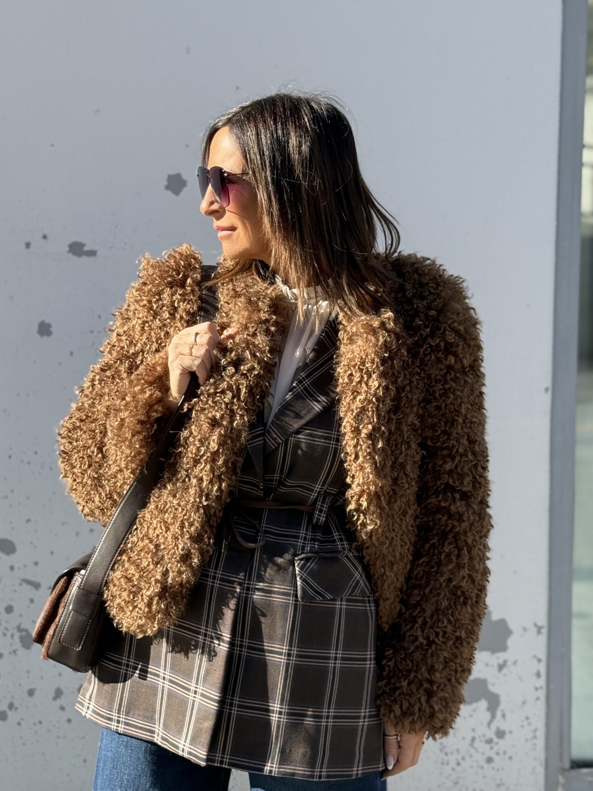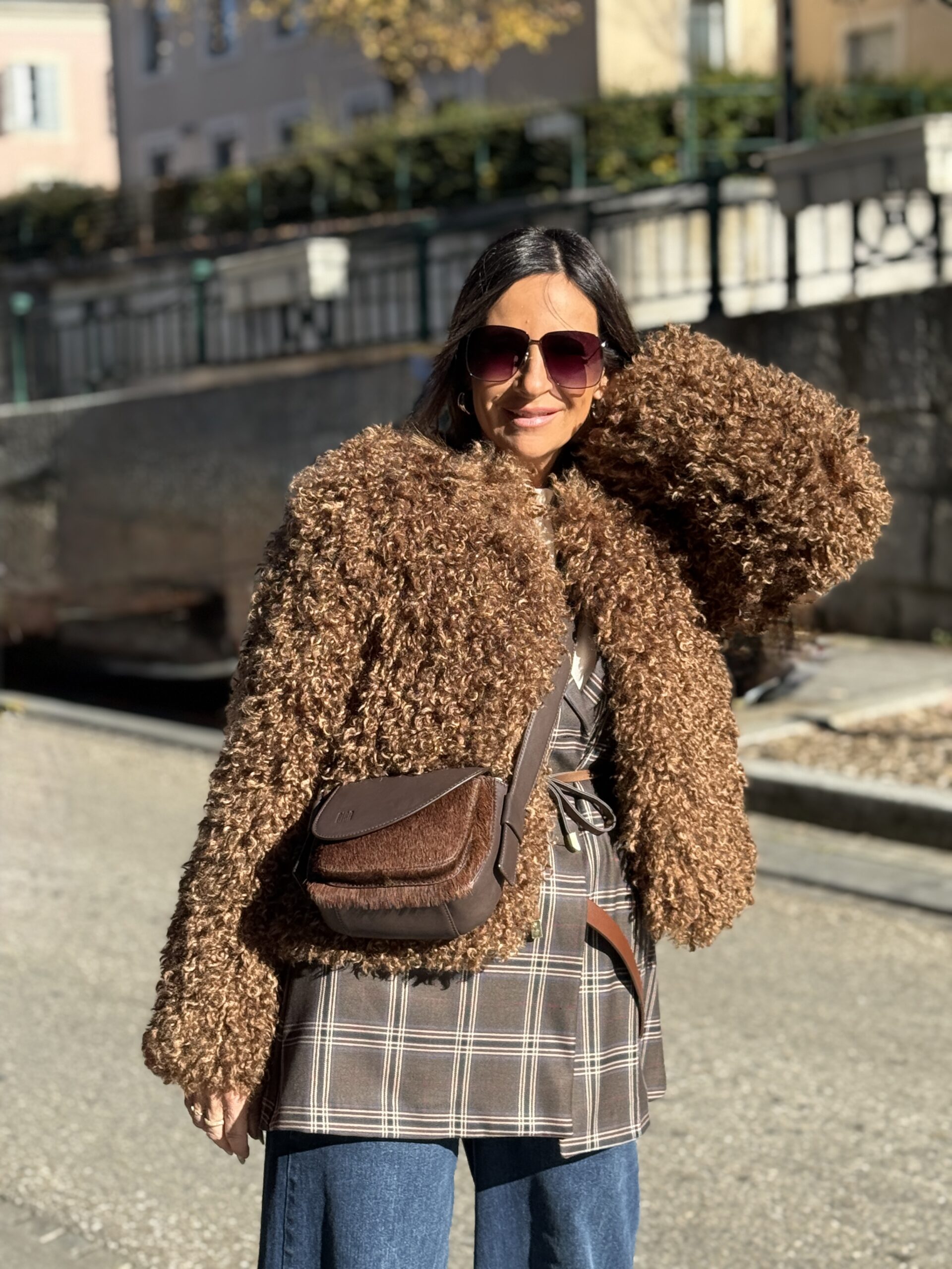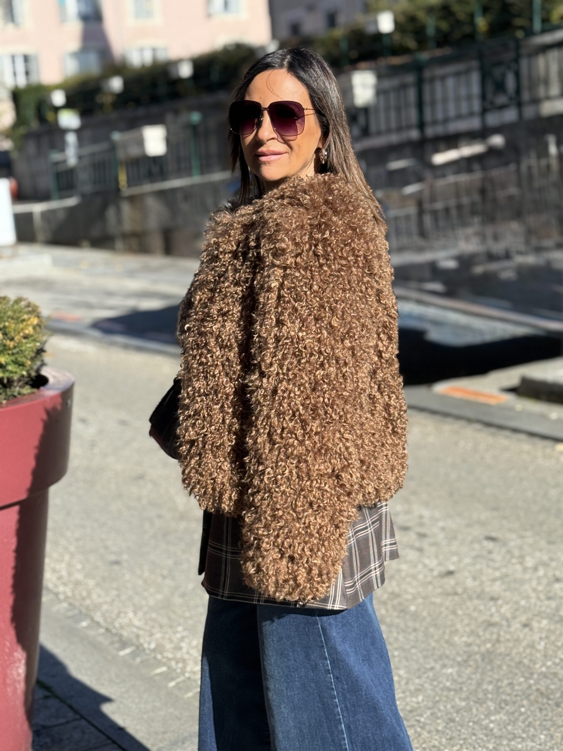 Cette veste en fausse fourrure bouclette camel allie confort, chaleur et style!