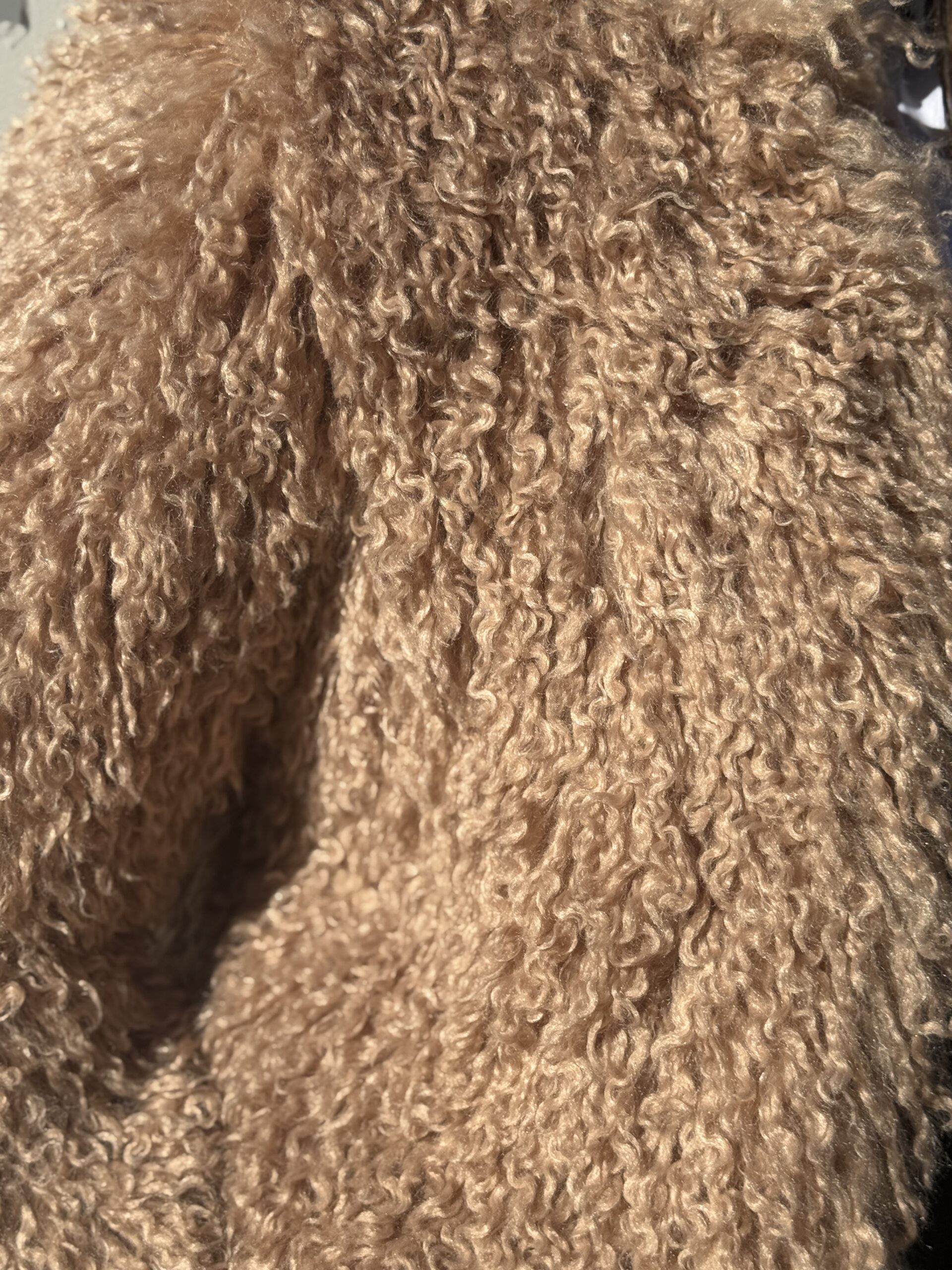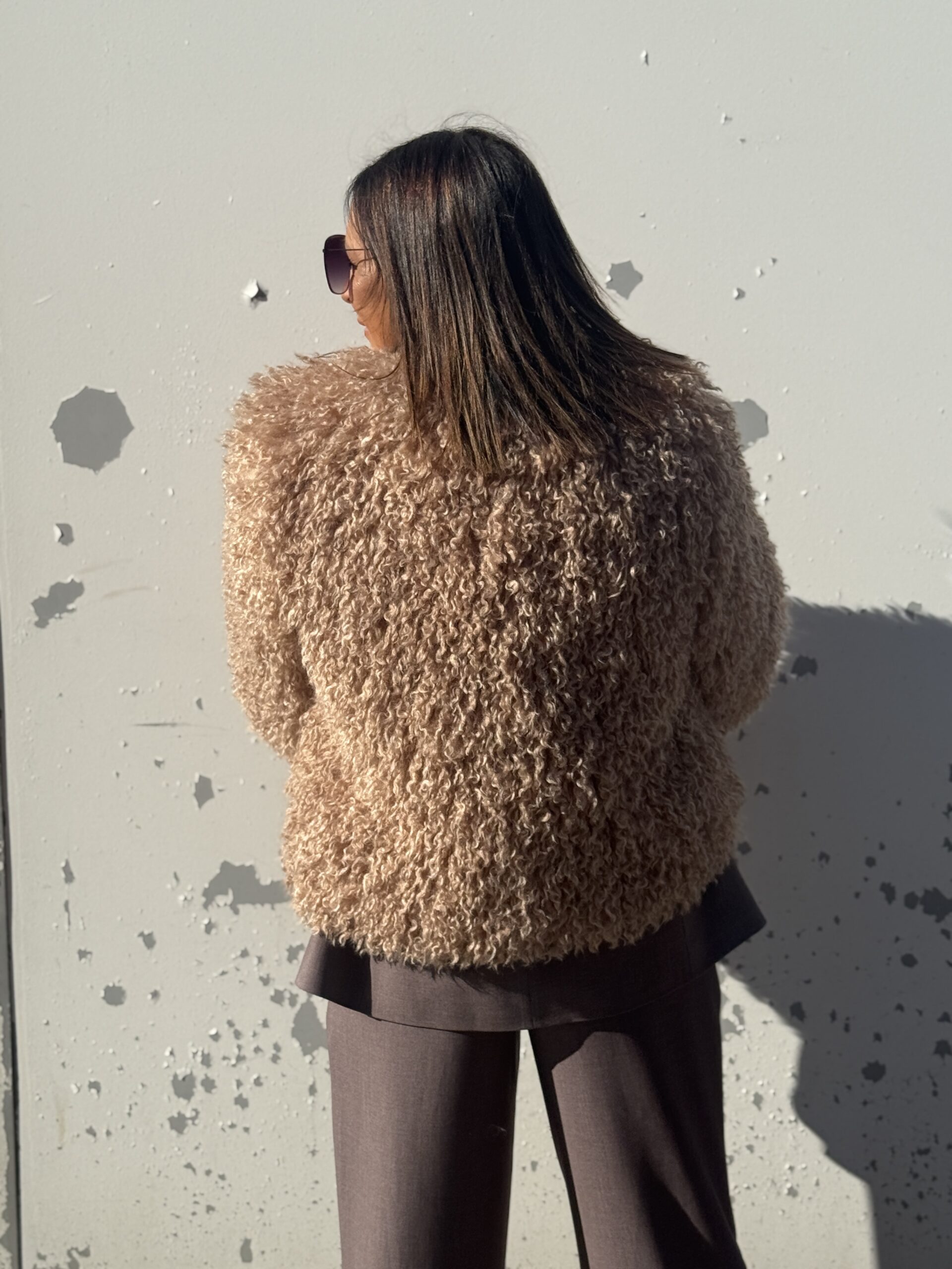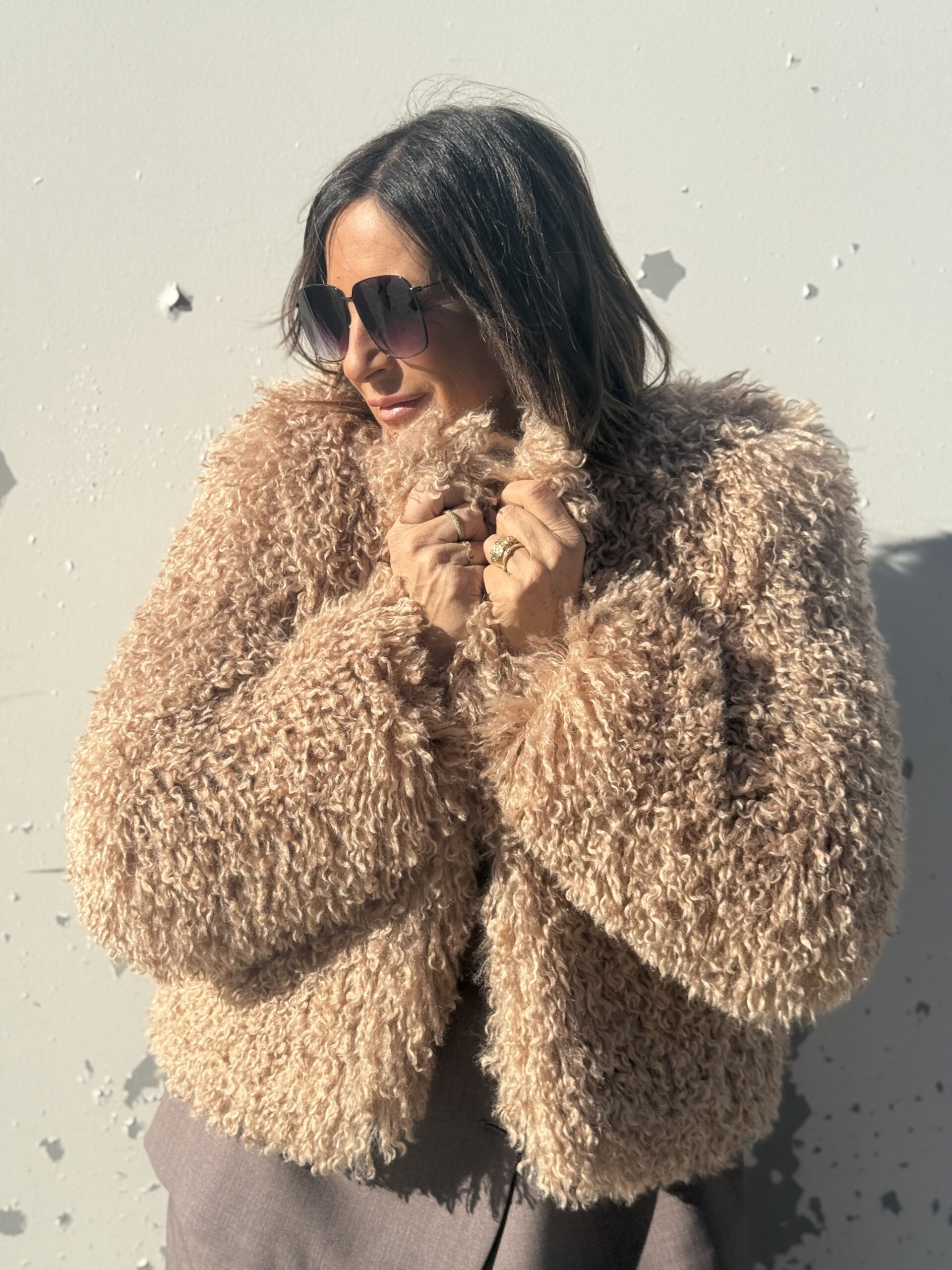 Cette veste en fausse fourrure bouclette nude allie confort, chaleur et style!