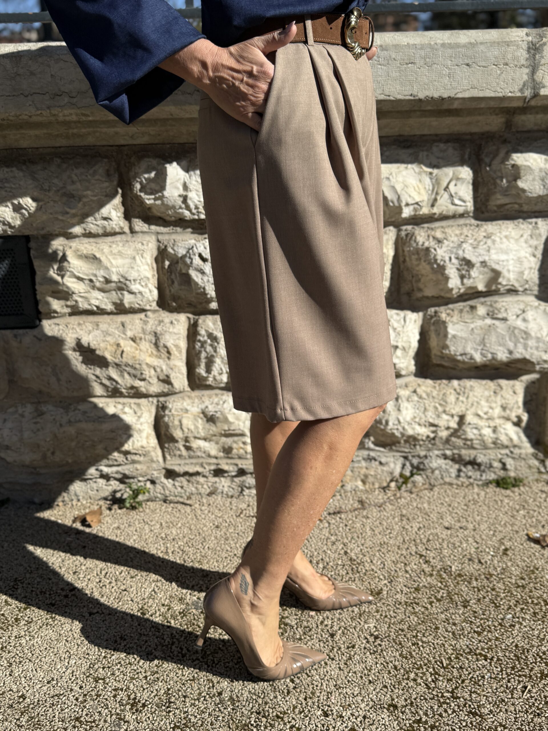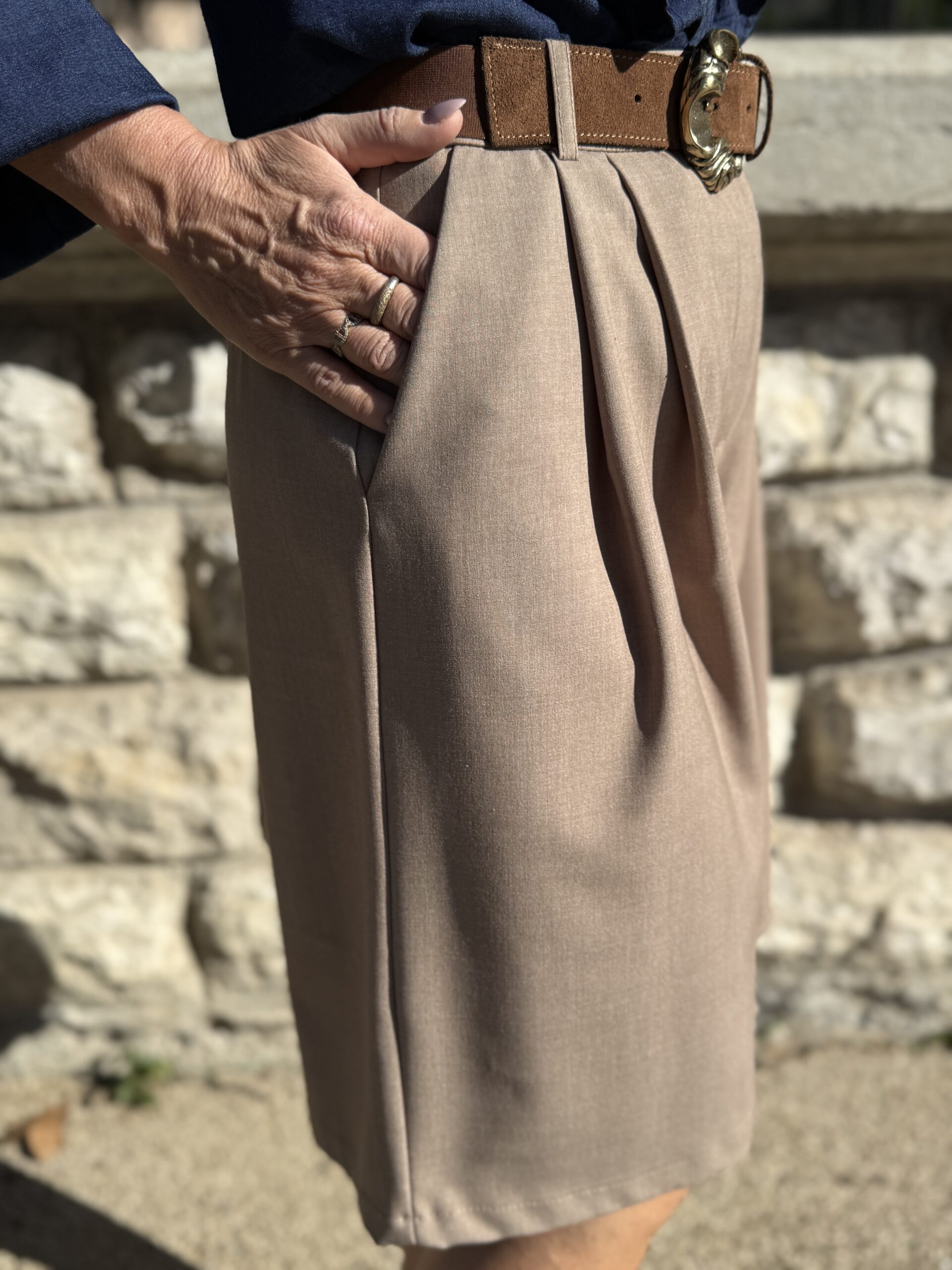 Conseil mode de Nathalie : Portez-le avec un chemisier fluide ou un top ajusté pour équilibrer la silhouette.
