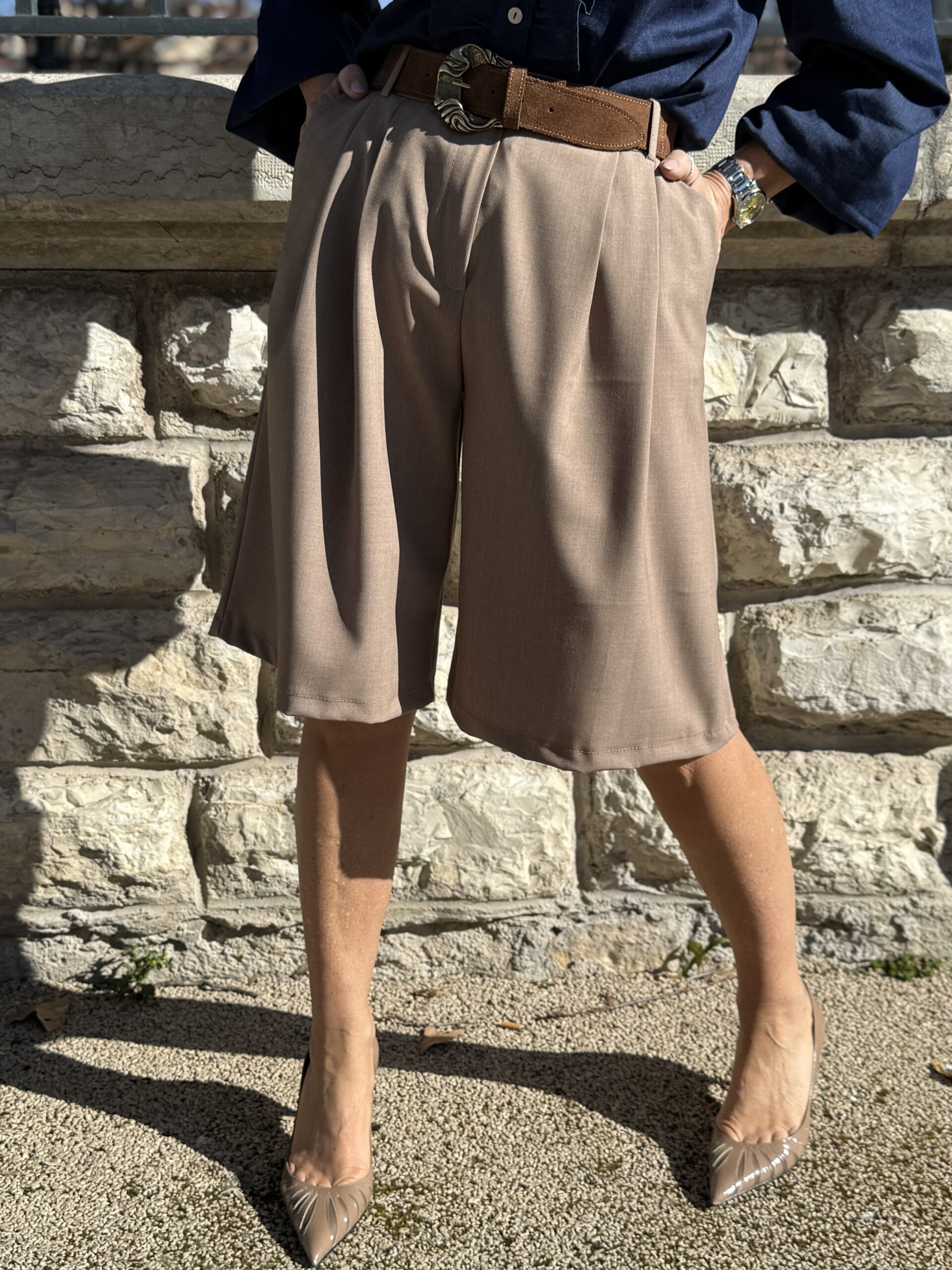 Bermuda fluide à la coupe ample dans un camel intemporel, parfait pour un silhouette élégante et moderne aux beaux jours.