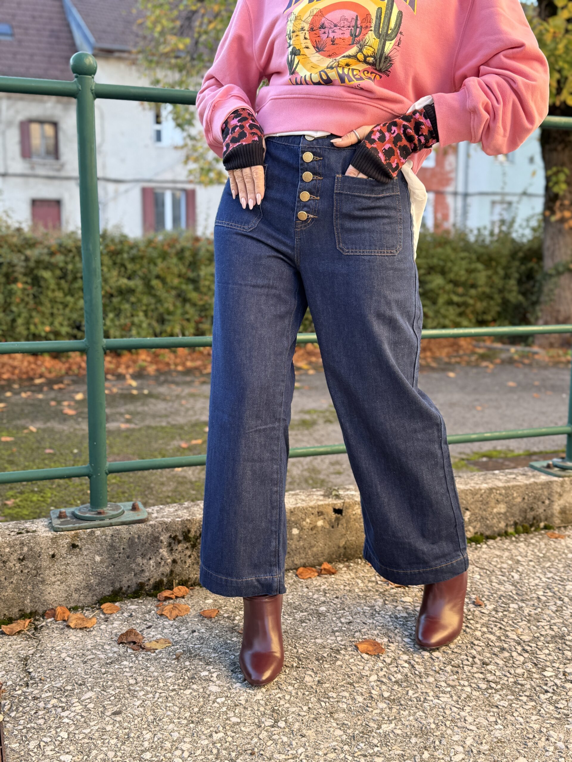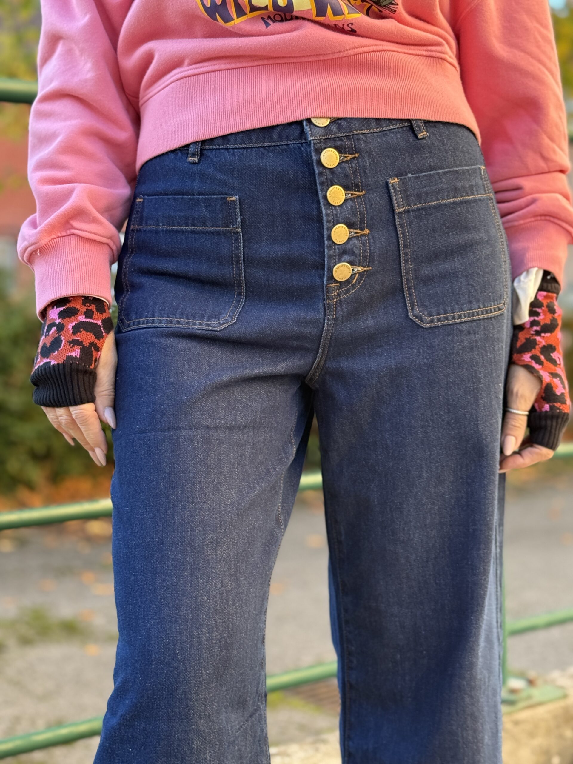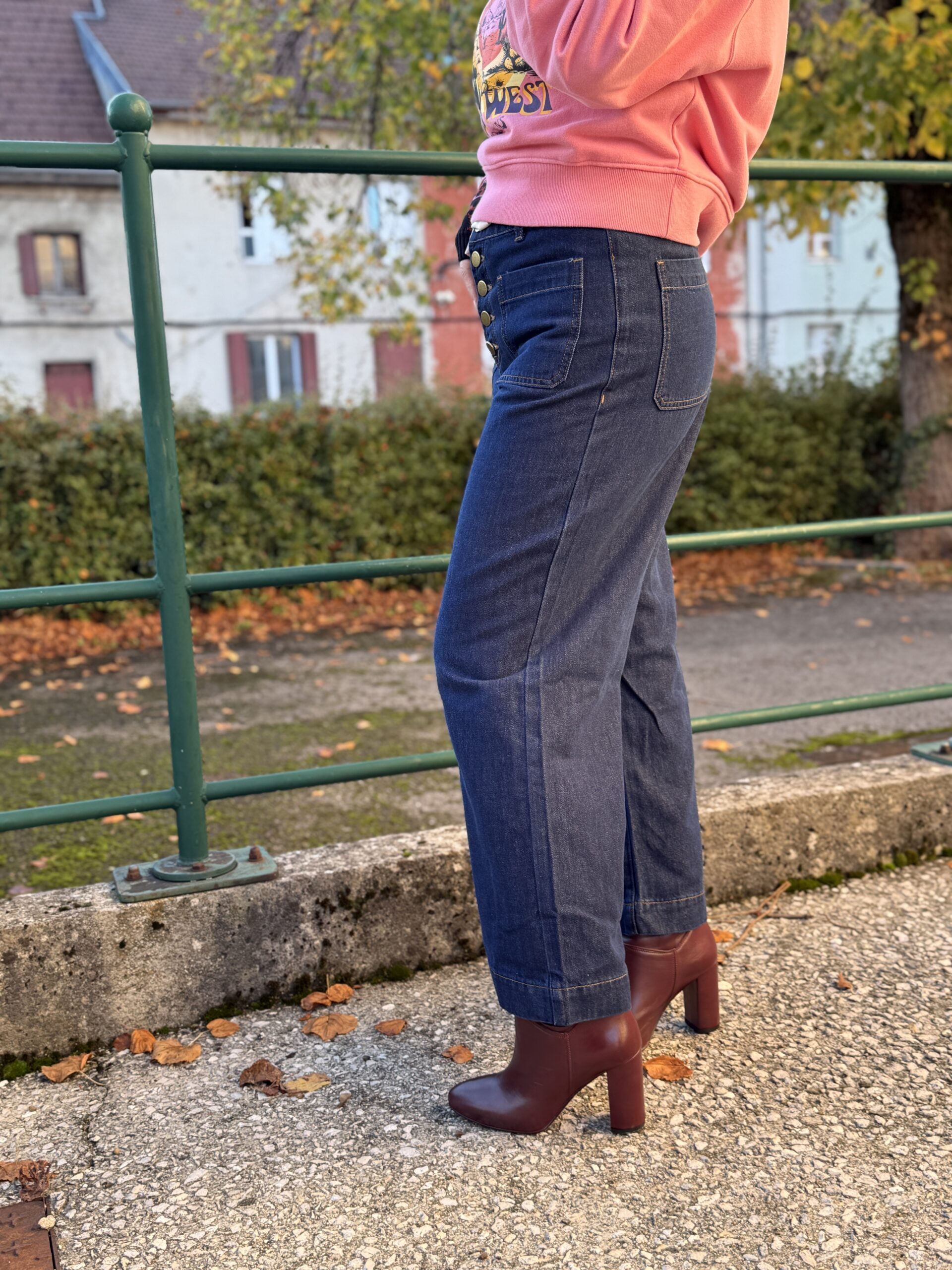 Ce jeans en denim brut revisite le style vintage avec une coupe droite légèrement évasée et une taille haute mise en valeur par une rangée de boutons apparents !