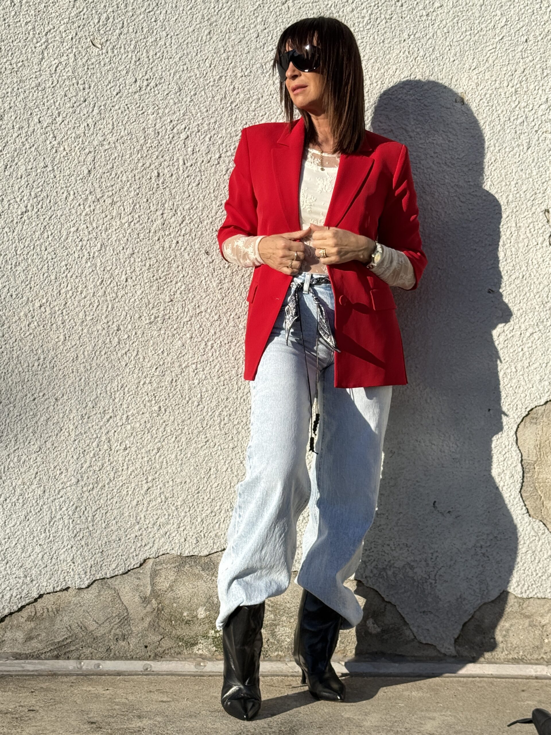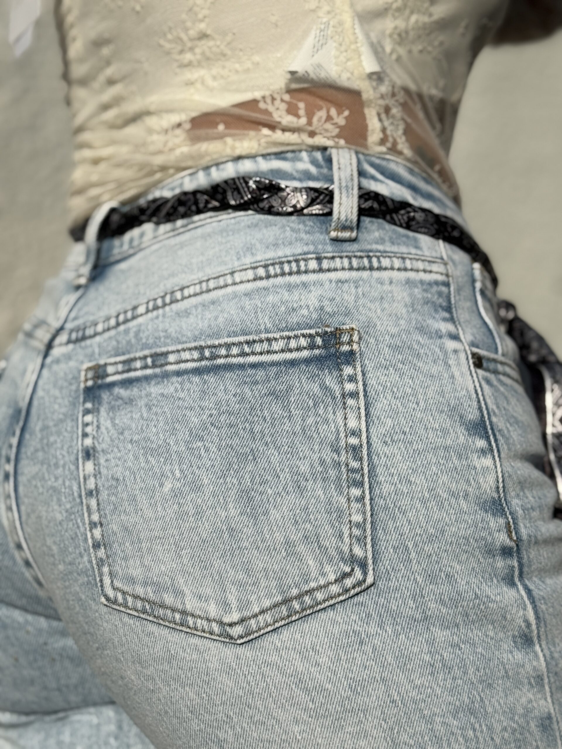 Jean denim bleu clair à la coupe ample pour une silhouette moderne et décontractée. Son détail distinctif : Une ceinture bandana intégrée qui apporte une touche originale et stylée. Le bas légèrement effiloché renforce l’esprit casual et actuel.