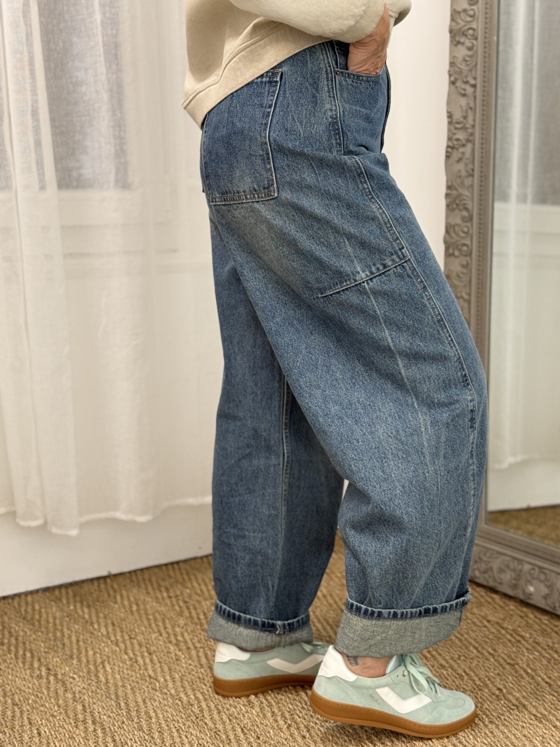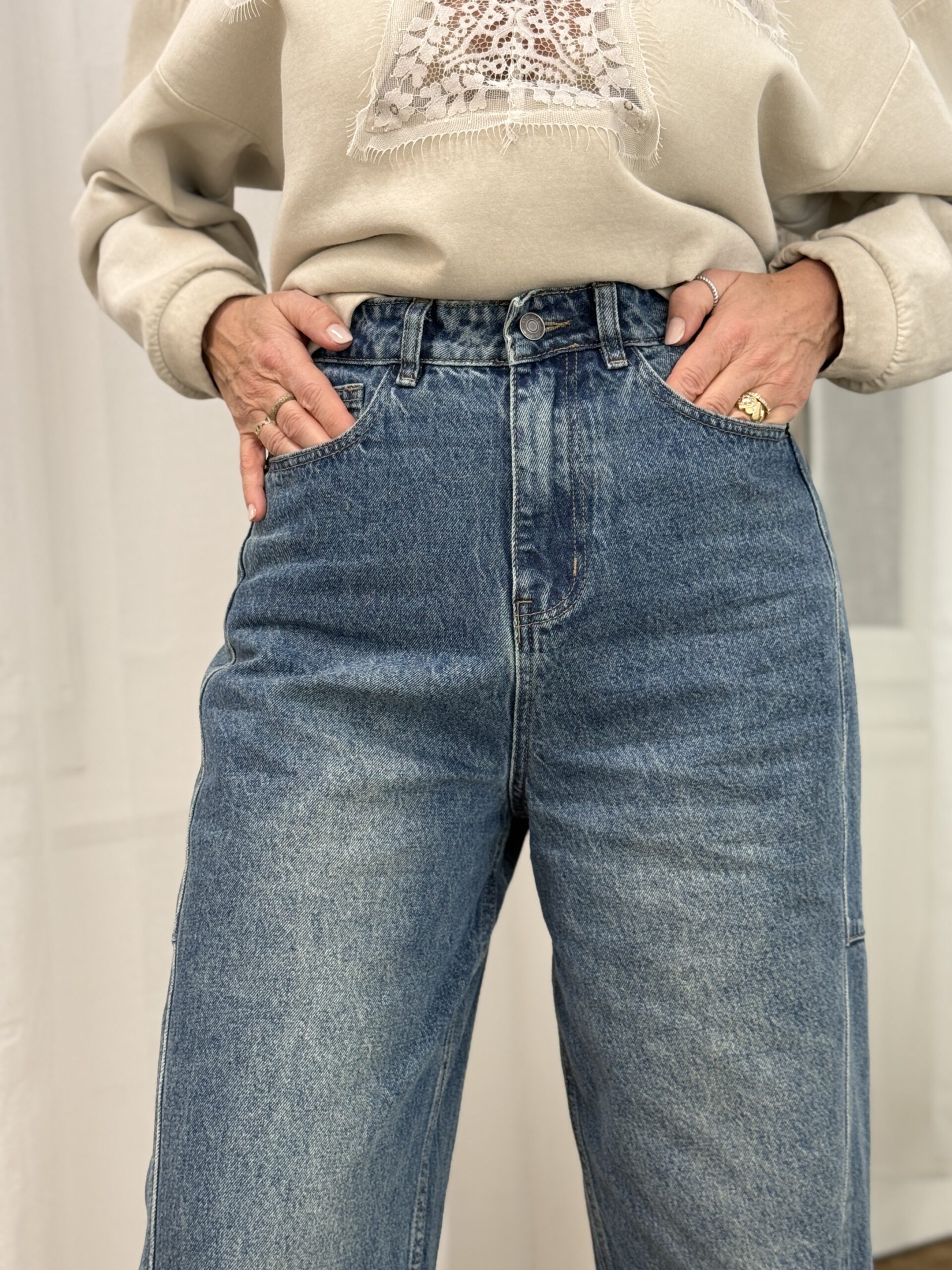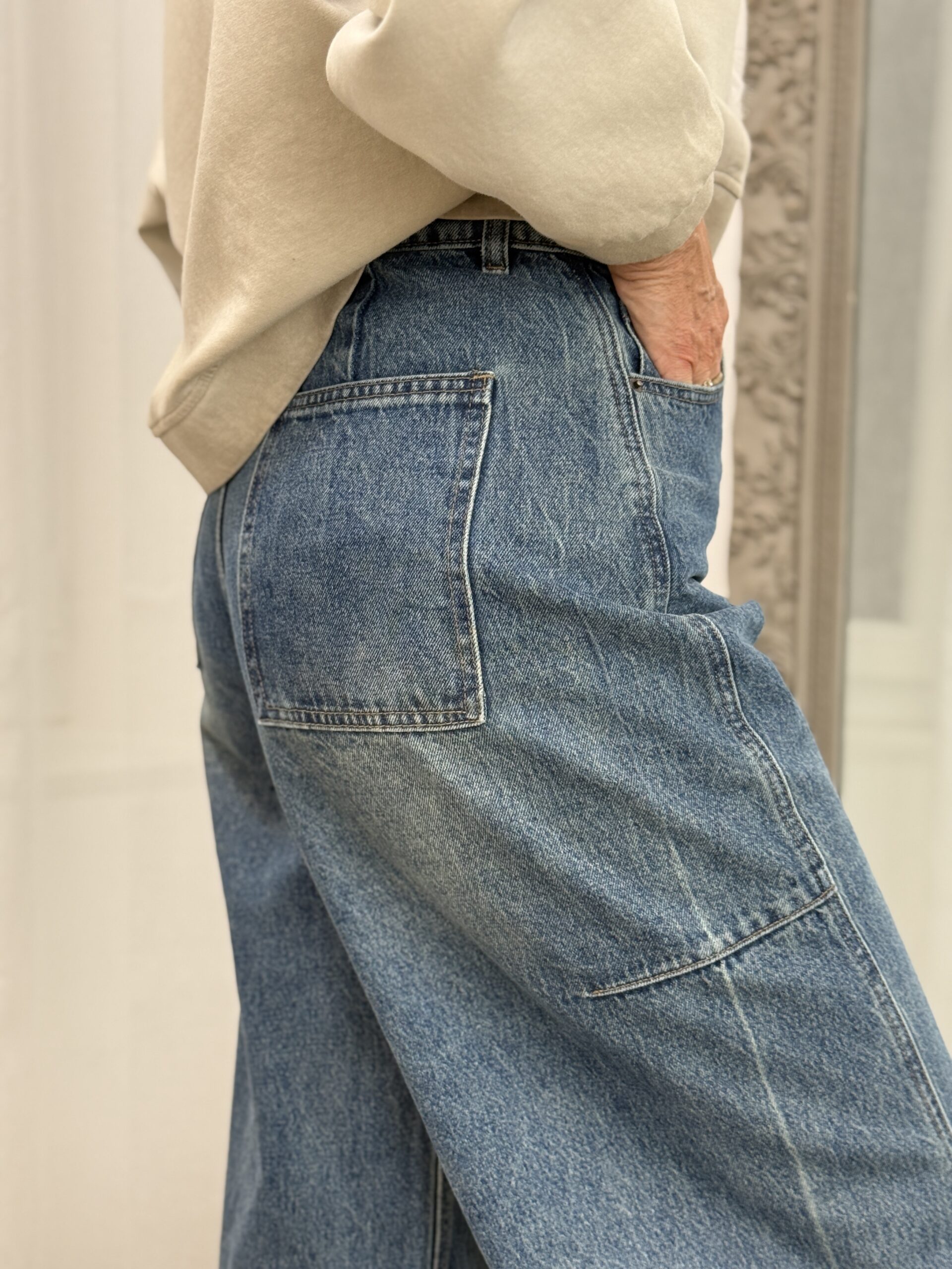 Jean denim bleu à coupe ample offrant un tombé décontracté et confortable. Sa construction avec découpes structurées apporte une silhouette moderne et du caractère. Idéal pour un look casual ou streetwear.