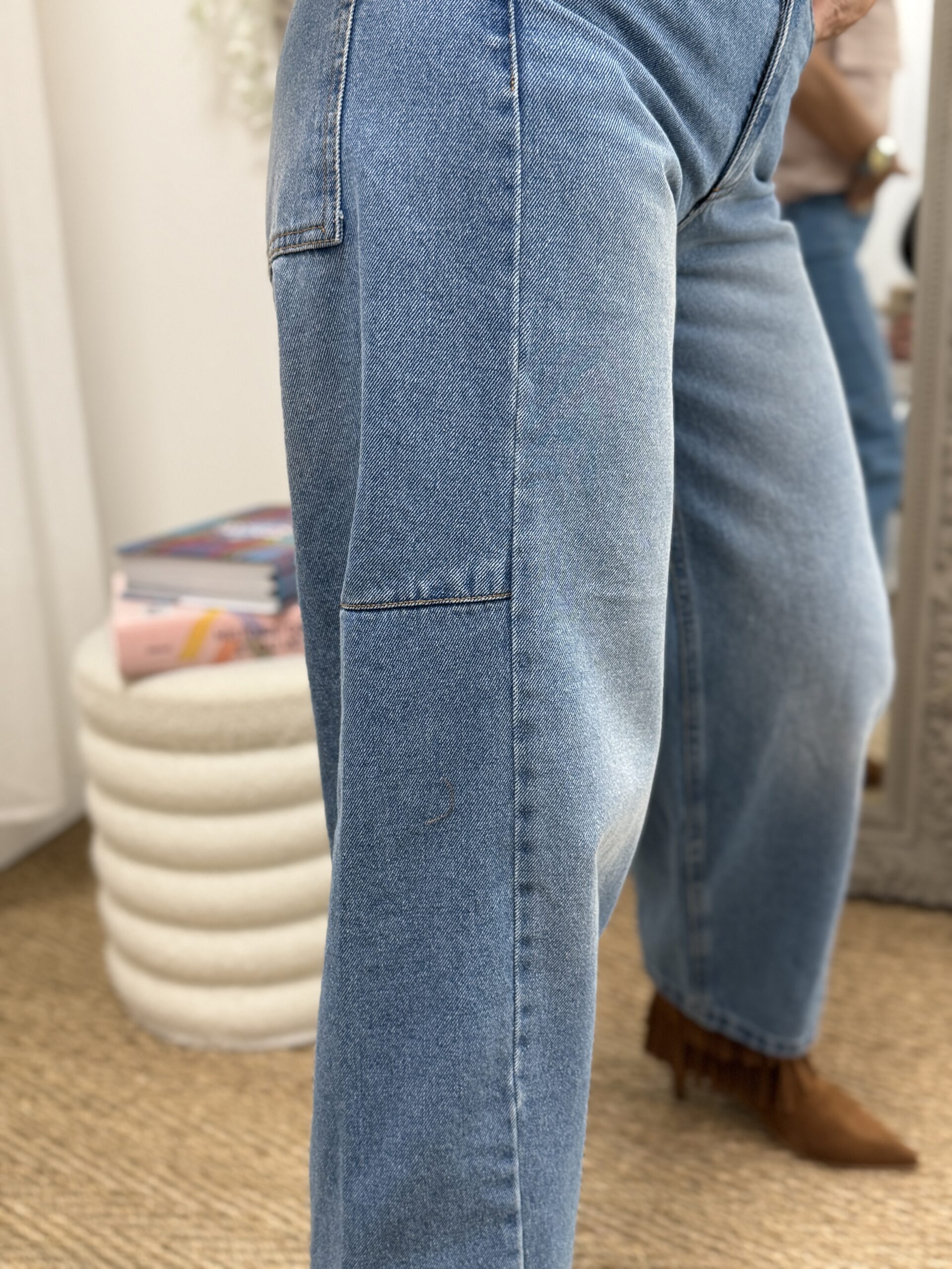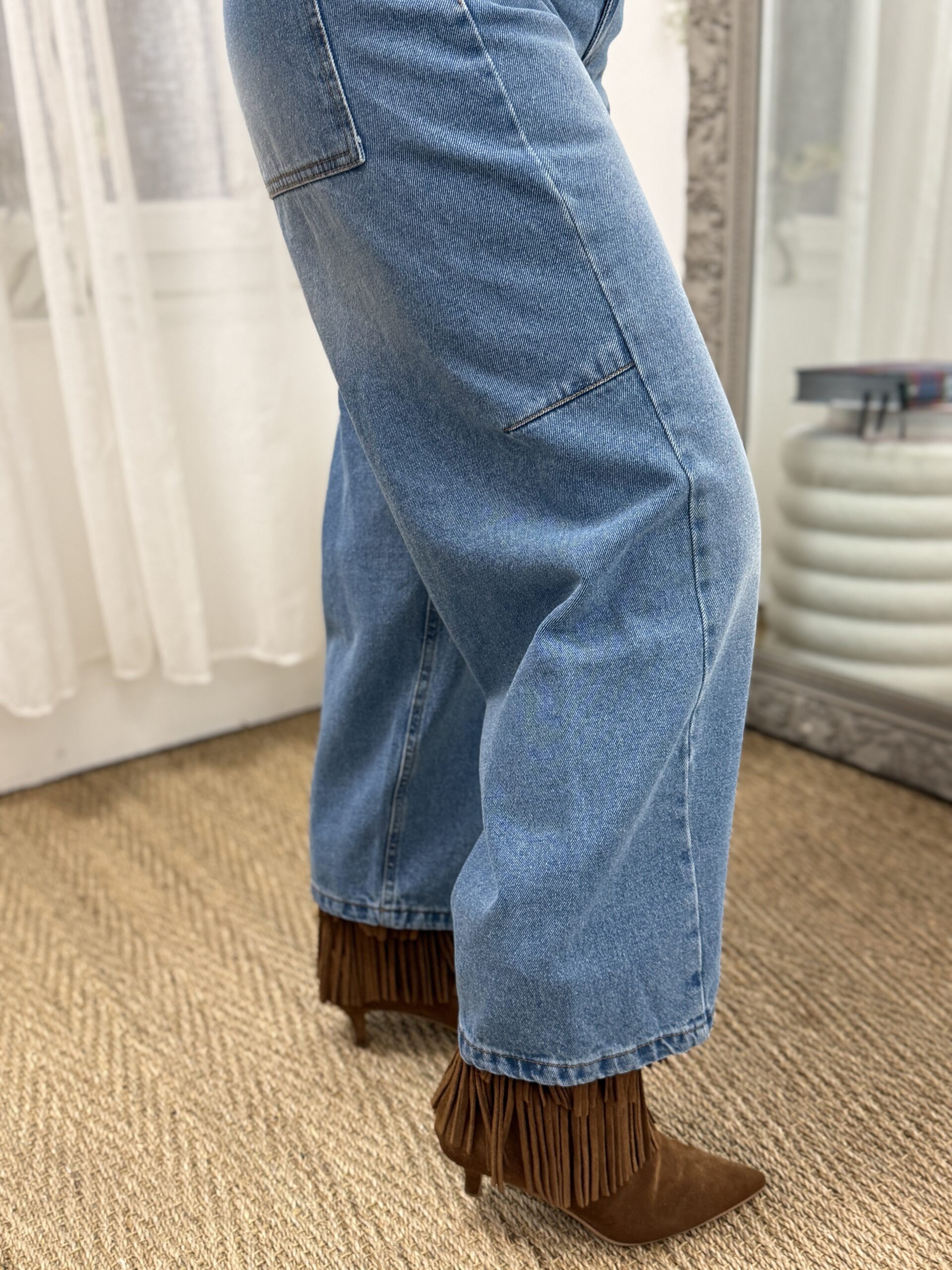 Jean à la forme barrel ultra tendance, caractérisé par une jambe légèrement arrondie qui structure la silhouette avec modernité. Son denim bleu à l’effet légèrement délavé apporte une touche casual et authentique.