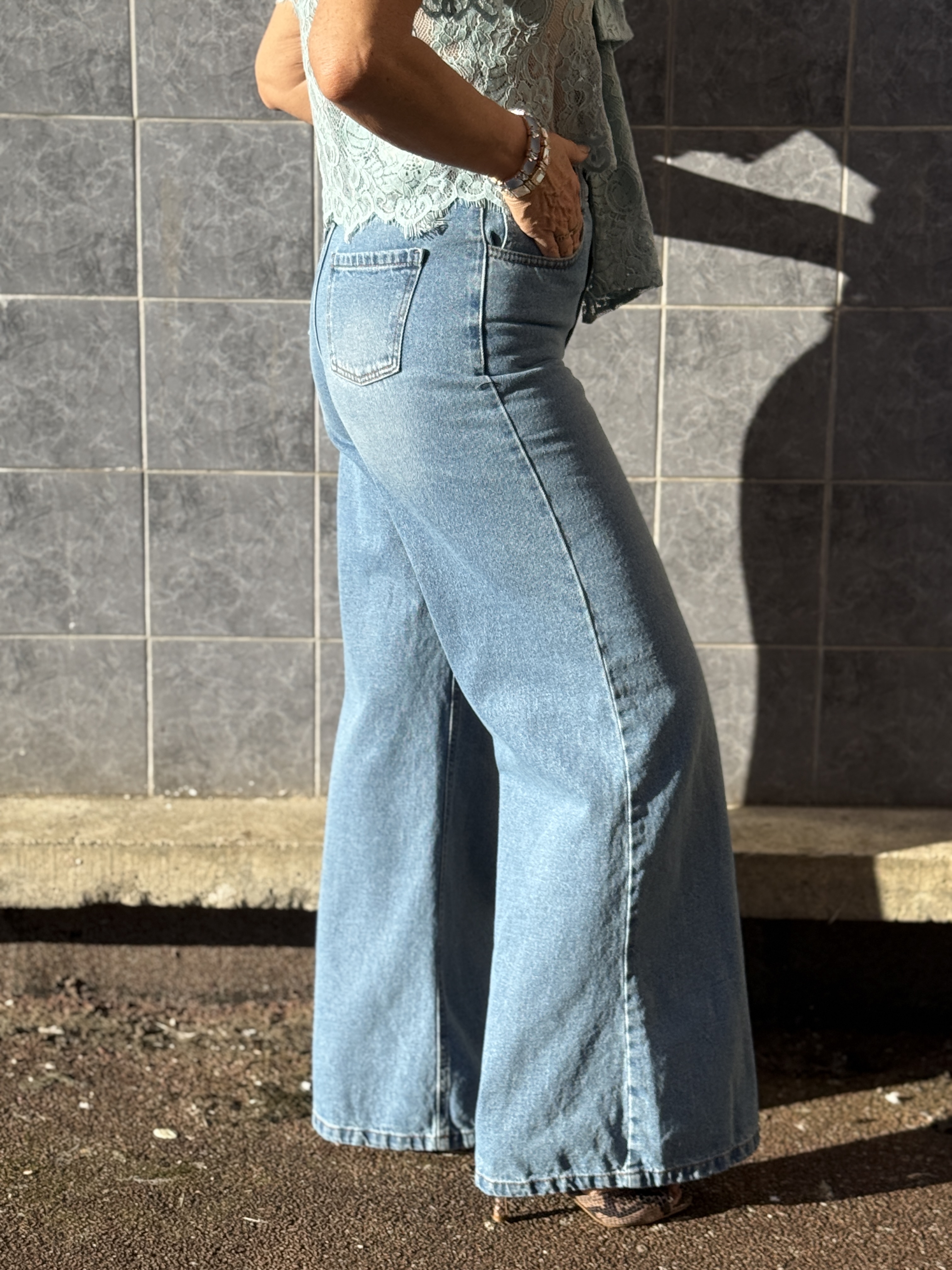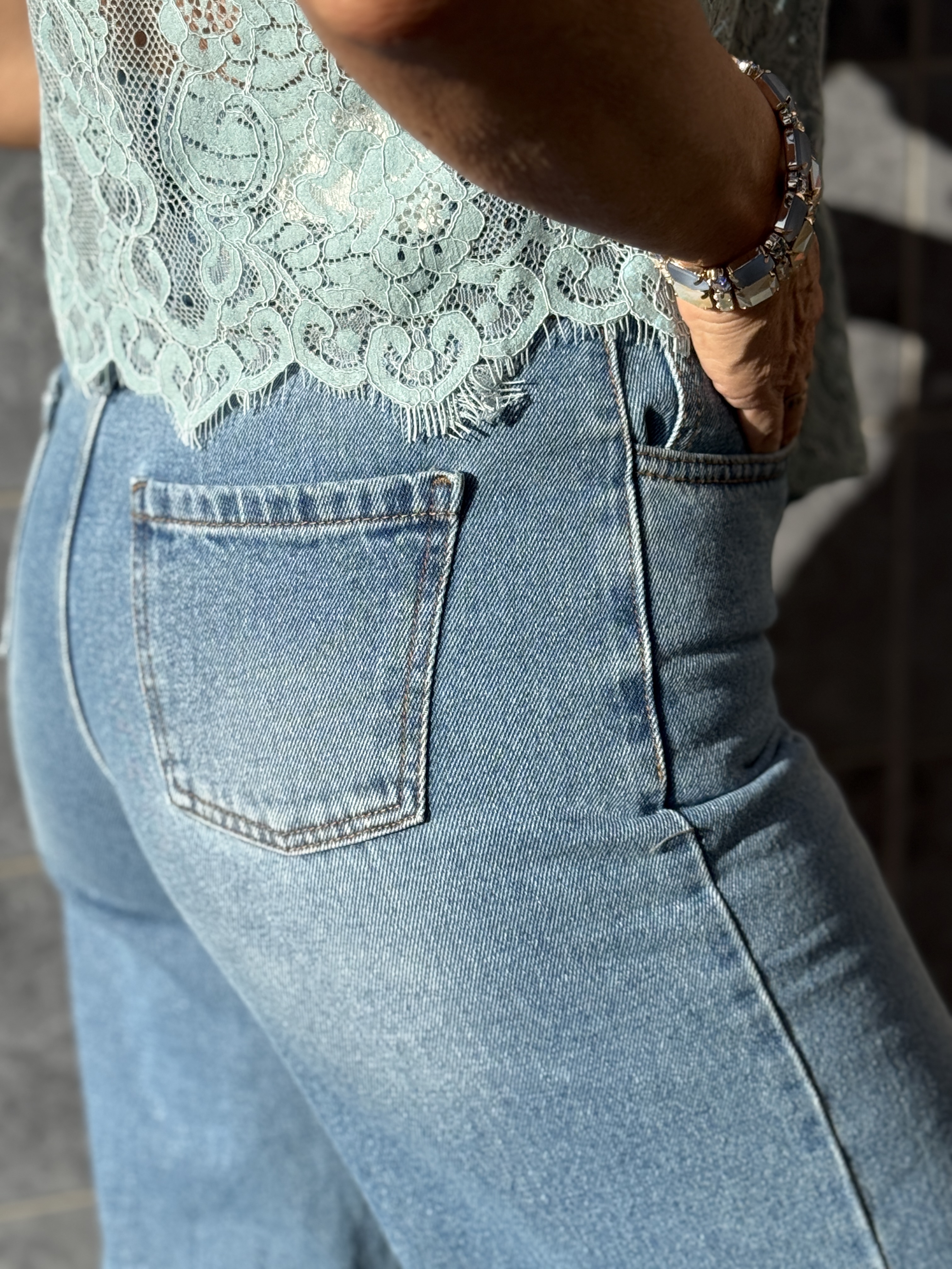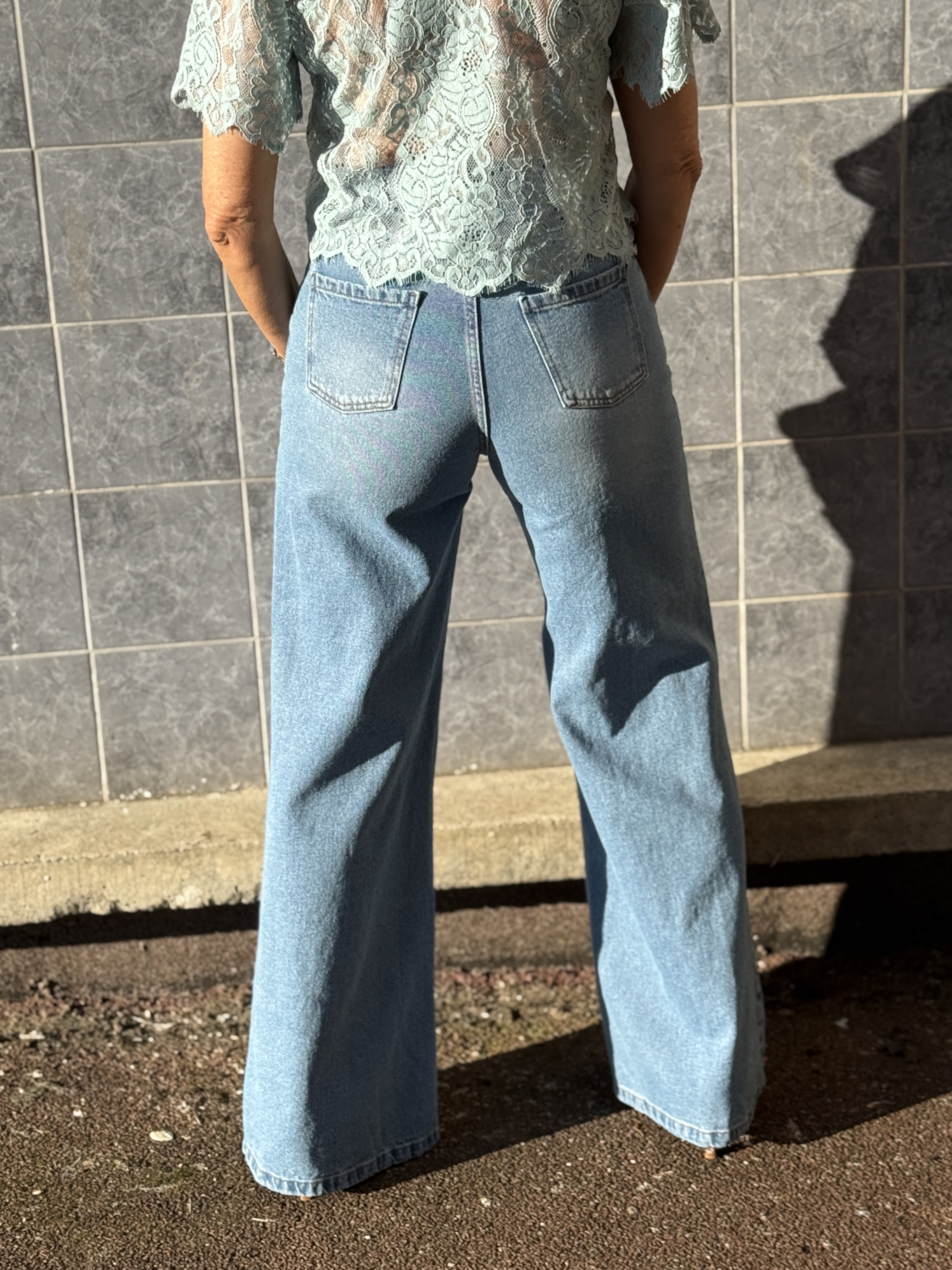 Jean bleu clair à la coupe droite avec taille croisée originale. Moderne et structuré, il apporte une touche tendance à un basique intemporel.