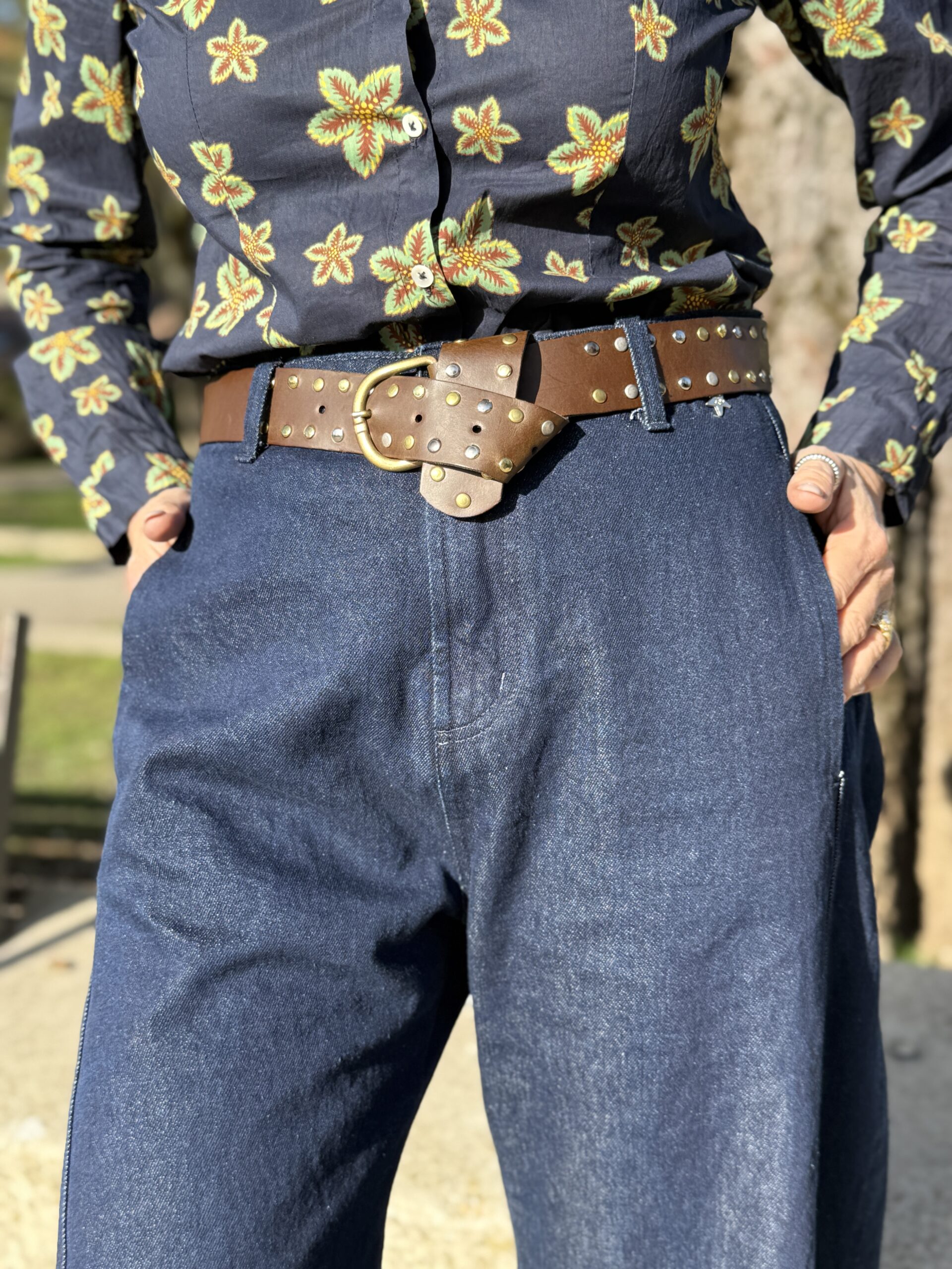Jean en denim brut à la coupe contemporaine, alliant structure et caractère. Son design épuré est rehaussé par une ceinture décoratif cloutée qui apporte une touche affirmée et moderne.