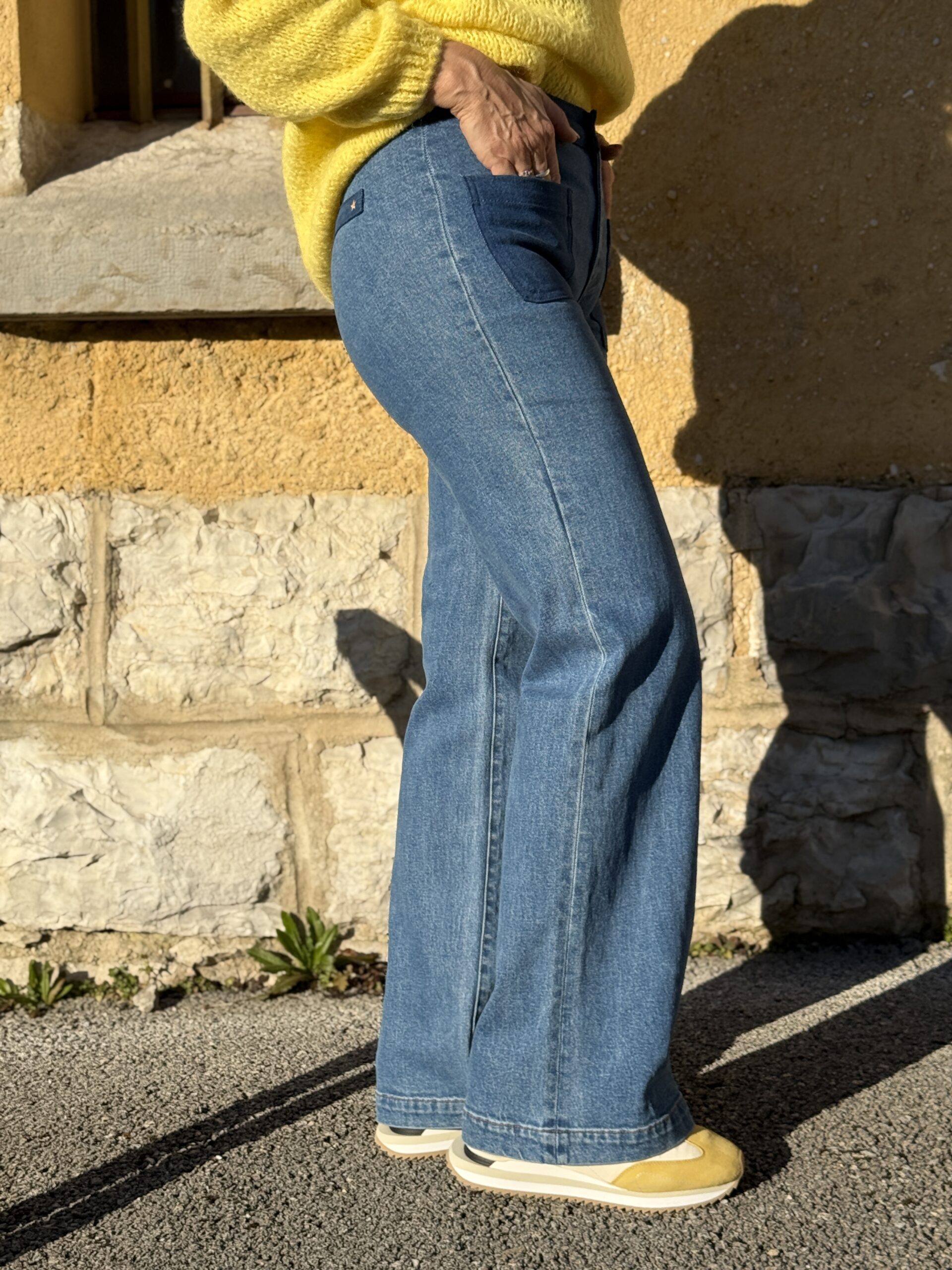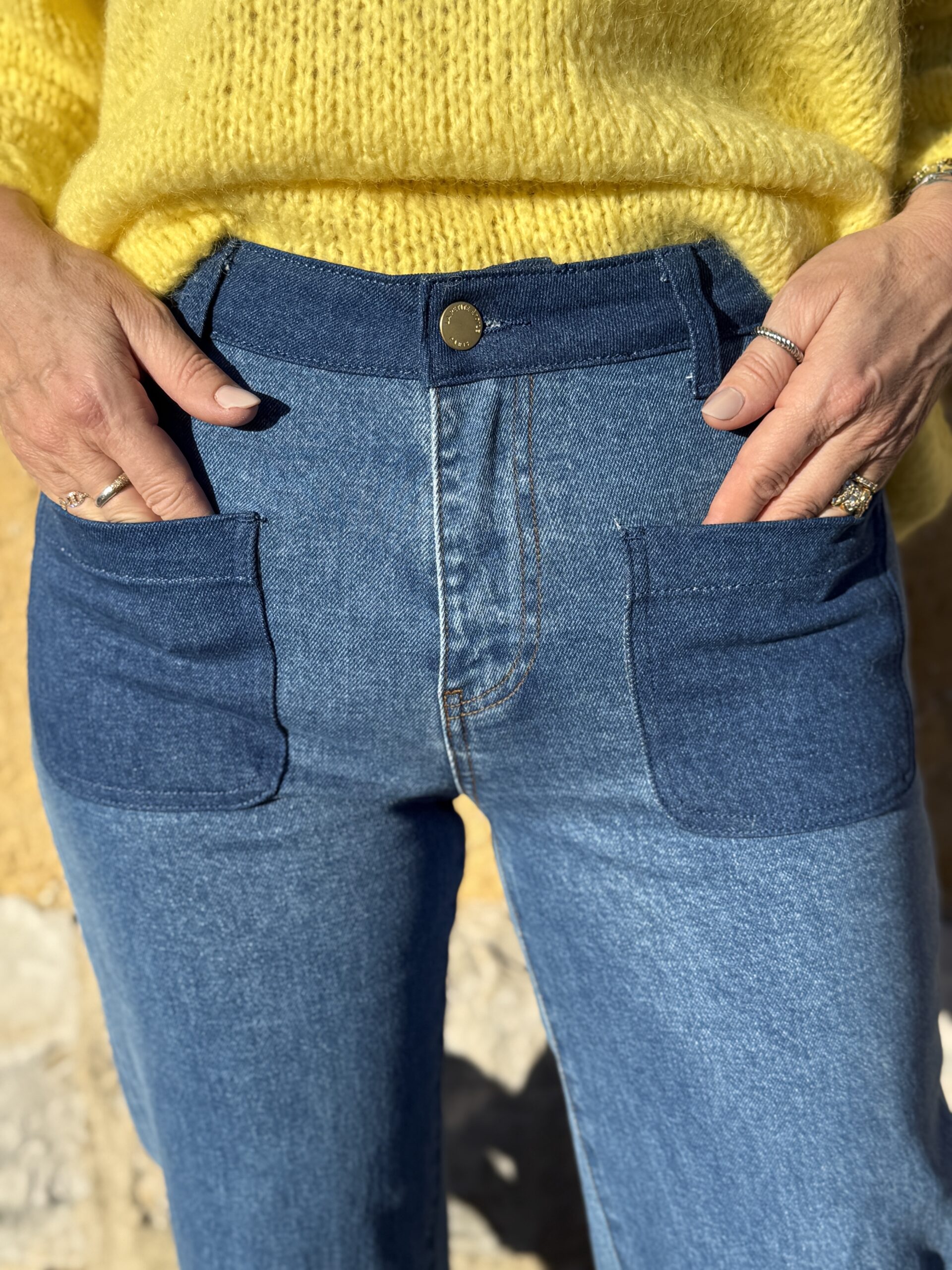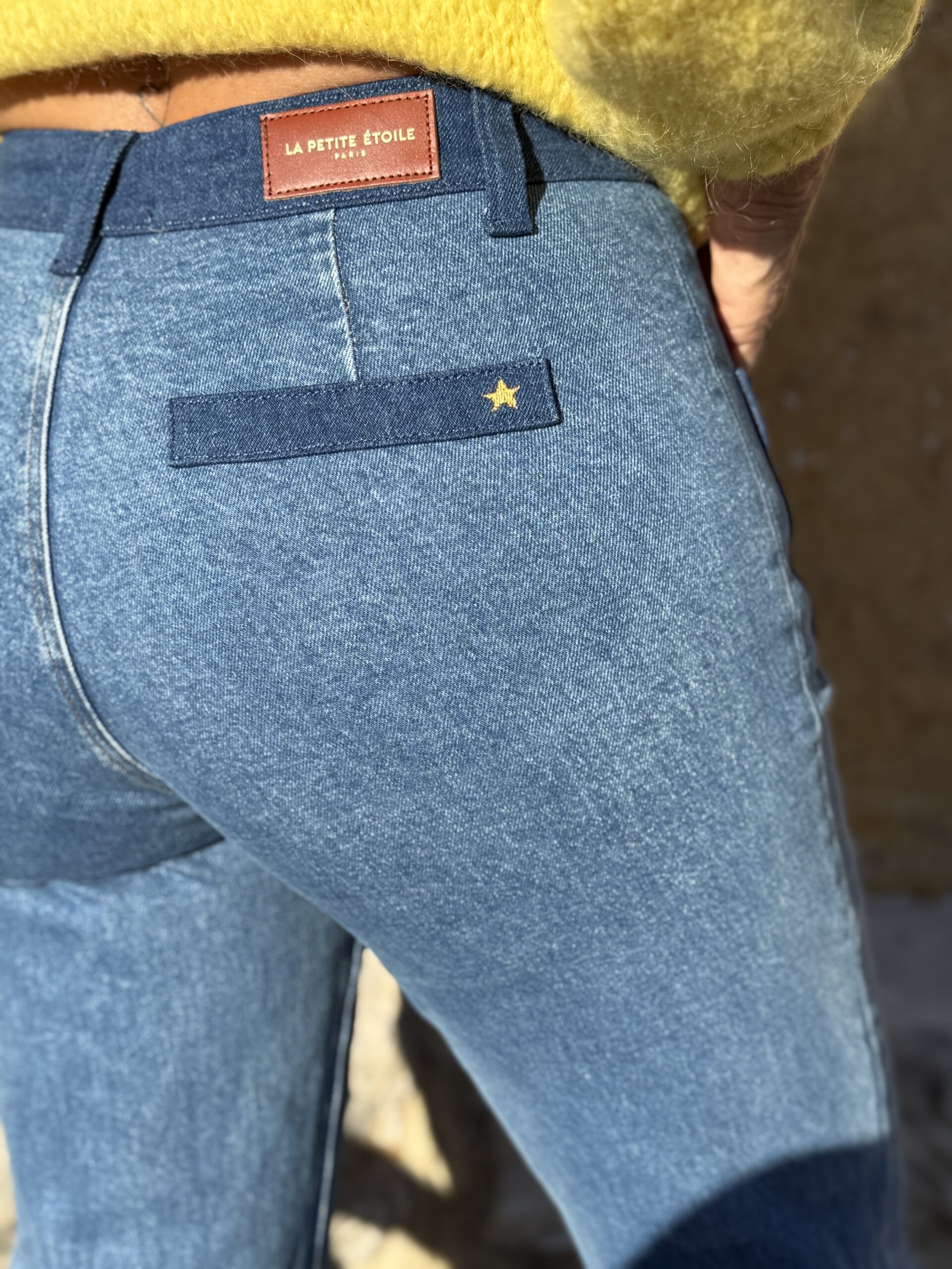 Sonnya, le jean stone à coupe flare et taille haute, ajusté aux hanches et évasé sur les jambes avec ceinture et poches en denim contrastées.