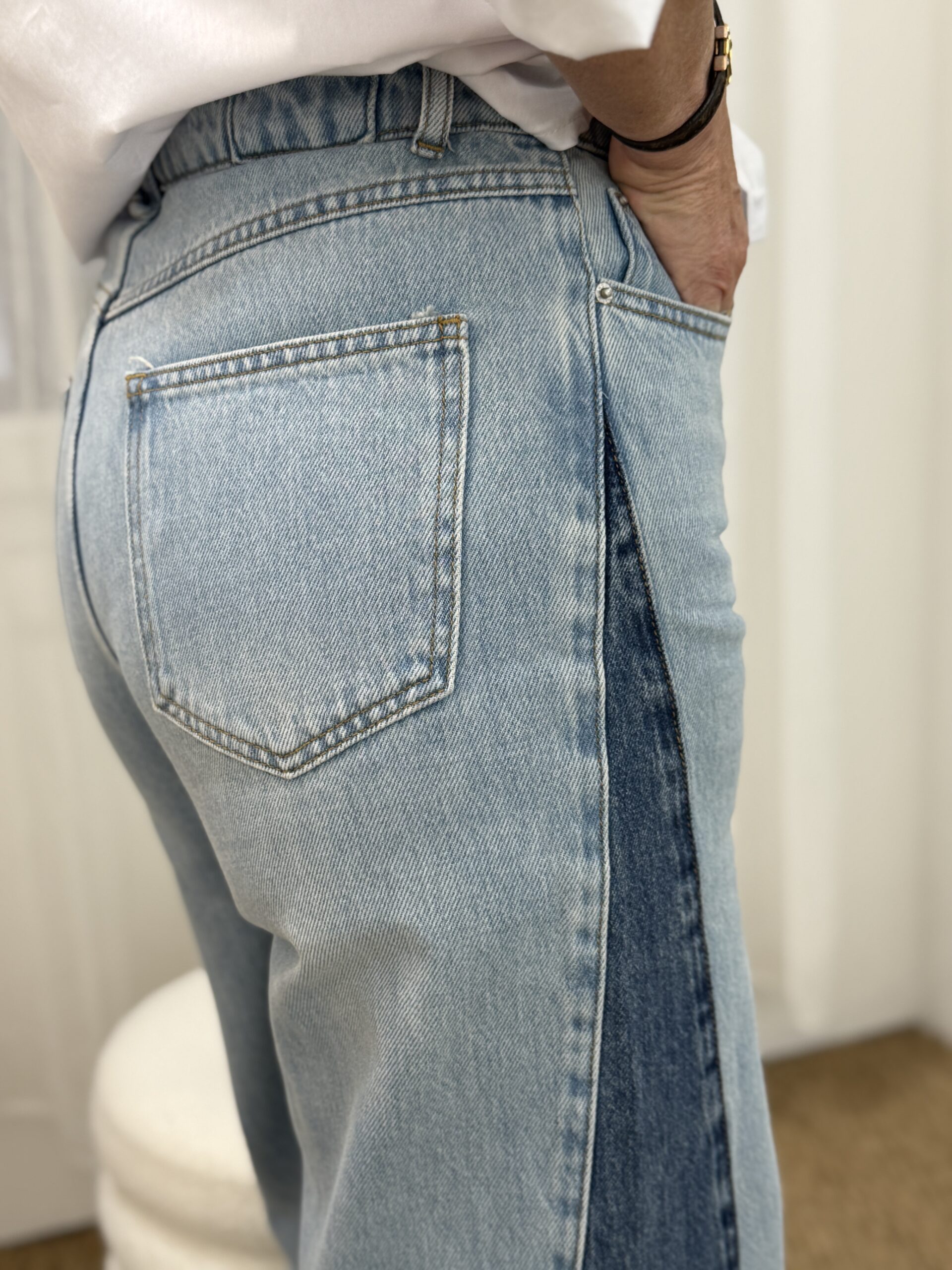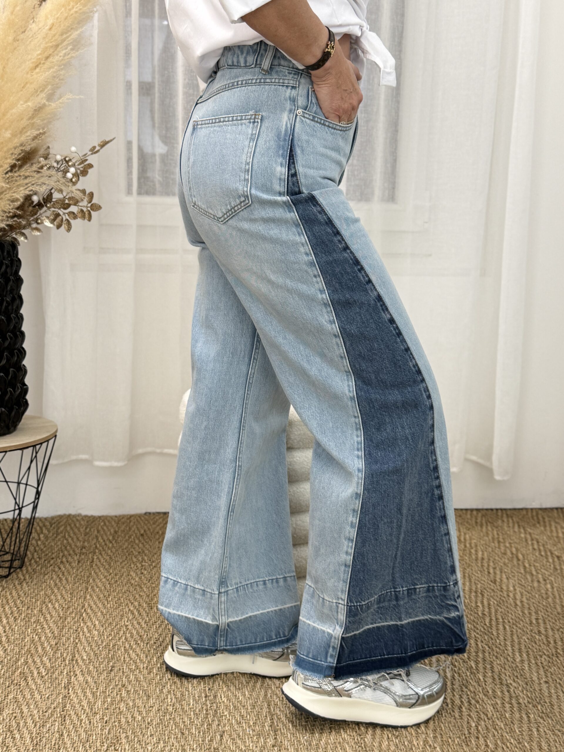 Jean denim 100 % coton au design contemporain. Scoupe large et droite allonge la silhouette tandis que les empiècements en denim contrastant apportent une touche graphique et moderne.