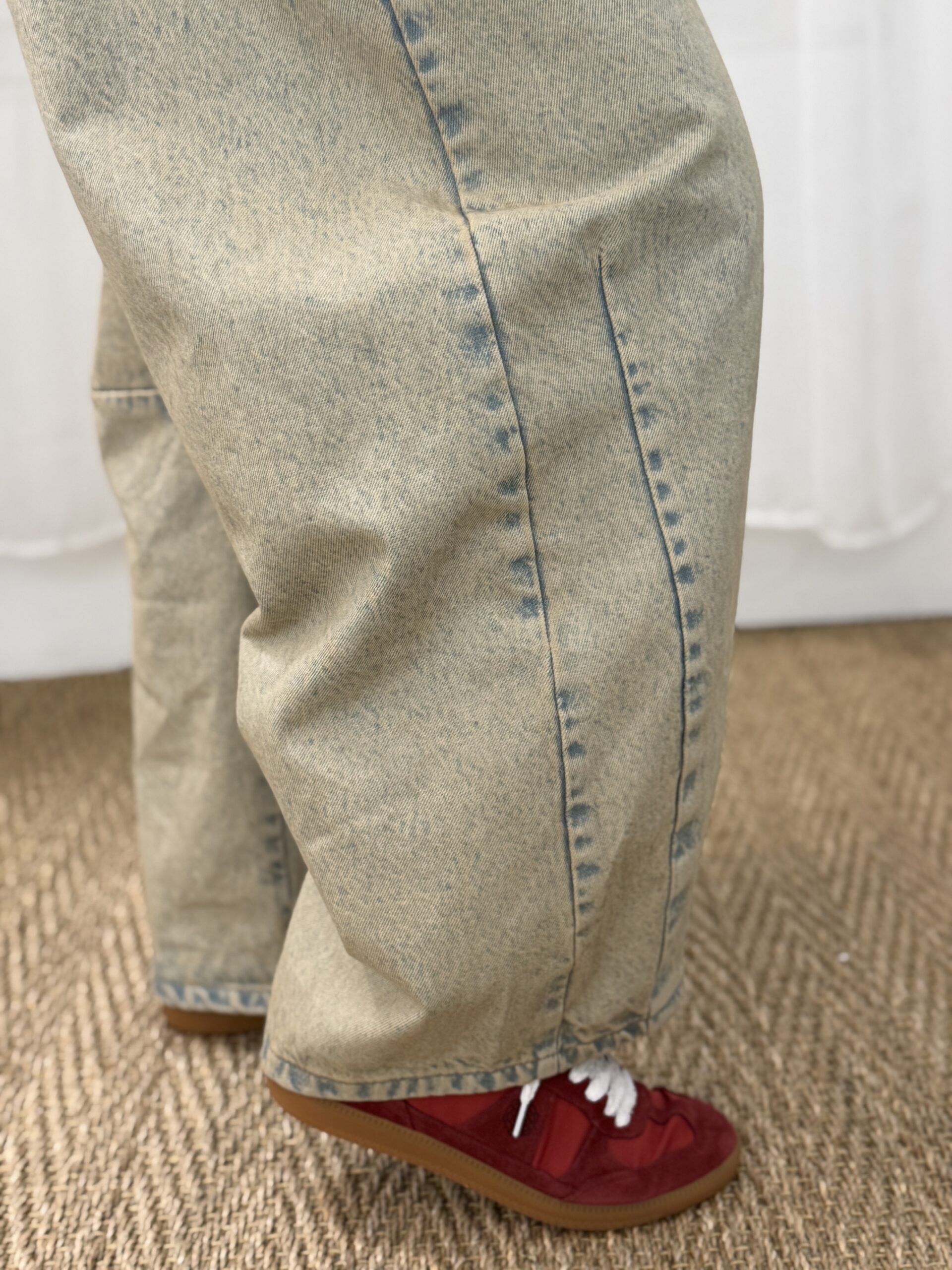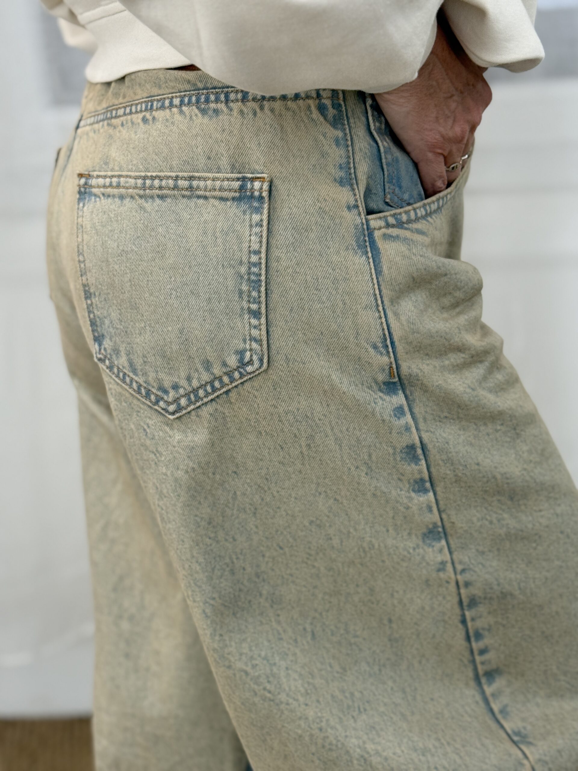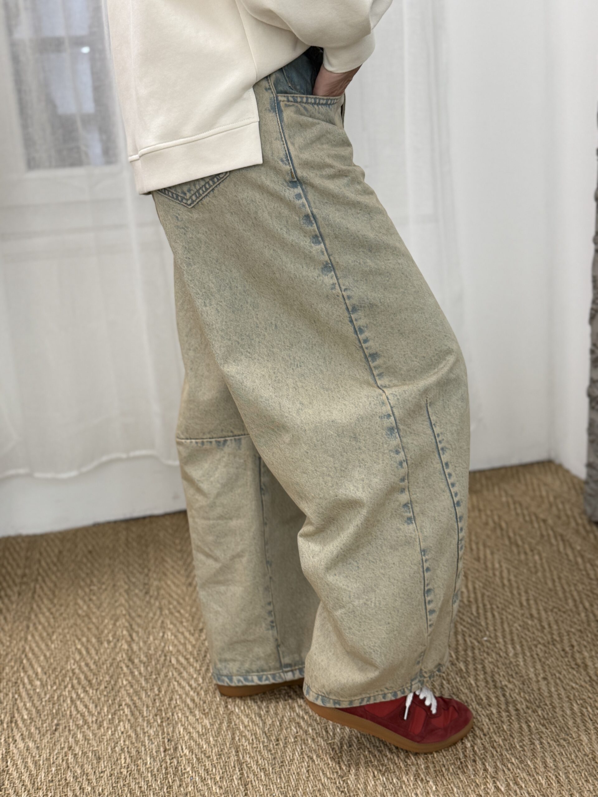 Jean à la coupe forme barrel, facile à porter au quotidien. Sa teinte denim beige délavé apporte une touche moderne et douce, idéal pour des looks casual est plus habillés.