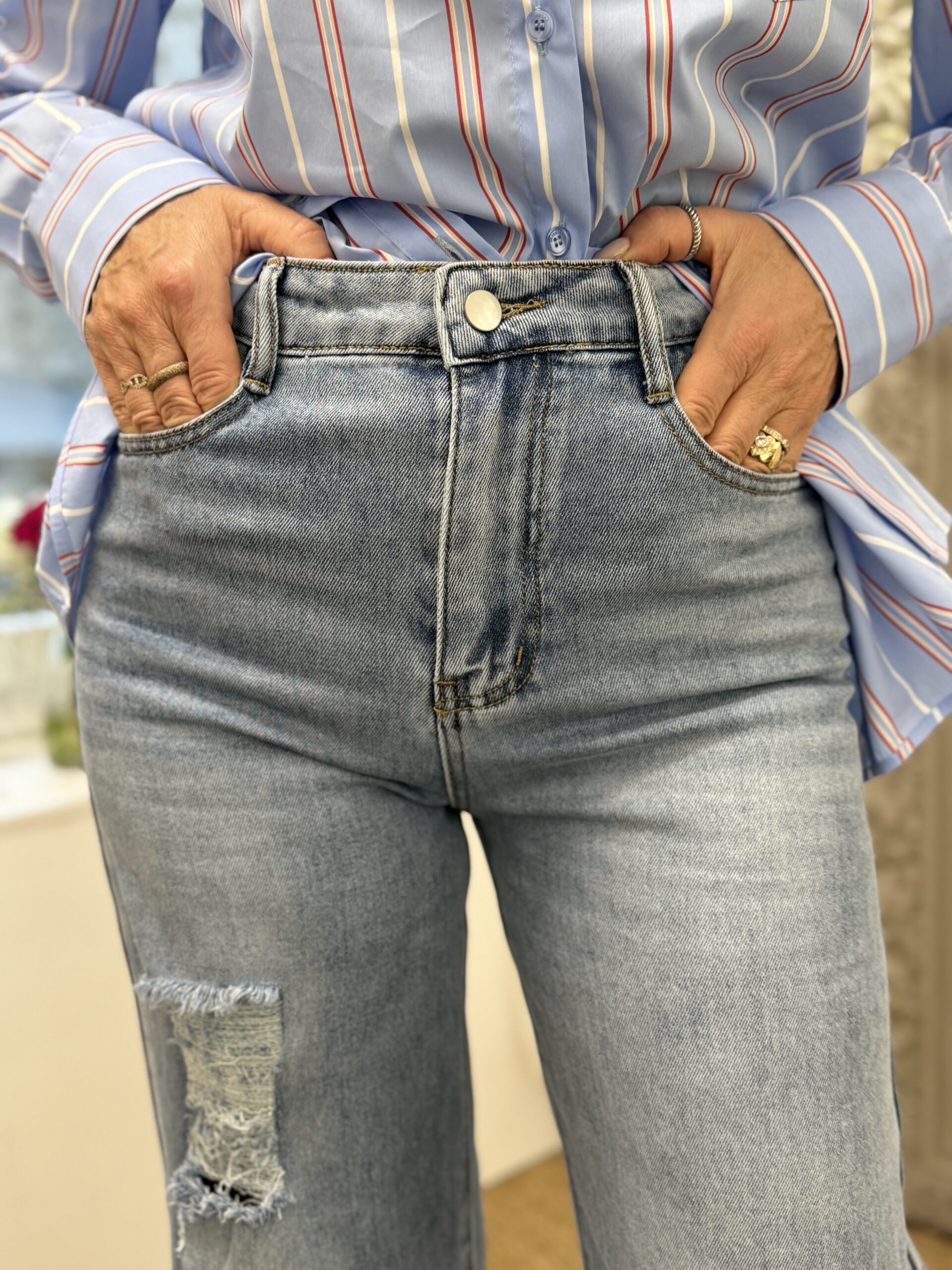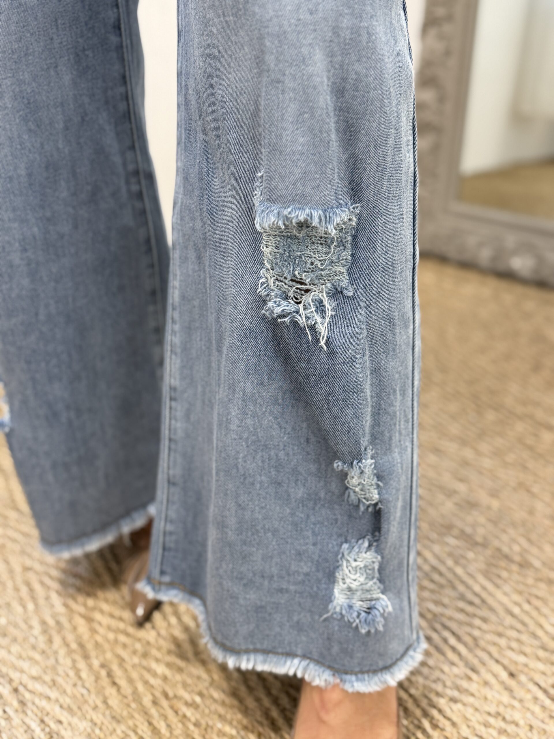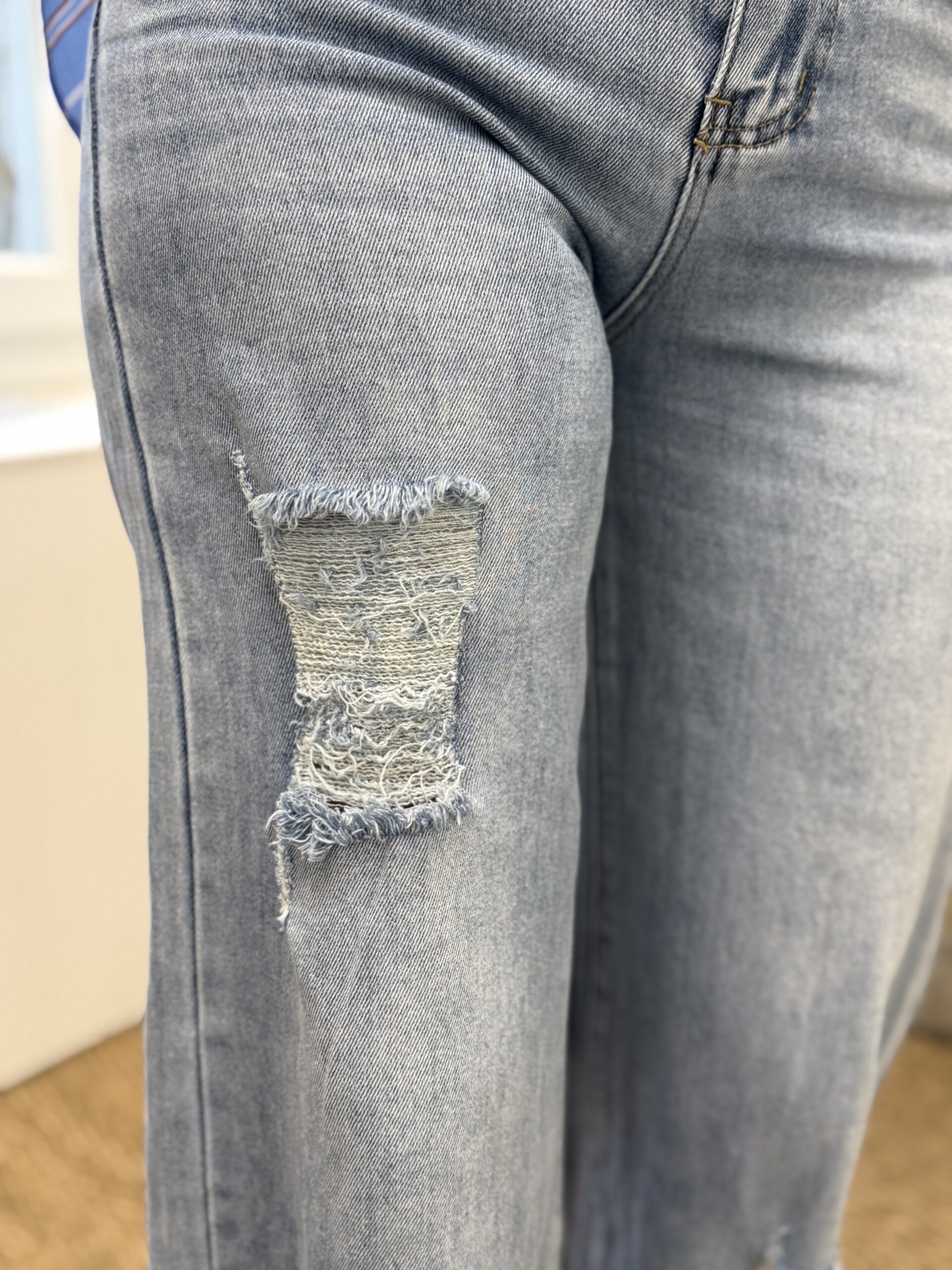 Jean denim bleu clair, avec effet délavé et détails destroy. Coupe large moderne offrant une silhouette tendance et décontractée. Ourlets effilochés pour un rendu casual et actuel