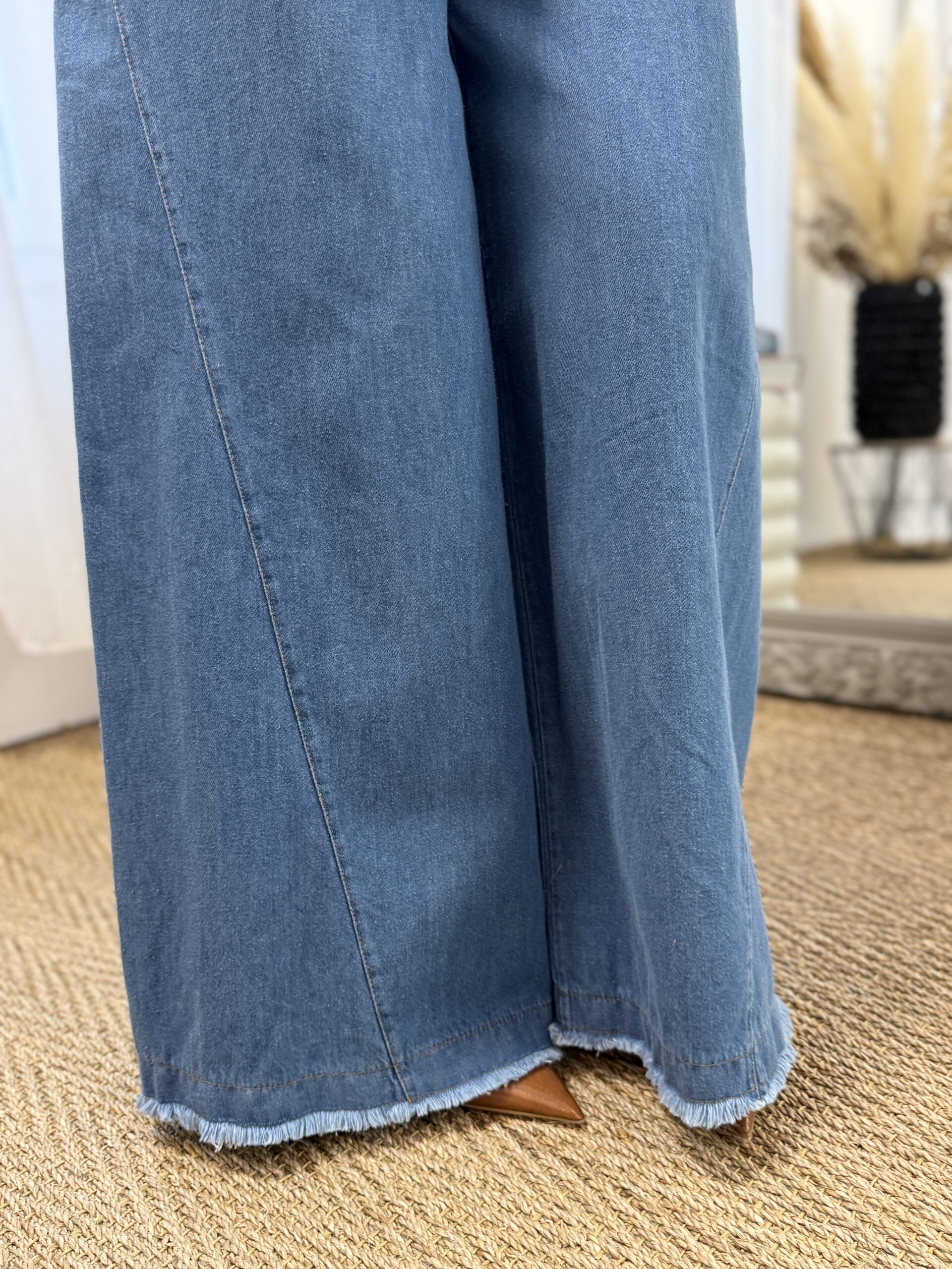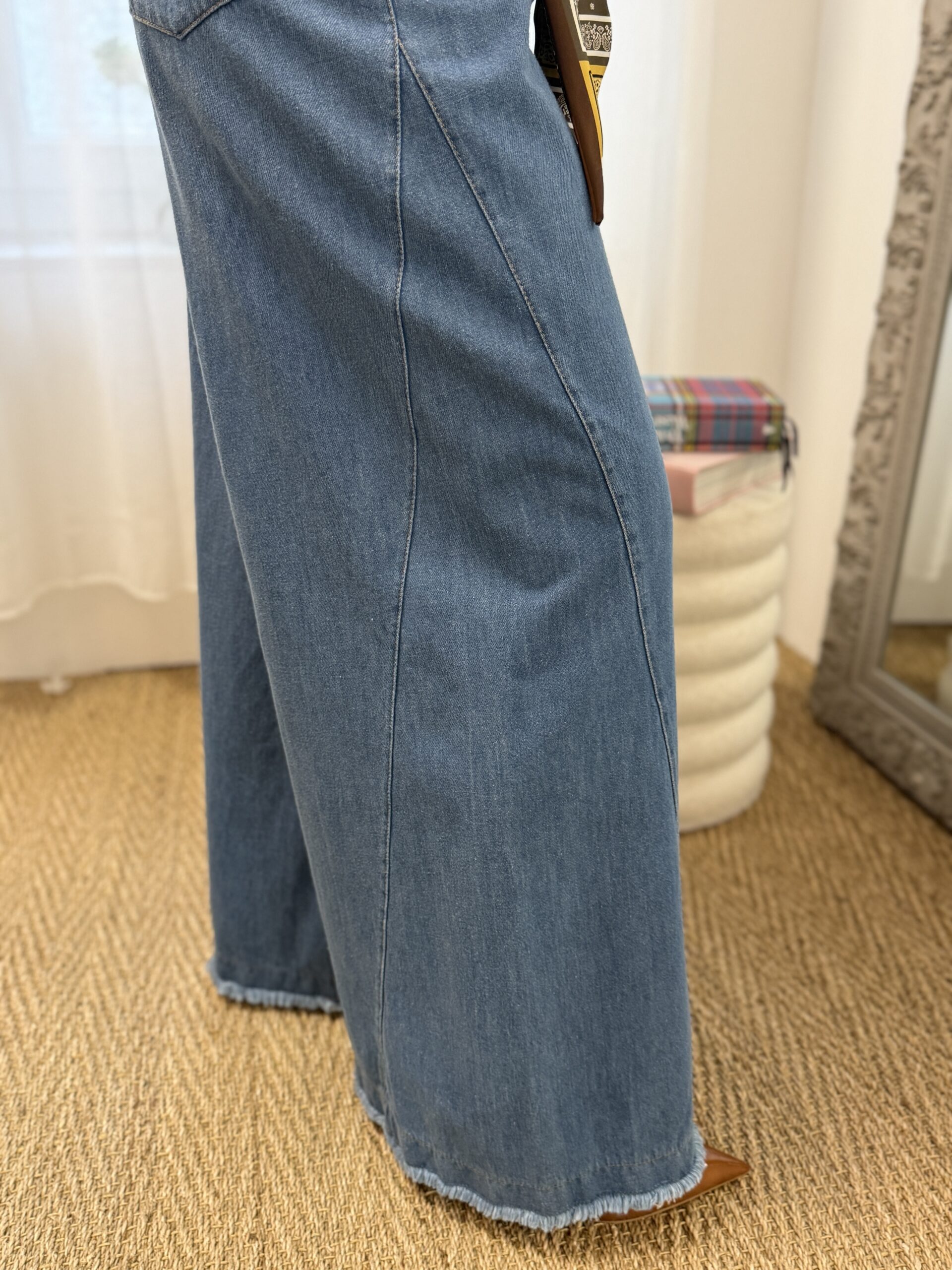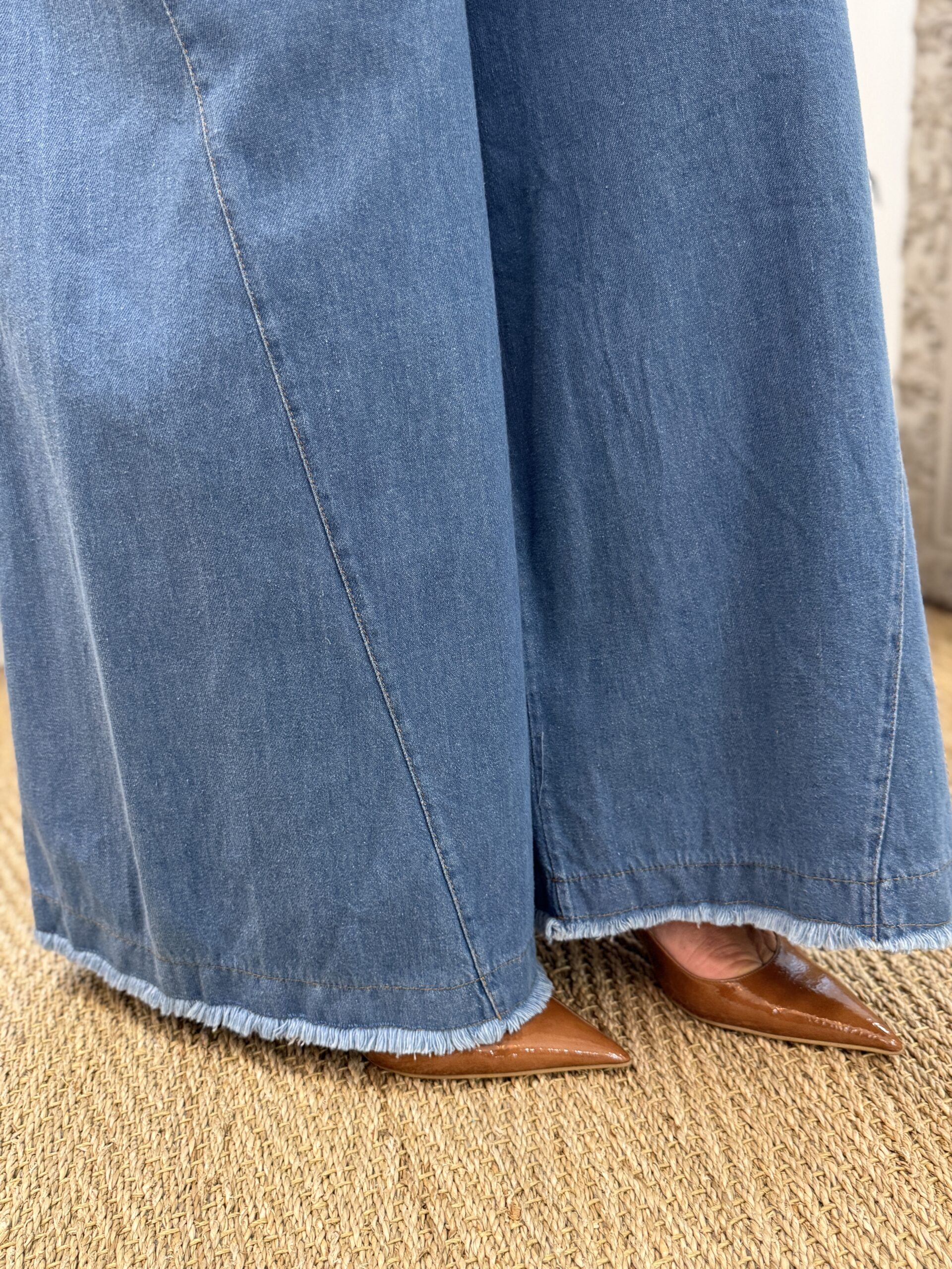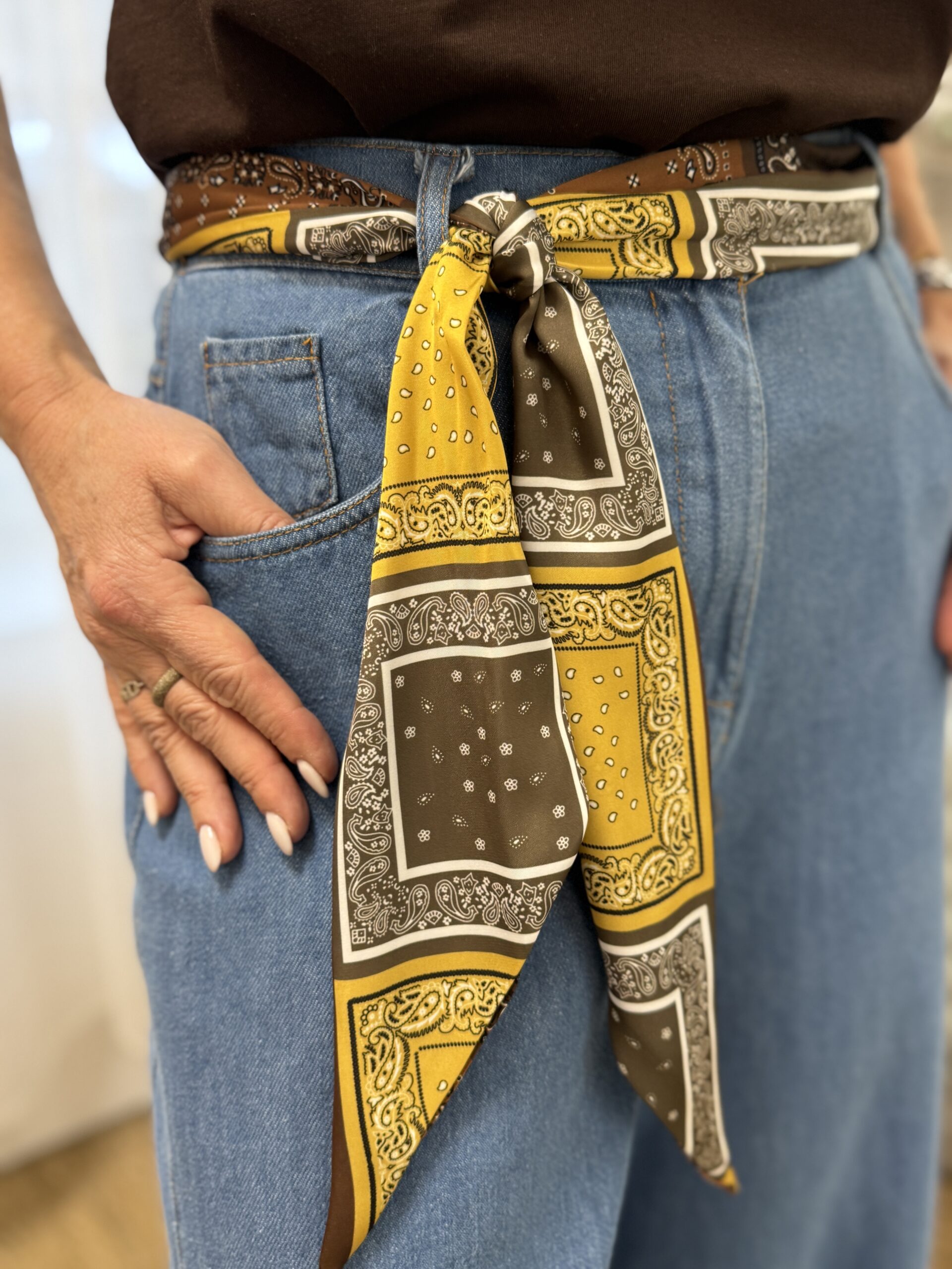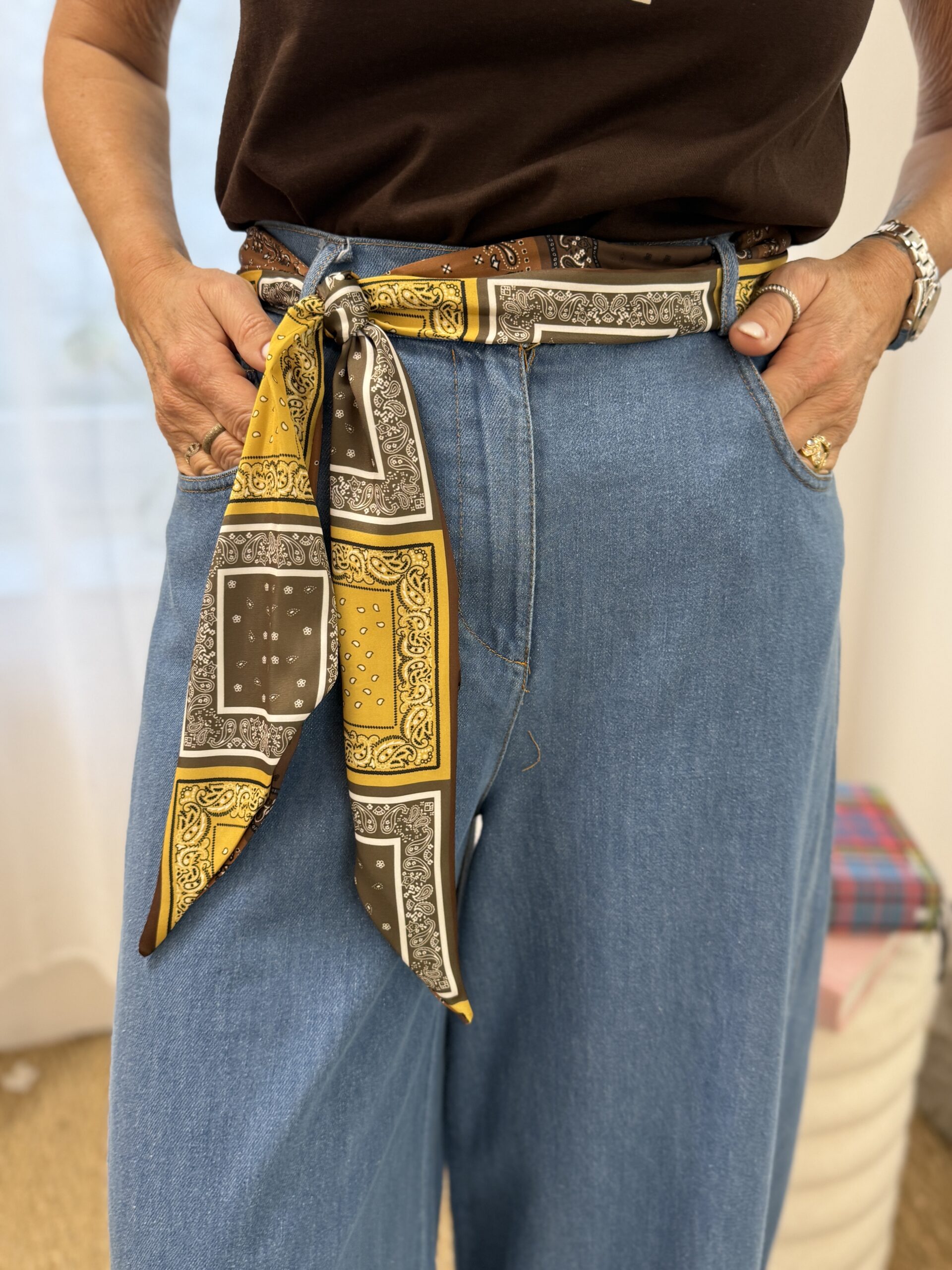 Jeans à coupe large et taille haute confortable et tendance. Il est accompagné d’une ceinture foulard à motifs, qui apporte une touche originale et colorée.