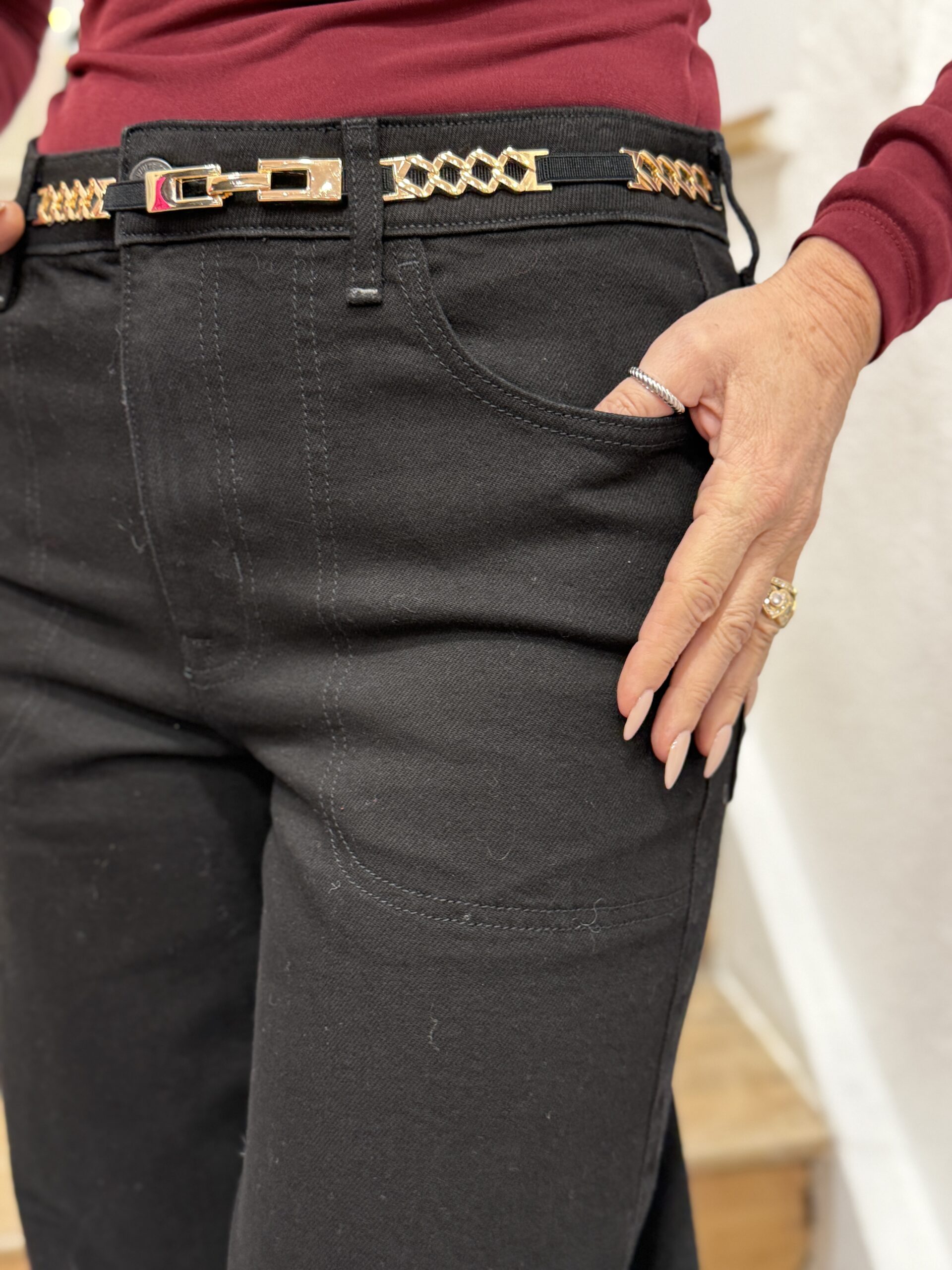 Jean noir à la coupe droite et à la taille haute, pensé pour allonger la silhouette et offrir un maintien confortable au quotidien.