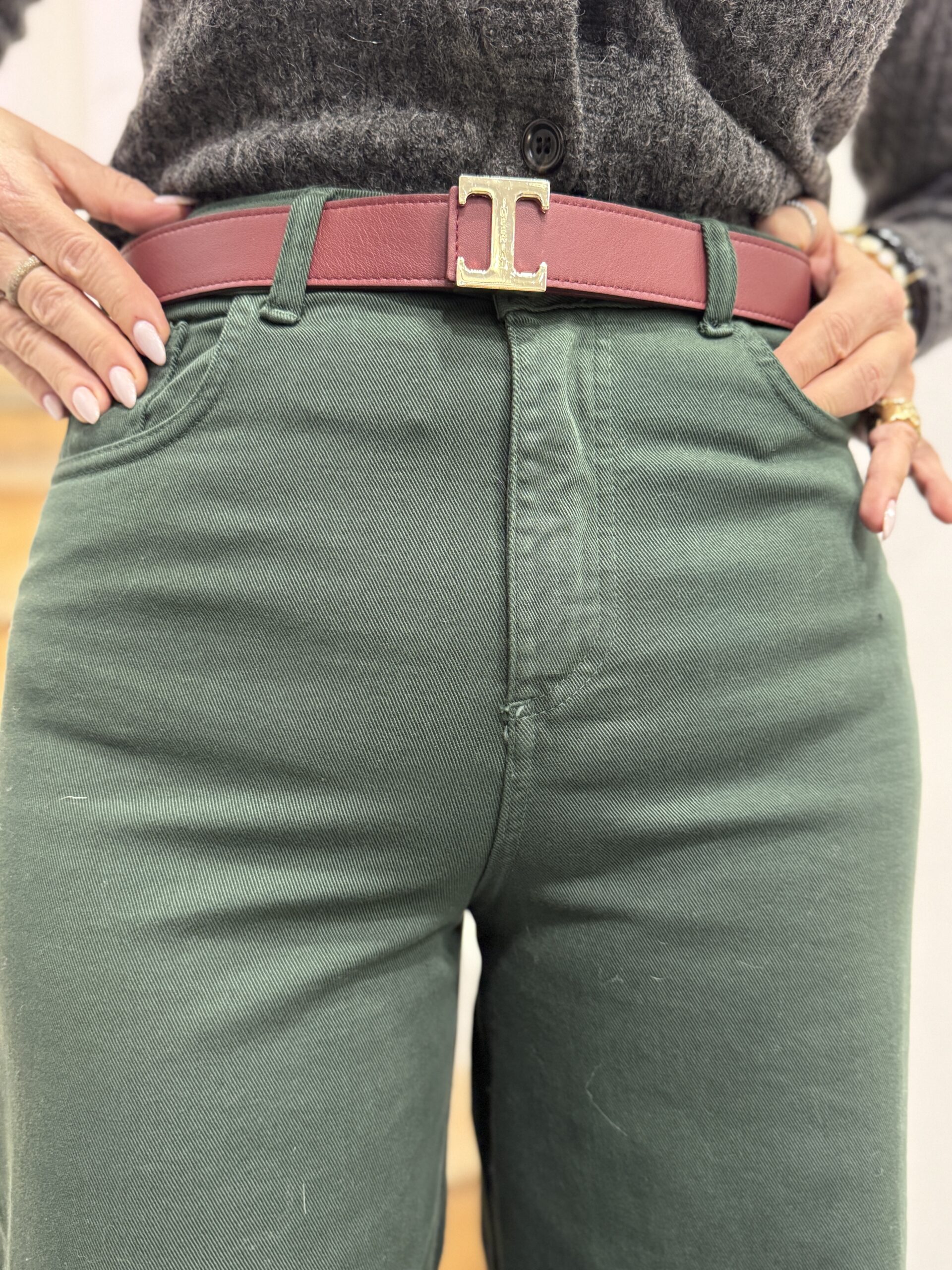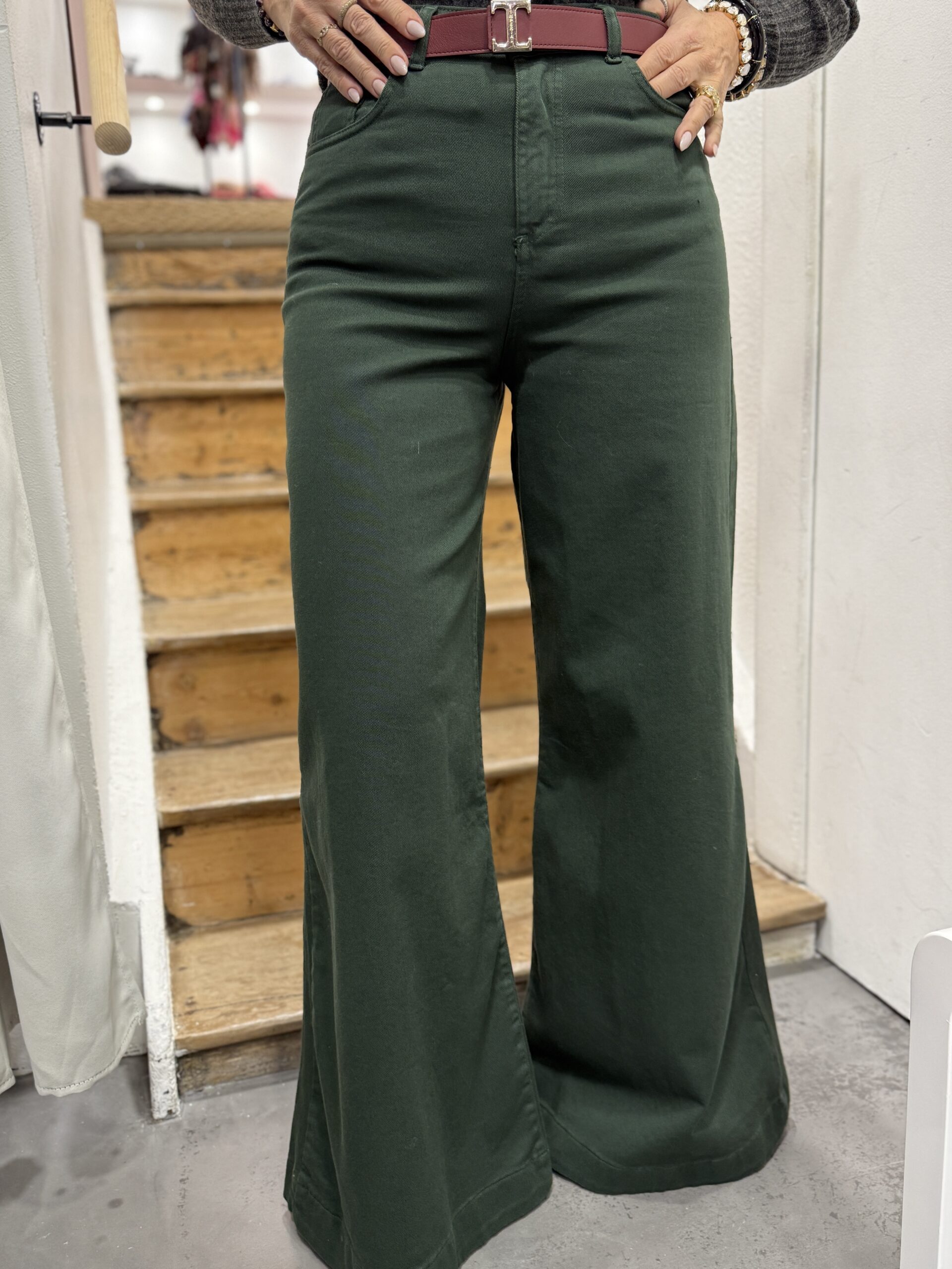 Adoptez une silhouette moderne avec ce jean vert à coupe large, une pièce essentielle au style affirmé et élégant.