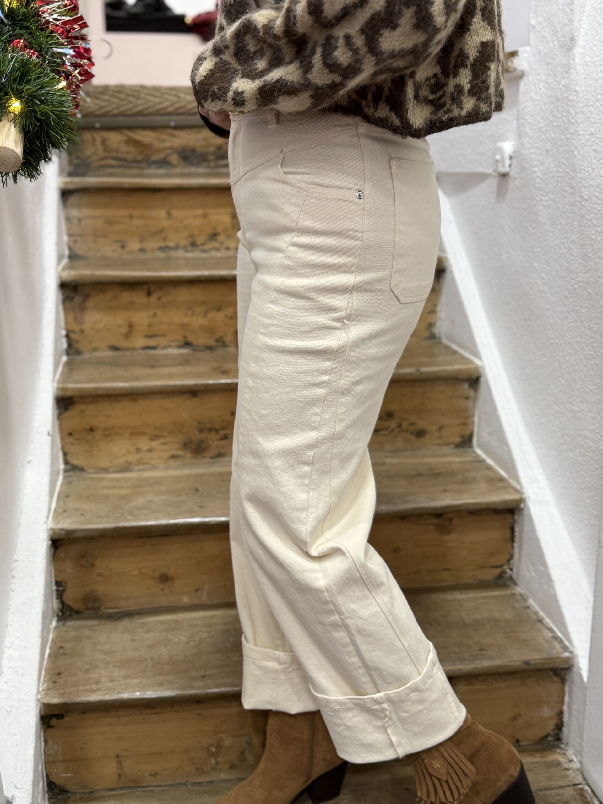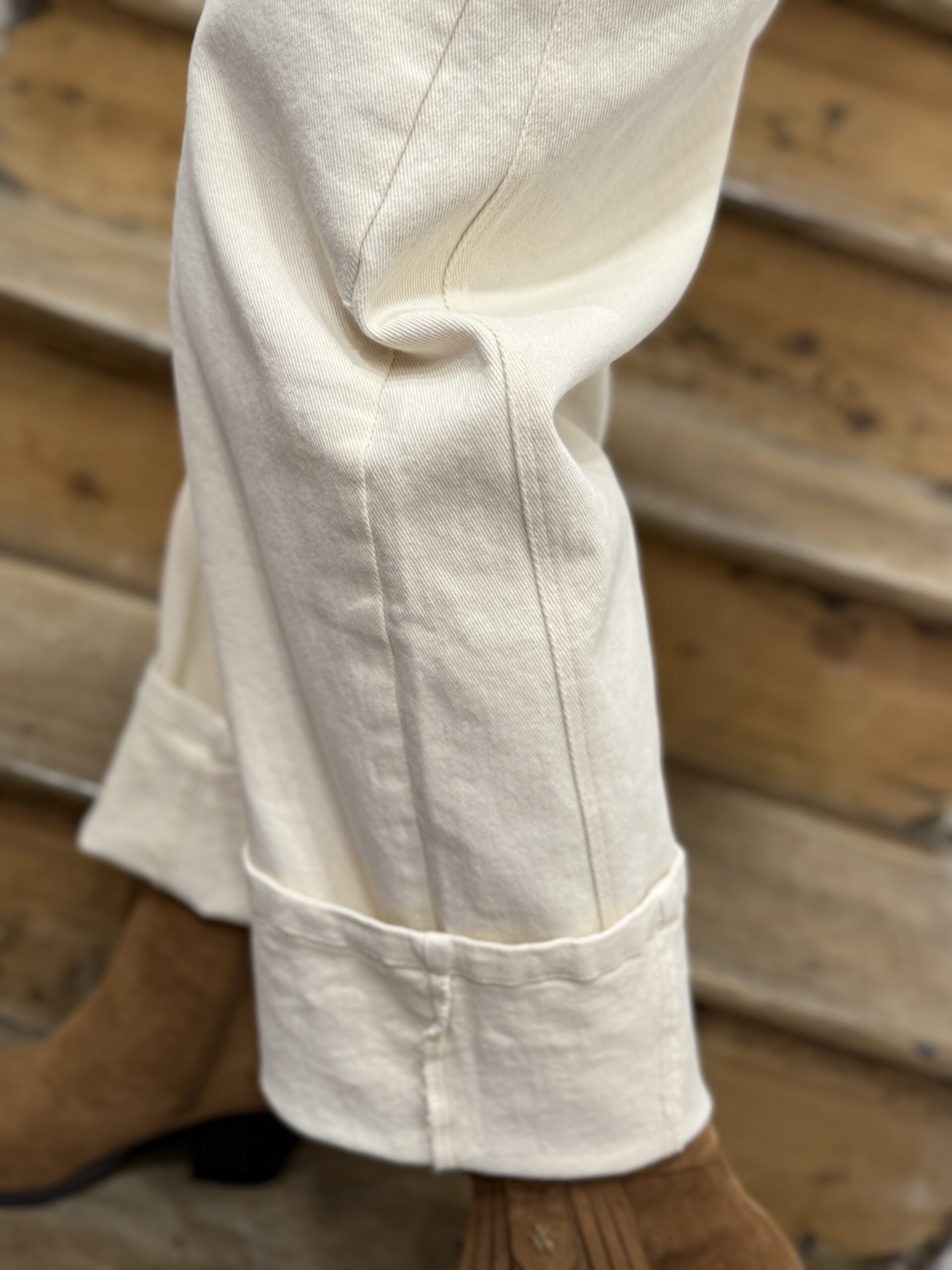Jean écru à la coupe droite et à la taille haute, confectionné dans une toile douce et confortable.