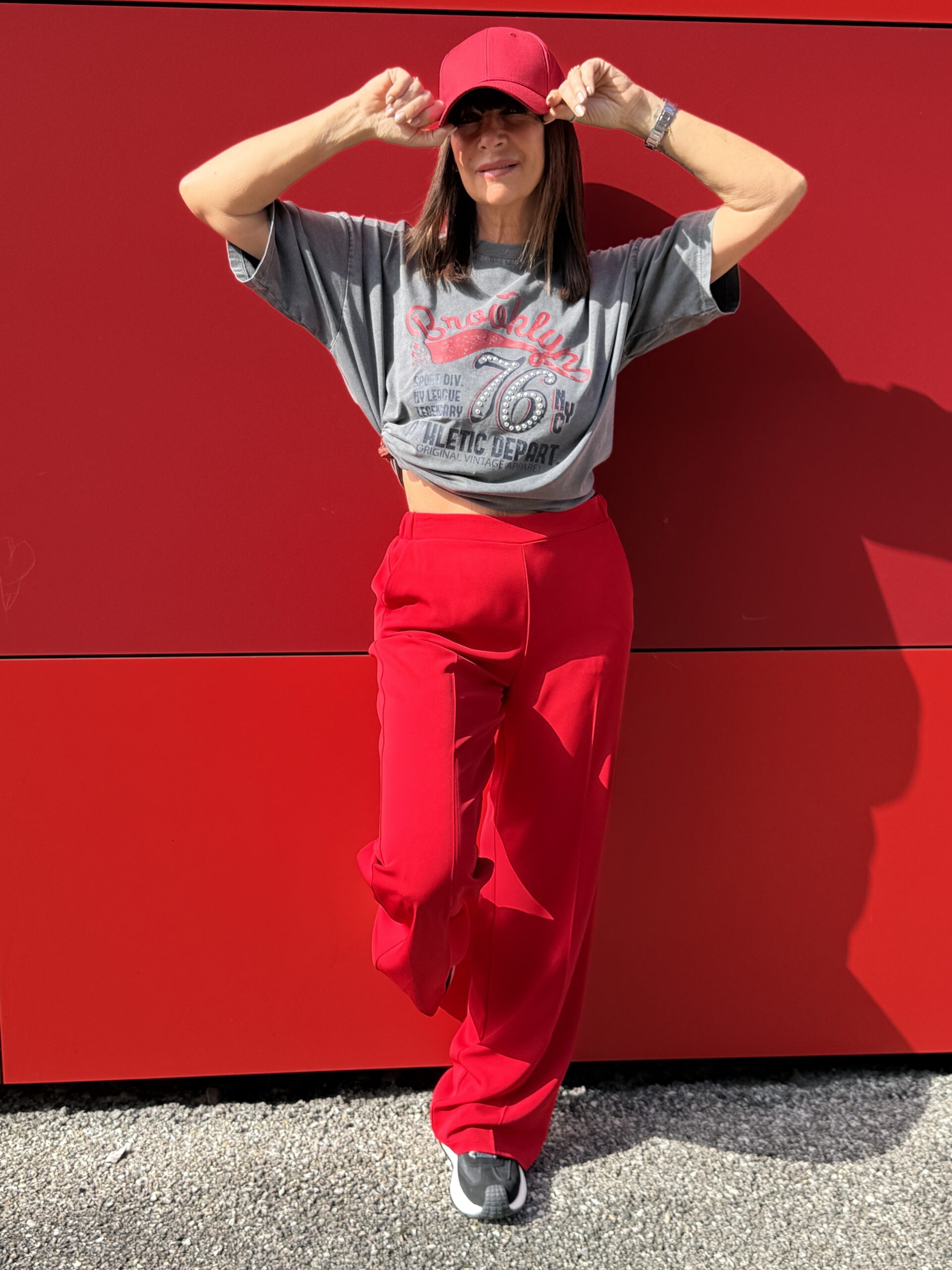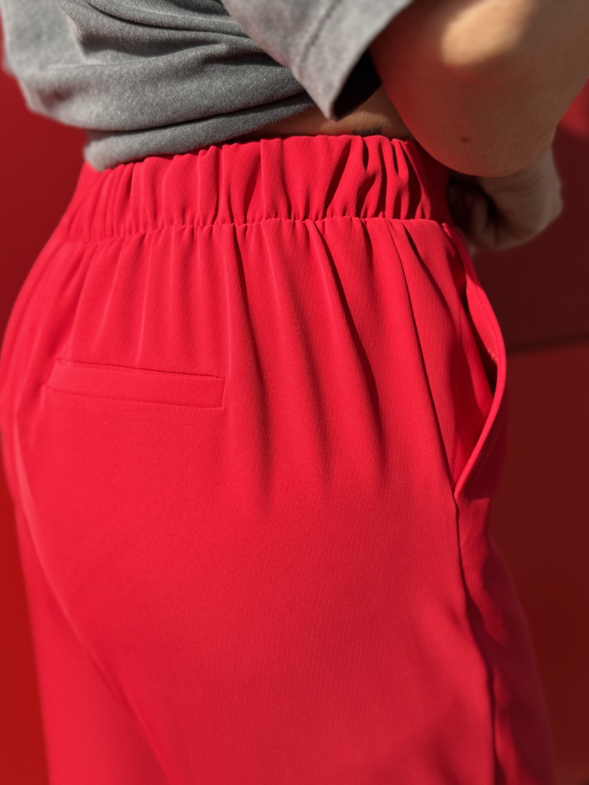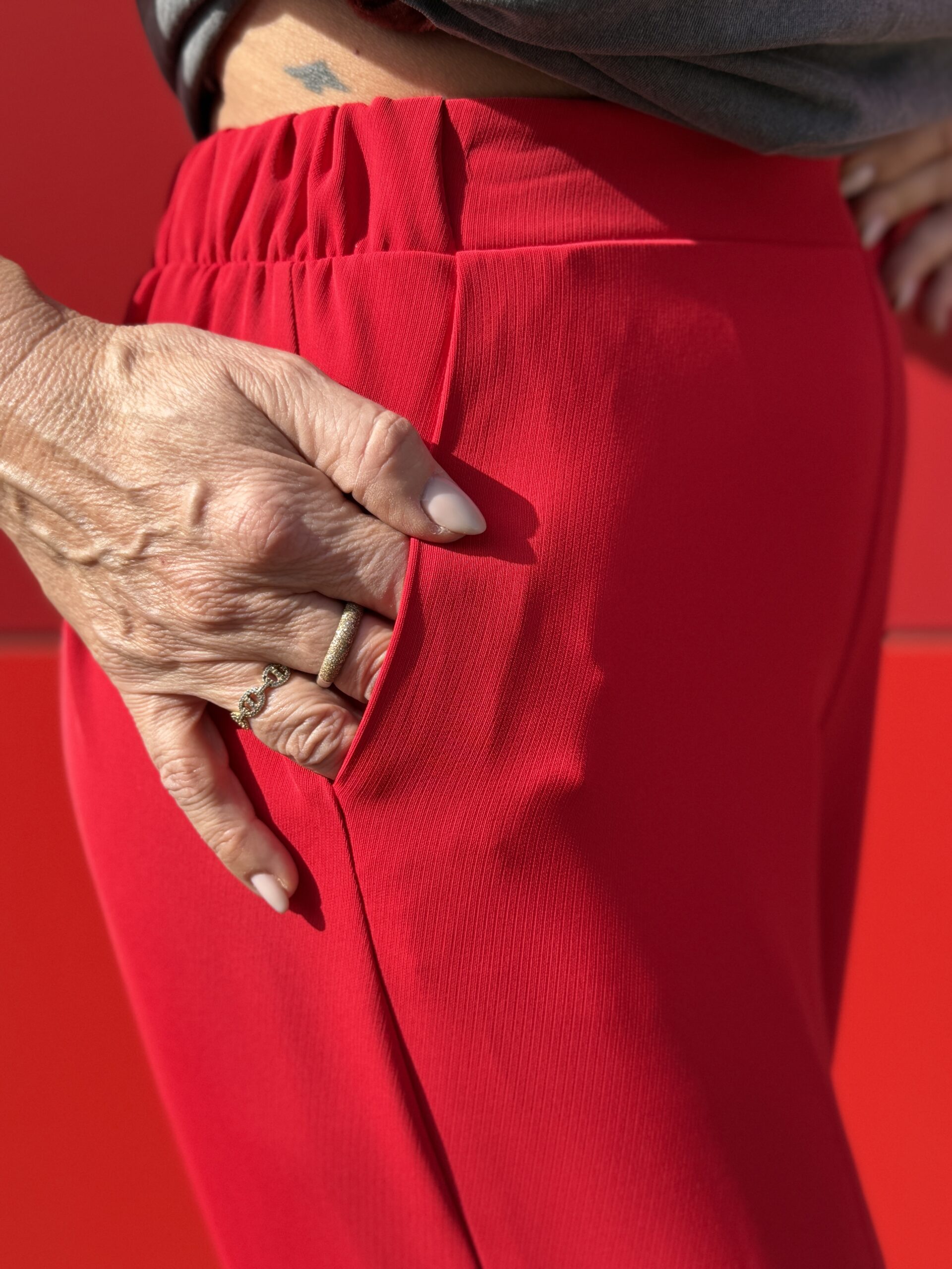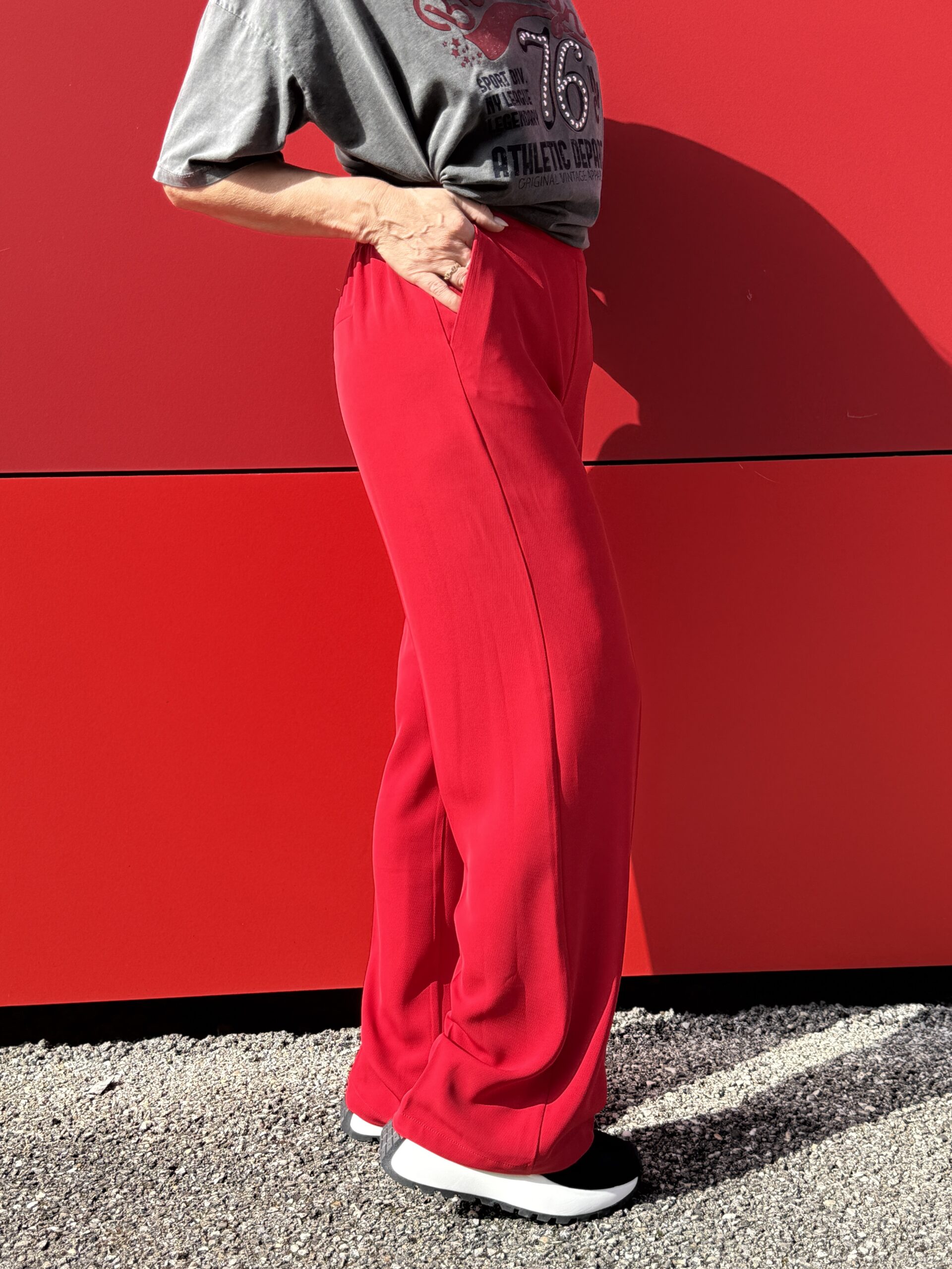 Pantalon fluide large rouge est parfait pour allonger la silhouette tout en offrant un confort optimal.