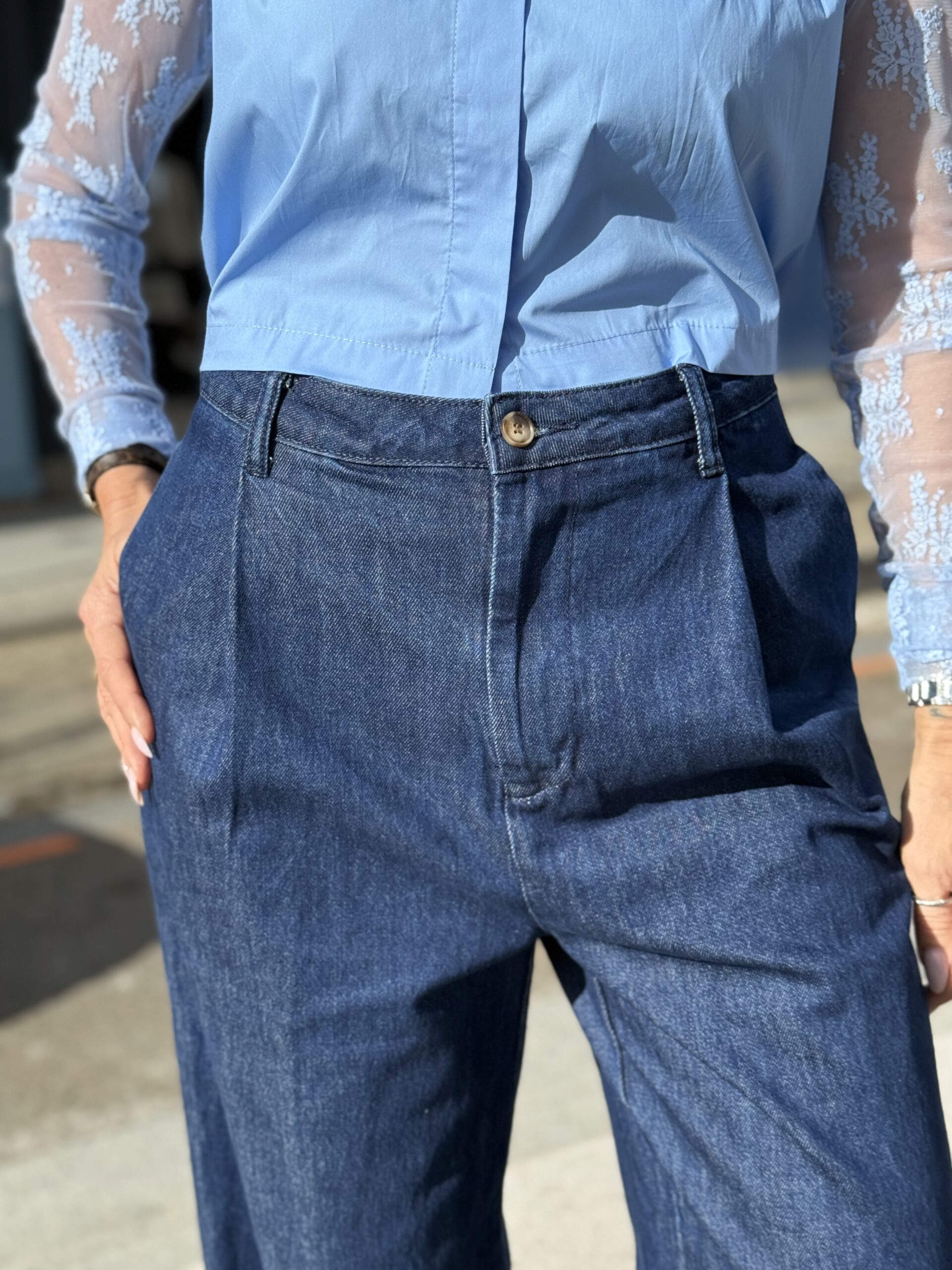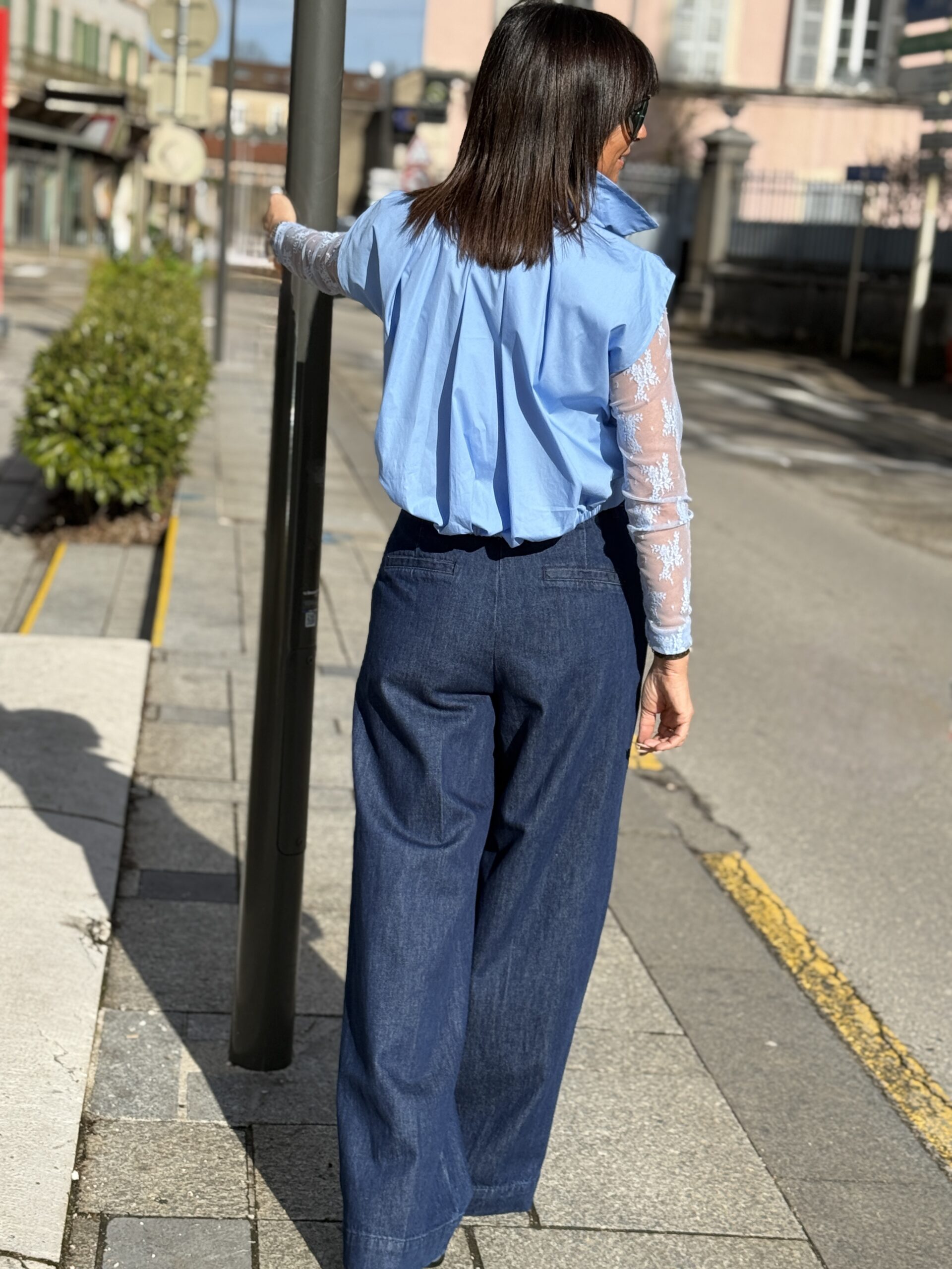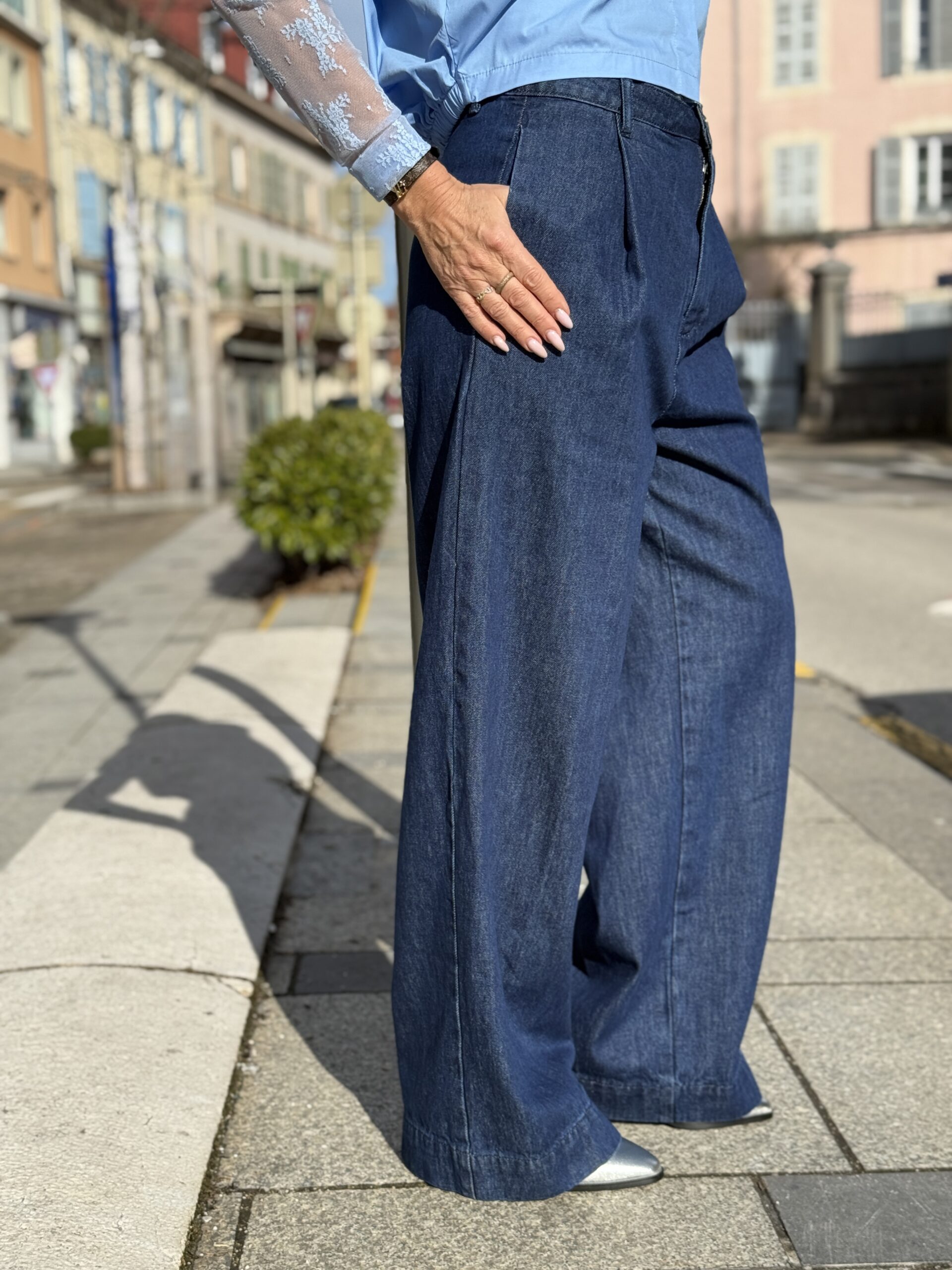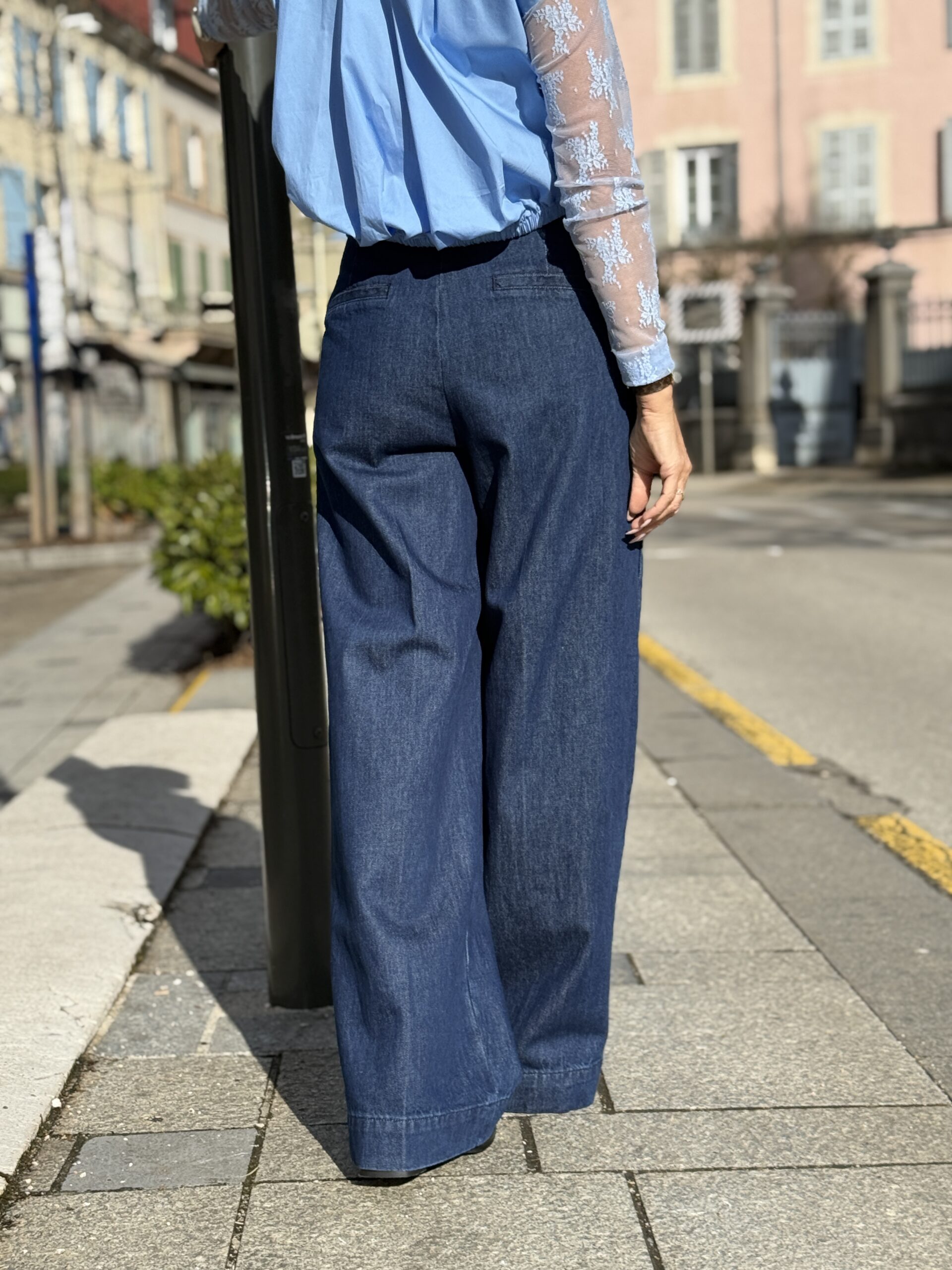 Ce pantalon denim « Vienne »revisite le jean classique avec une coupe large et élégante. Sa taille haute structure la silhouette tandis que sa ligne droite et fluide allonge la jambe. A la fois confortable et sophistiqué, il se porte aussi bien en tenue de ville qu’en look plus habillé.