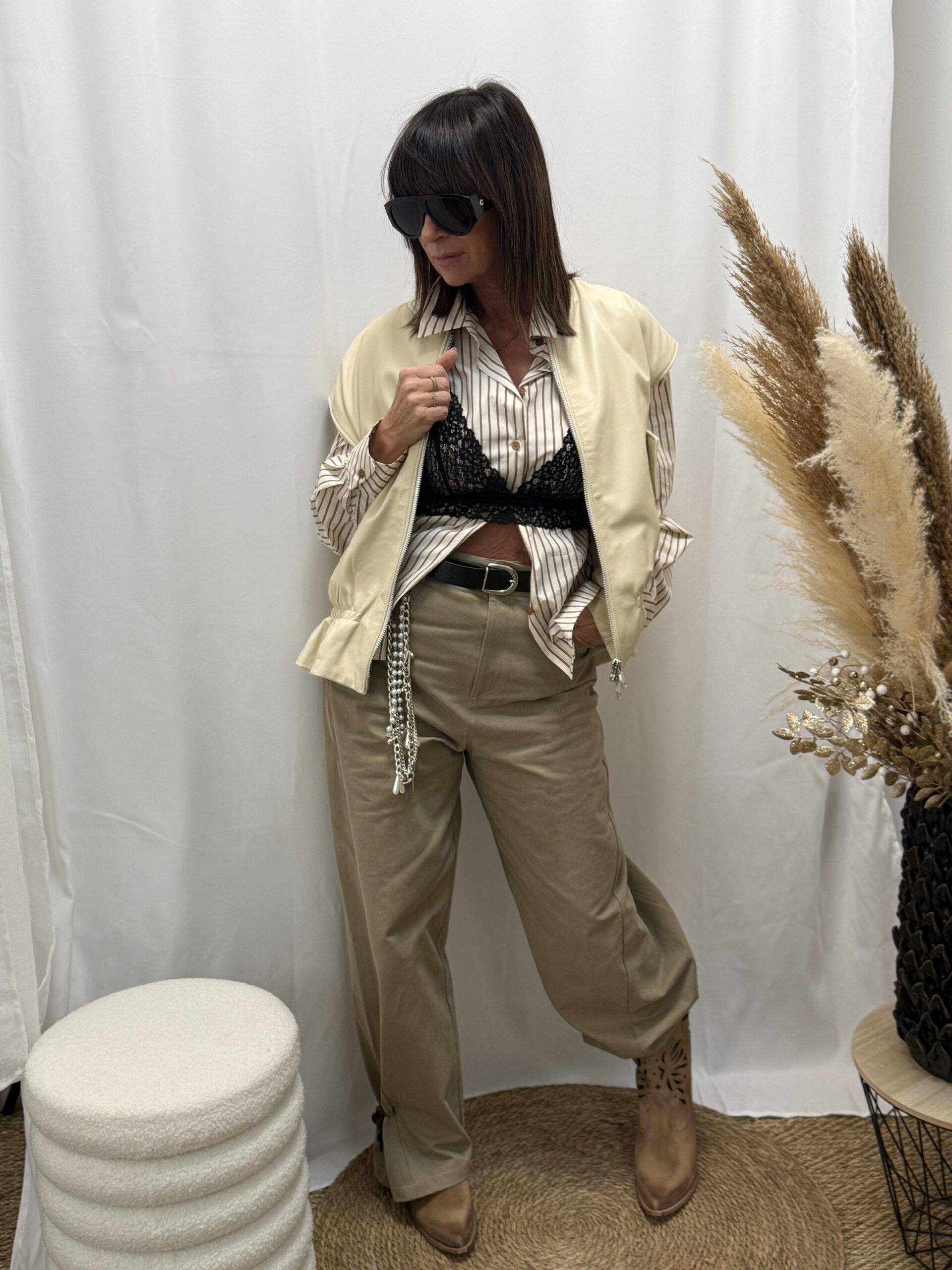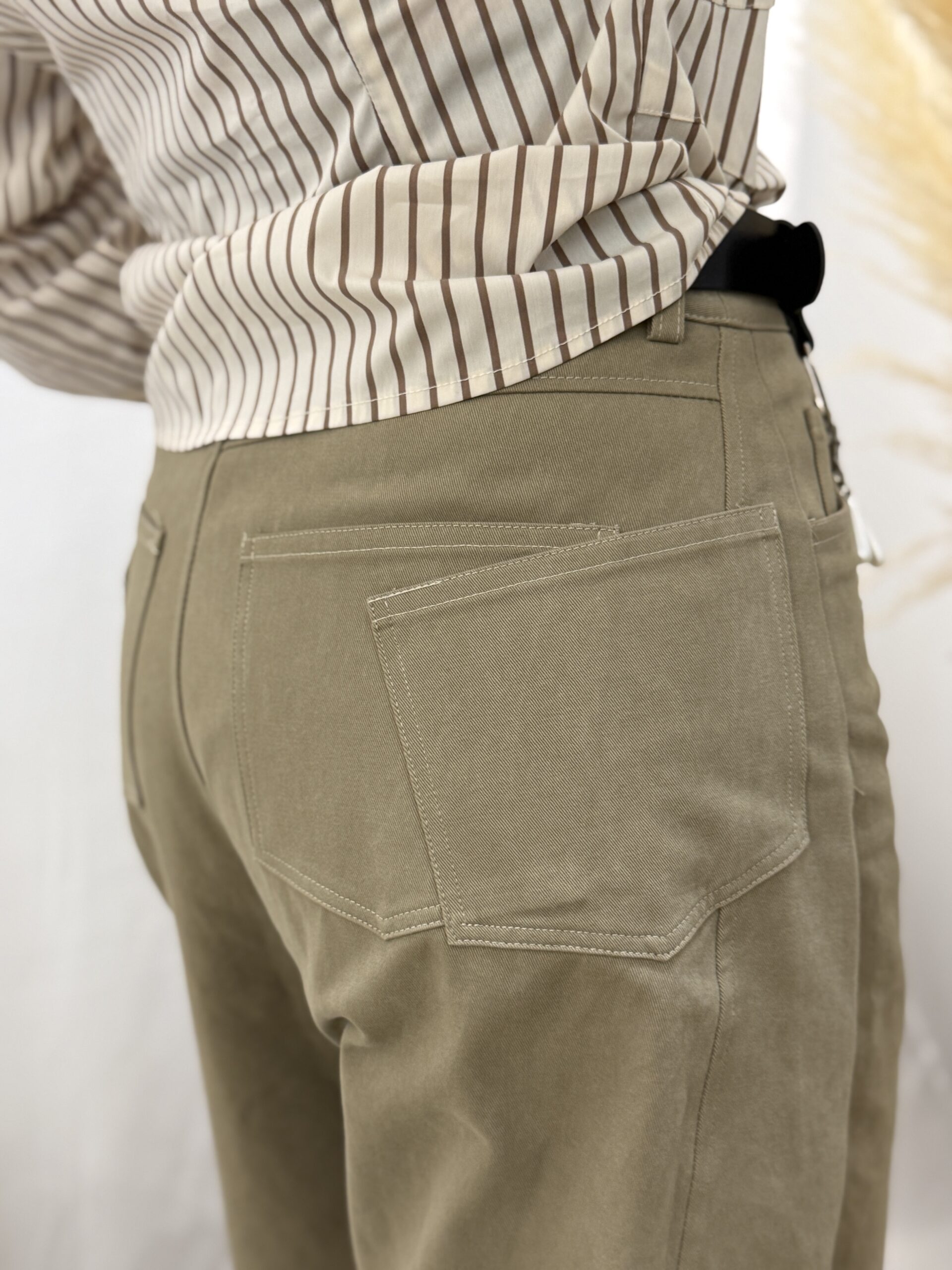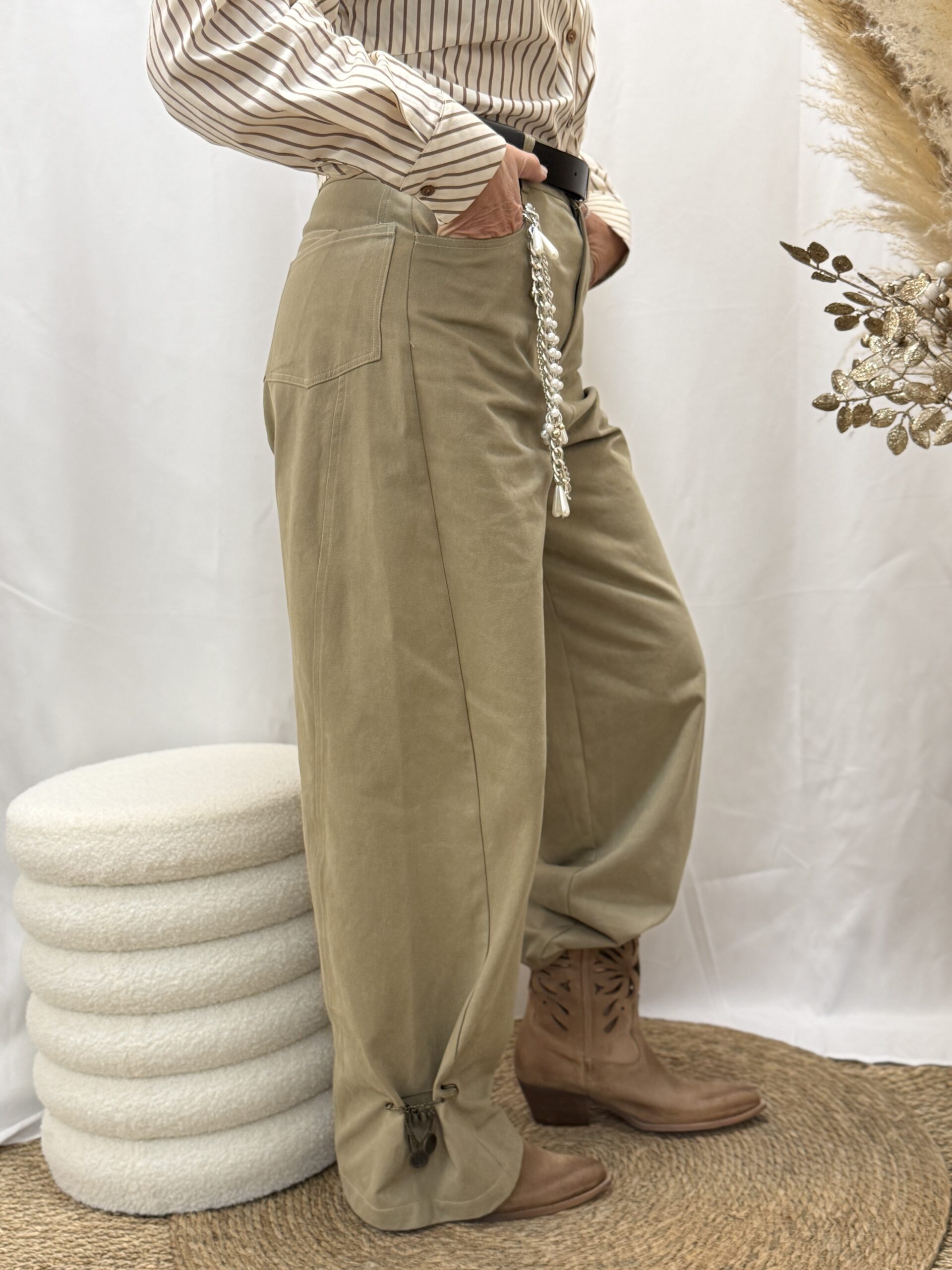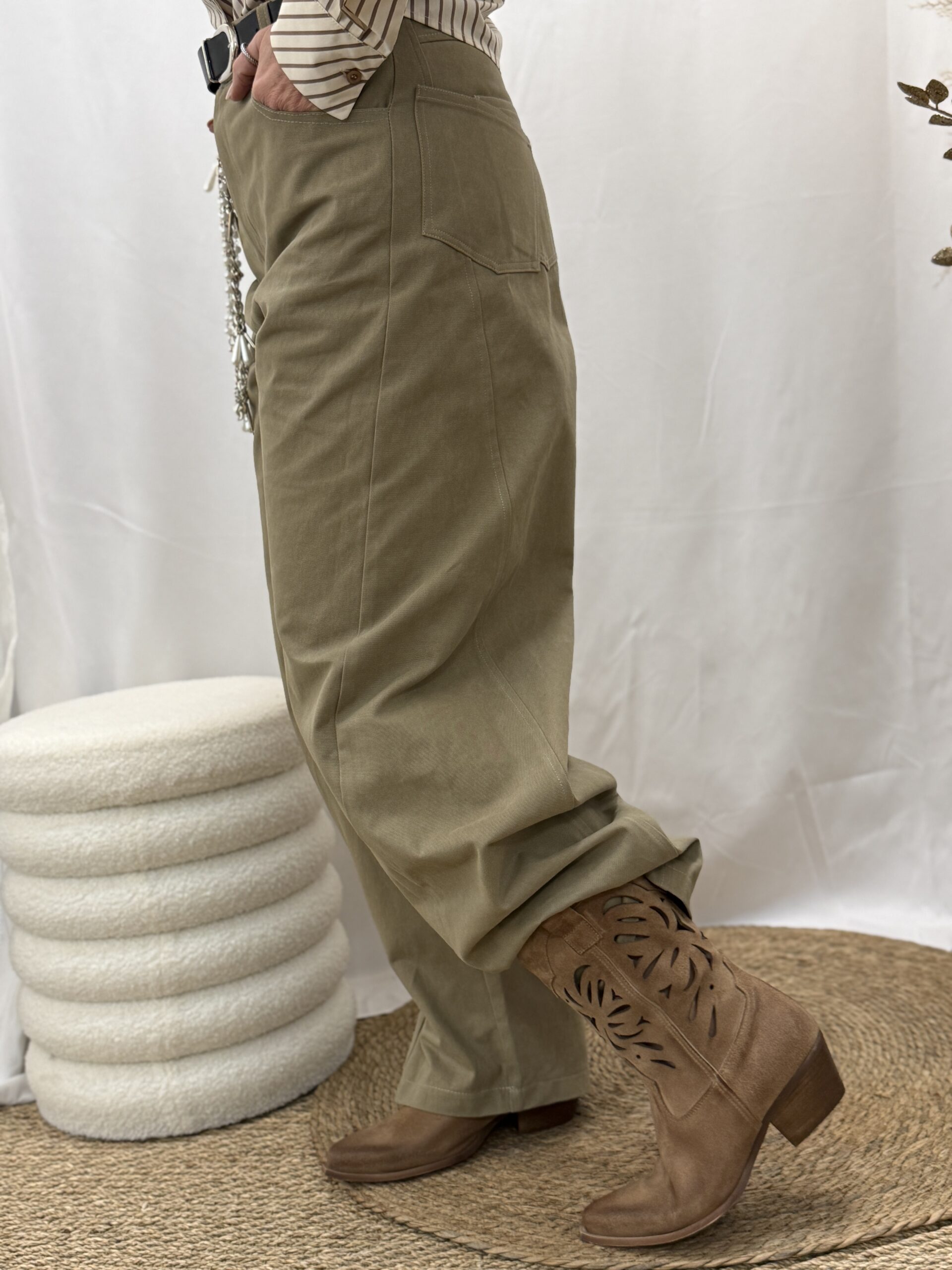 Pantalon large au style moderne et affirmé. Sa coupe ample et sa teinte kaki beige en font une pièce ultra-tendance, confortable et facile à associer. Les détails de finition et la structure du tissu apportent une allure chic et contemporaine.