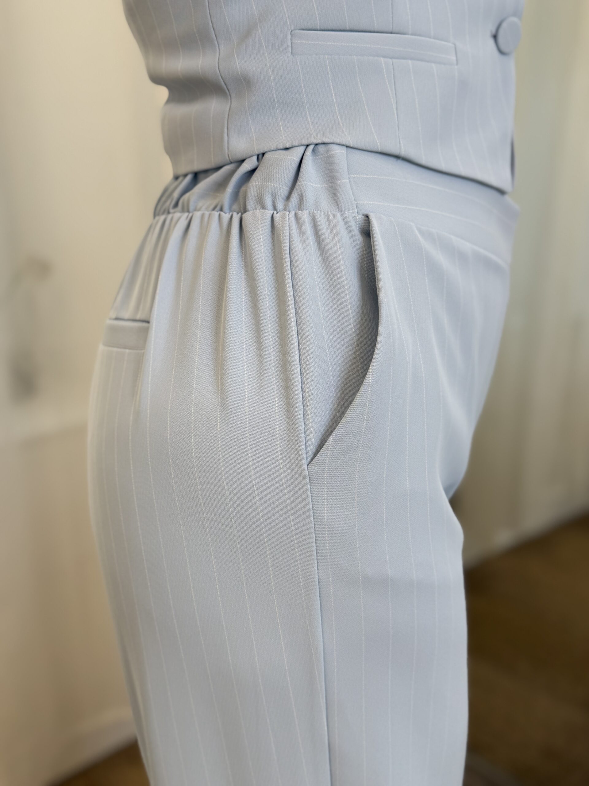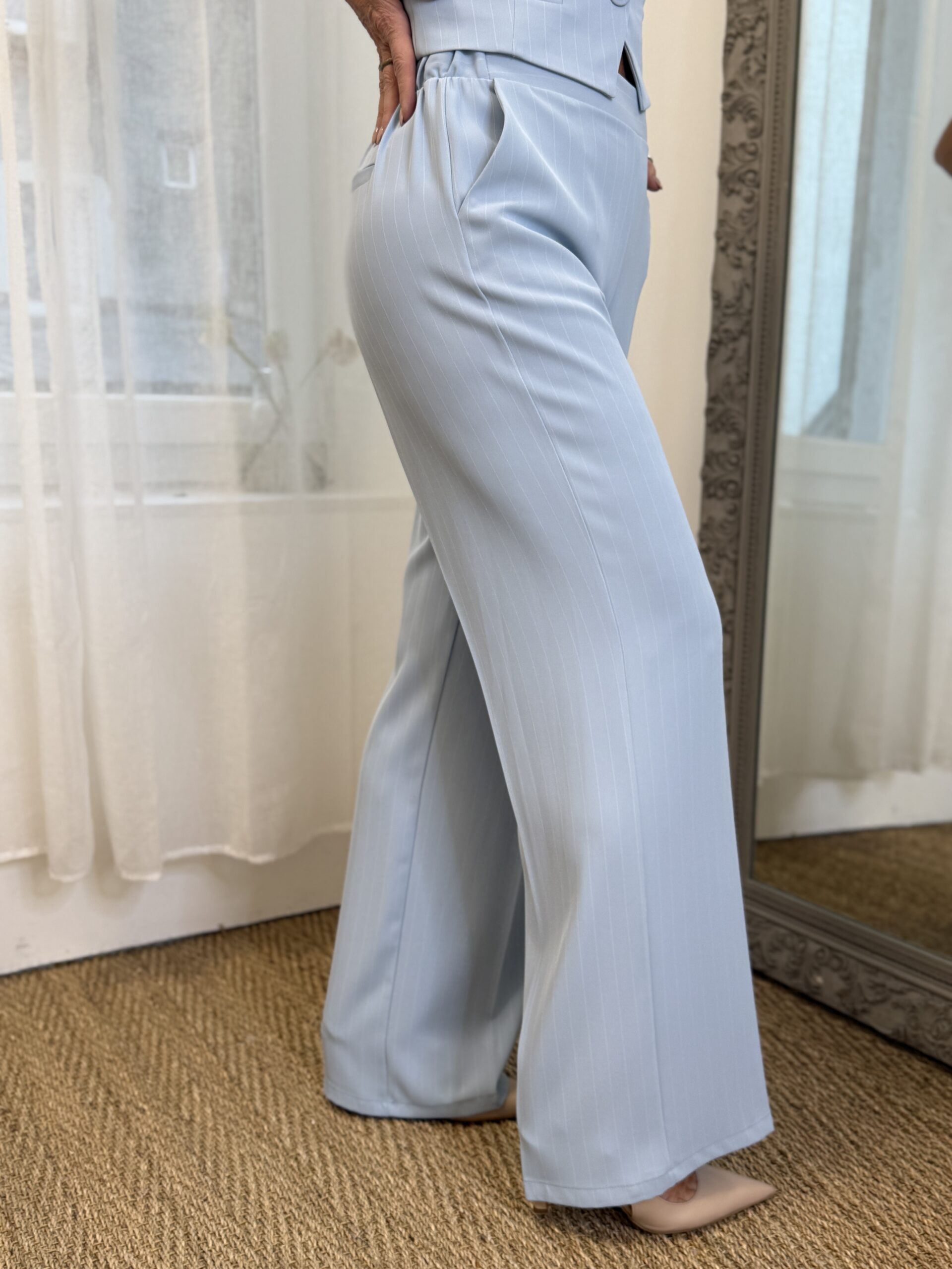 Pantalon fluide large bleu ciel à fines rayures verticales est parfait pour allonger la silhouette tout en offrant un confort optimal.