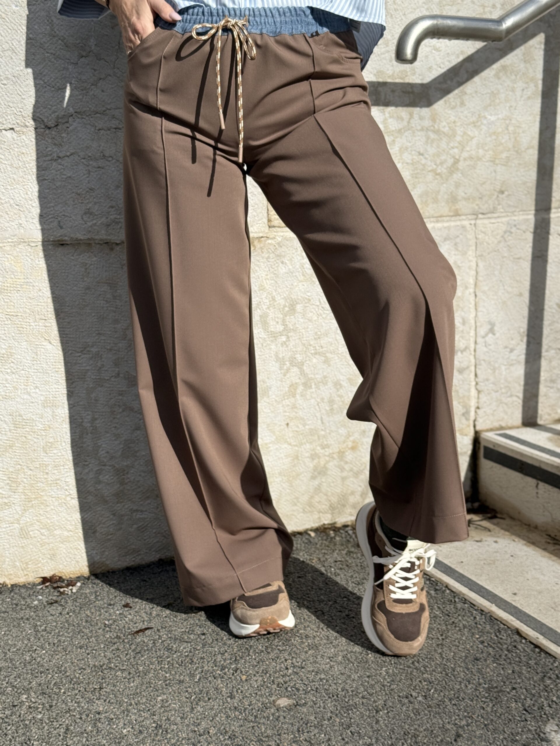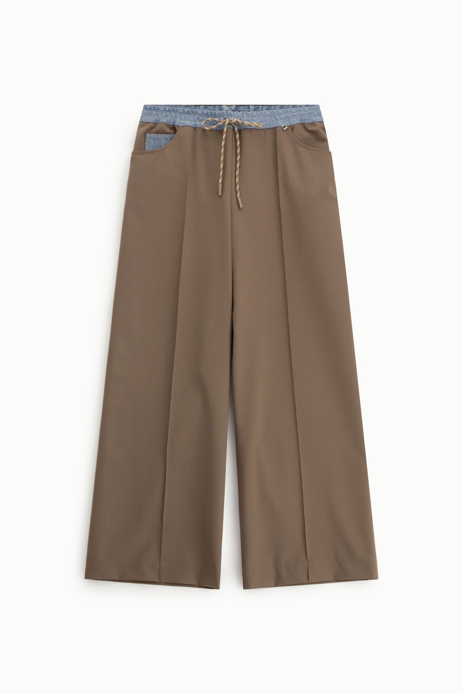 Pantalon à l’esthétique mode hybride, mêlant le tailoring et influences casual. Sa coupe large et fluide et contrastée par une ceinture denim avec cordon de serrage, créant un effet superposé moderne. Les empiècements et la poche arrière en denim, renforce son caractère contemporain et décontracté.