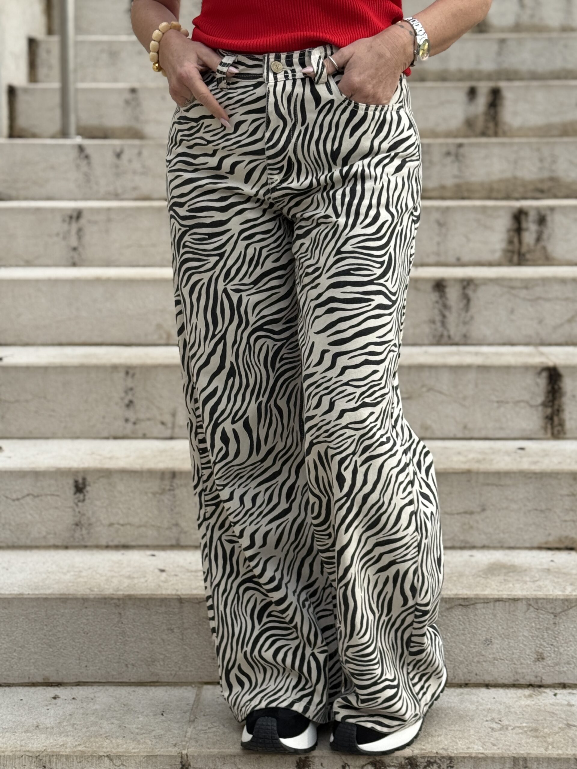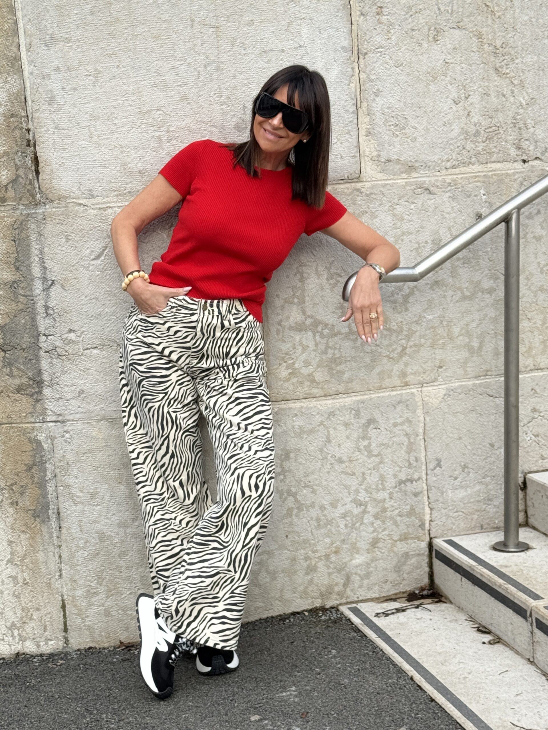 Le pantalon « socca » affirme un style fort et tendance grâce à son imprimé zèbre graphique. Sa coupe loose et fluide allonge la silhouette tout en offrant un confort optimal. Taille haute et bien structurée, il se porte aussi bien dans un look casual chic que plus habillé, selon les associations.