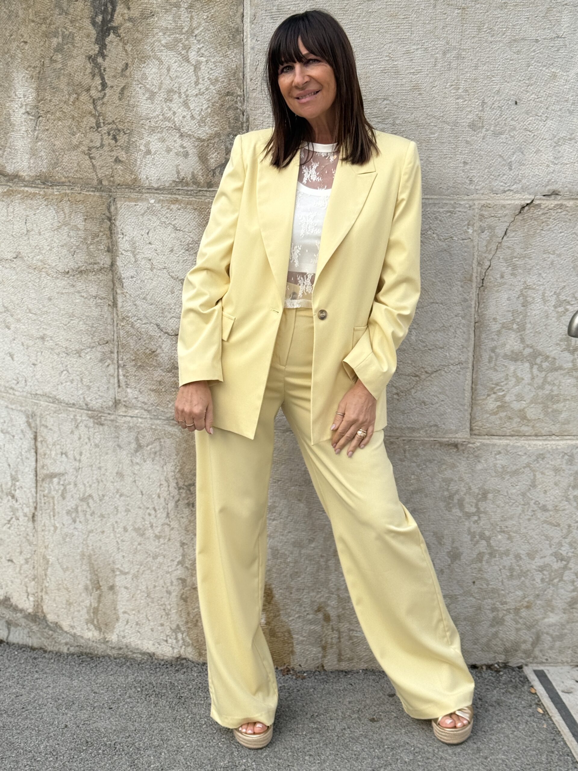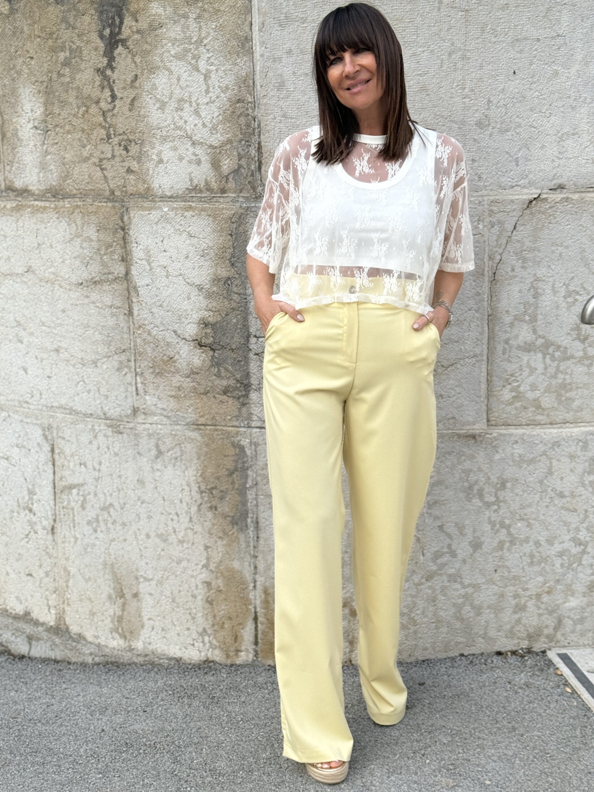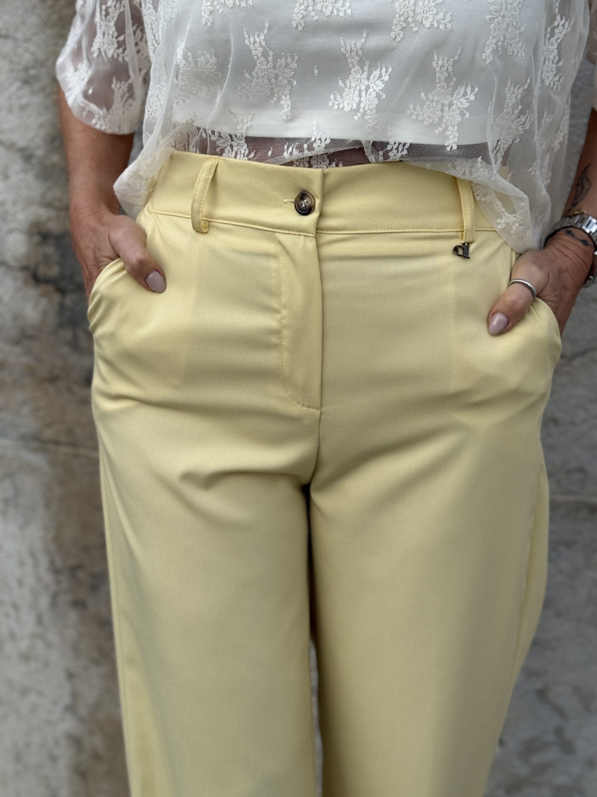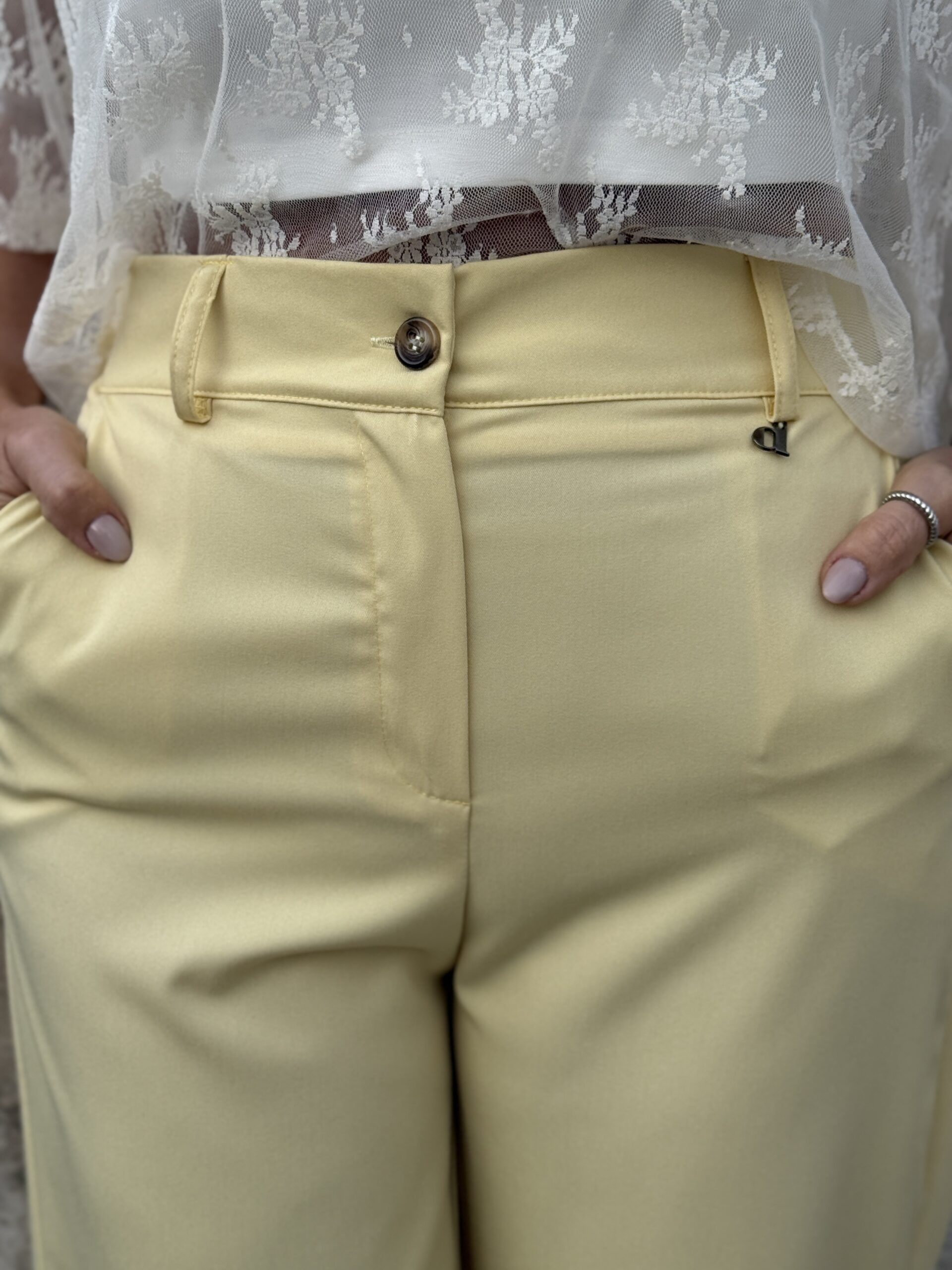 Pantalon fluide à la coupe élégante et moderne, déclin é dans un jaune pastel doux et lumineux.