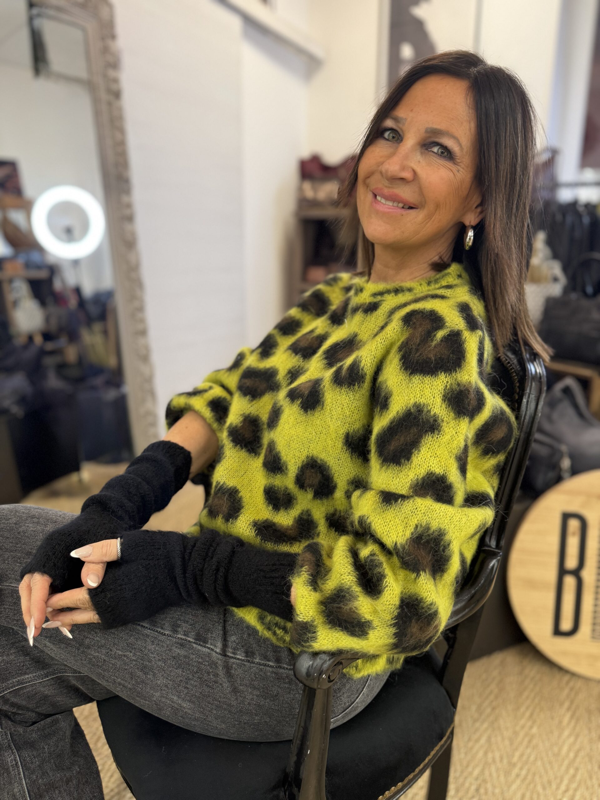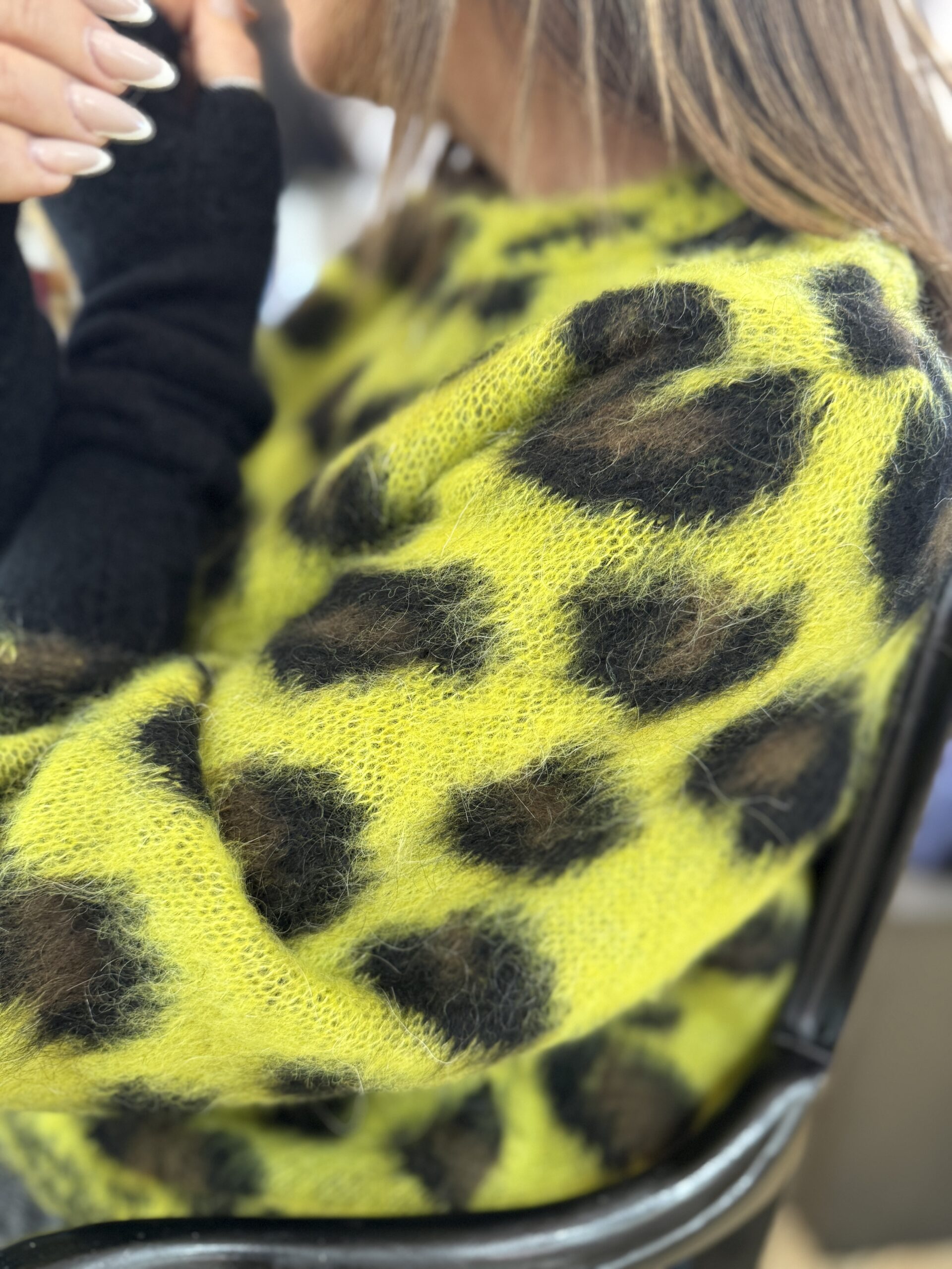 Plongez dans une allure audacieuse et ultra tendance avec ce pull mohair à motif léopard fluo.